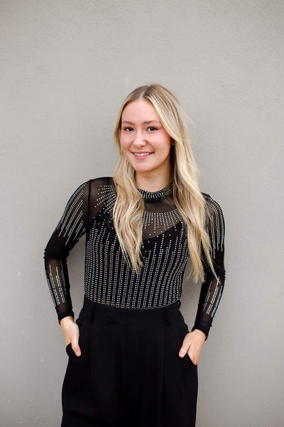 Rhinestone Round Neck Long Sleeve Bodysuit