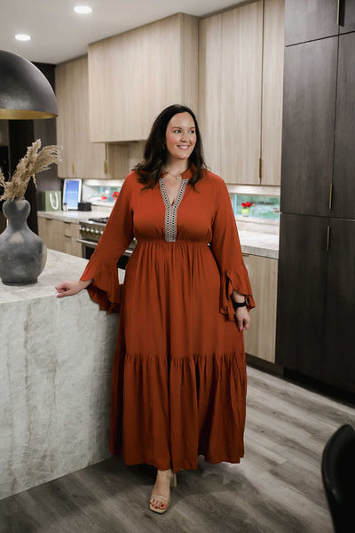 Plus Size Ruffled Notched Long Sleeve Midi Dress