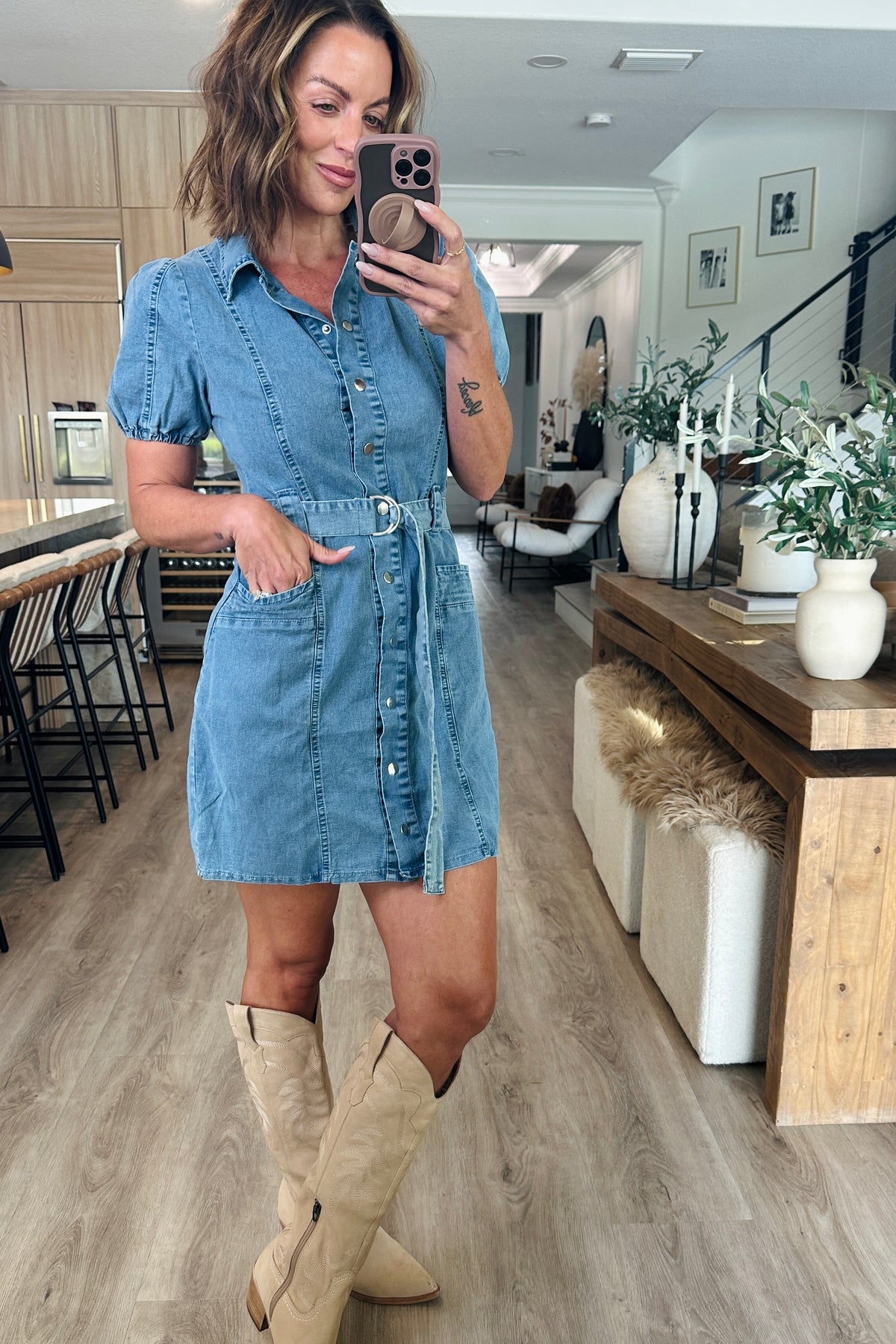 Chic, structured, and a little bit sassy, this denim shirt dress is your new go-to for effortless style. The puff sleeves bring a touch of drama, while the button-up front and matching belt keep it classic and flattering. Whether you're dressing it up with boots or keeping it casual with sneakers, this look is made to turn heads with zero effort. The model is in the small.