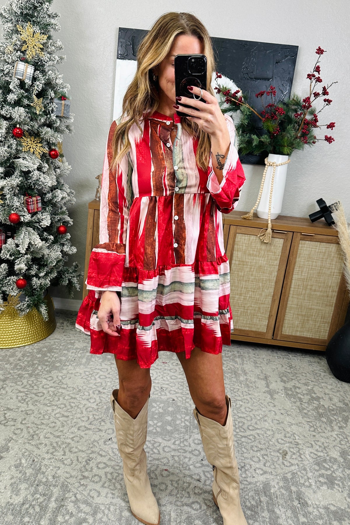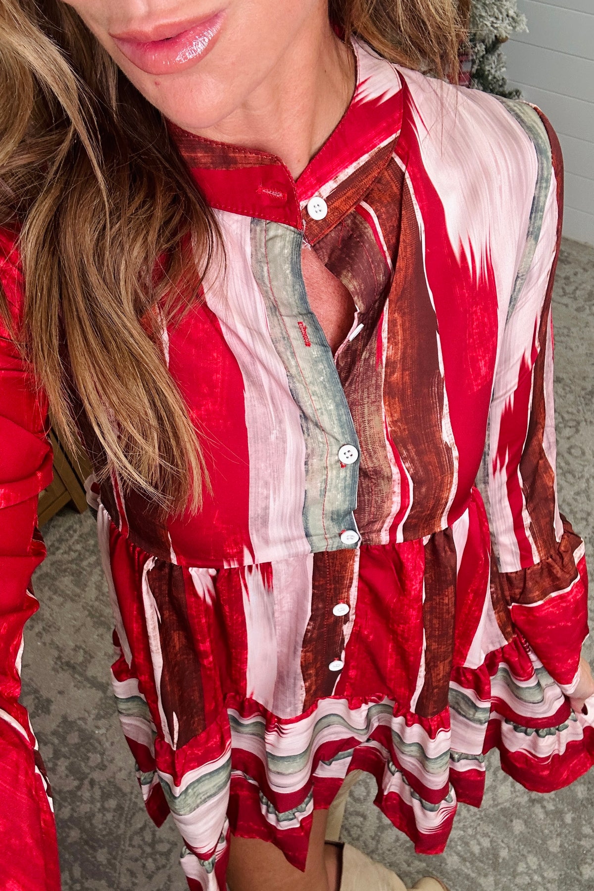Bring some buttoned-up fun to your wardrobe with this mini dress! The long sleeves add a touch of sophistication, while the button accents and stripes keep it playful. Dress it up or down for any occasion. Button up (or down) and get ready to turn heads! The model is in the small deep rose.