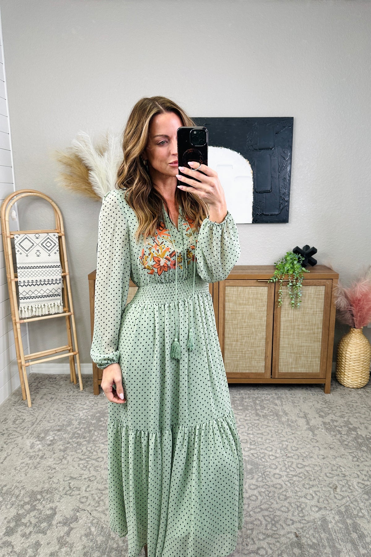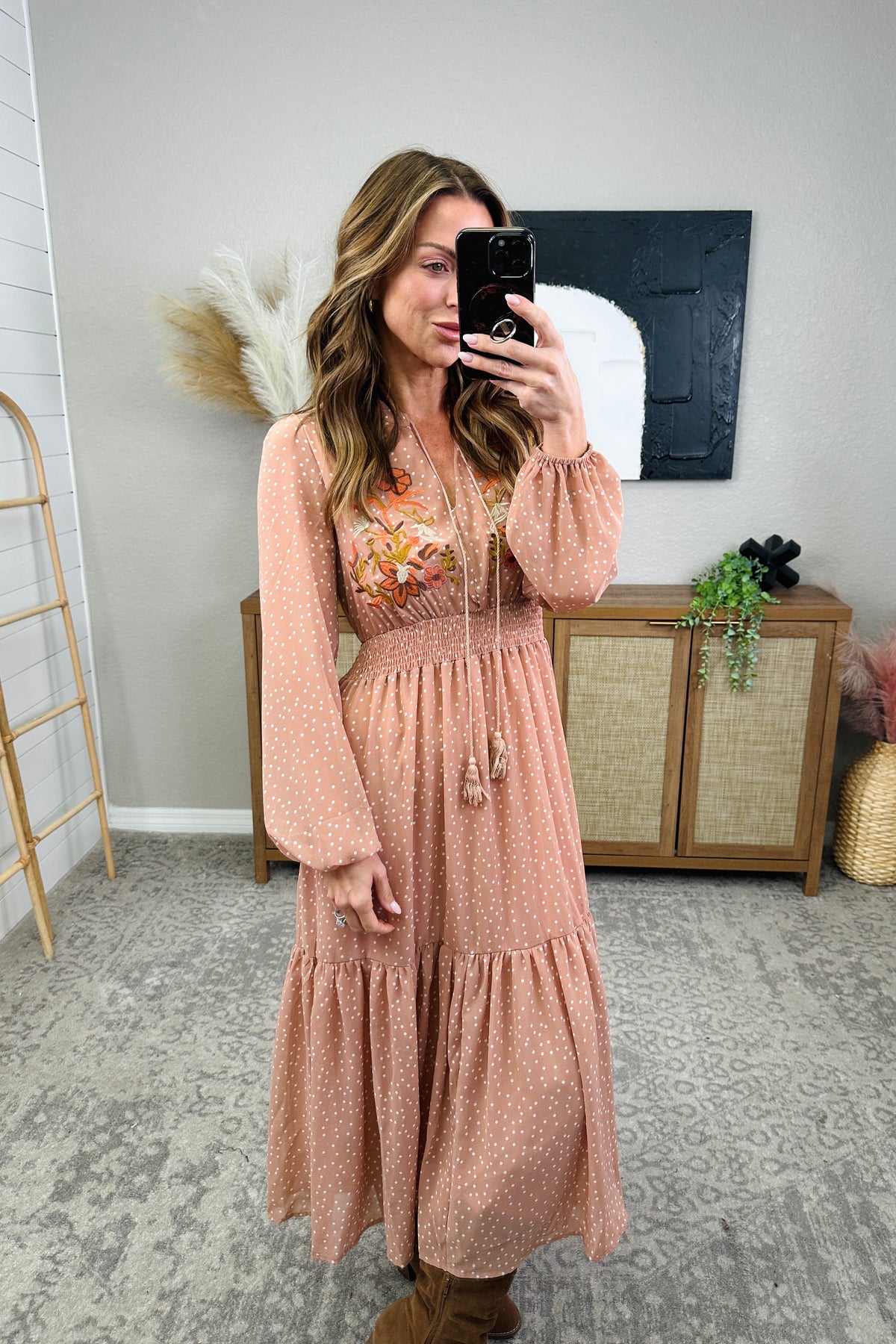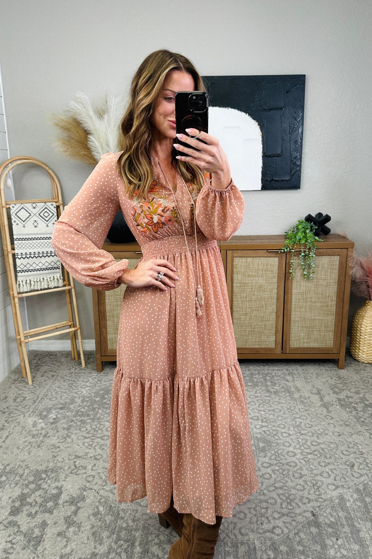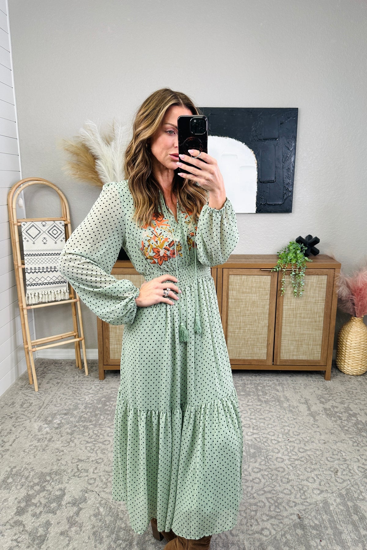 Step out in style with our playful and chic Embroidered Polka Dot Tie Neck Midi Dress. The long sleeve design and tie neck accent add a touch of sophistication, while the embroidered polka dot pattern adds a fun twist. Perfect for any occasion, this dress will have you turning heads and feeling confident all day (and night) long. The model is in the small.