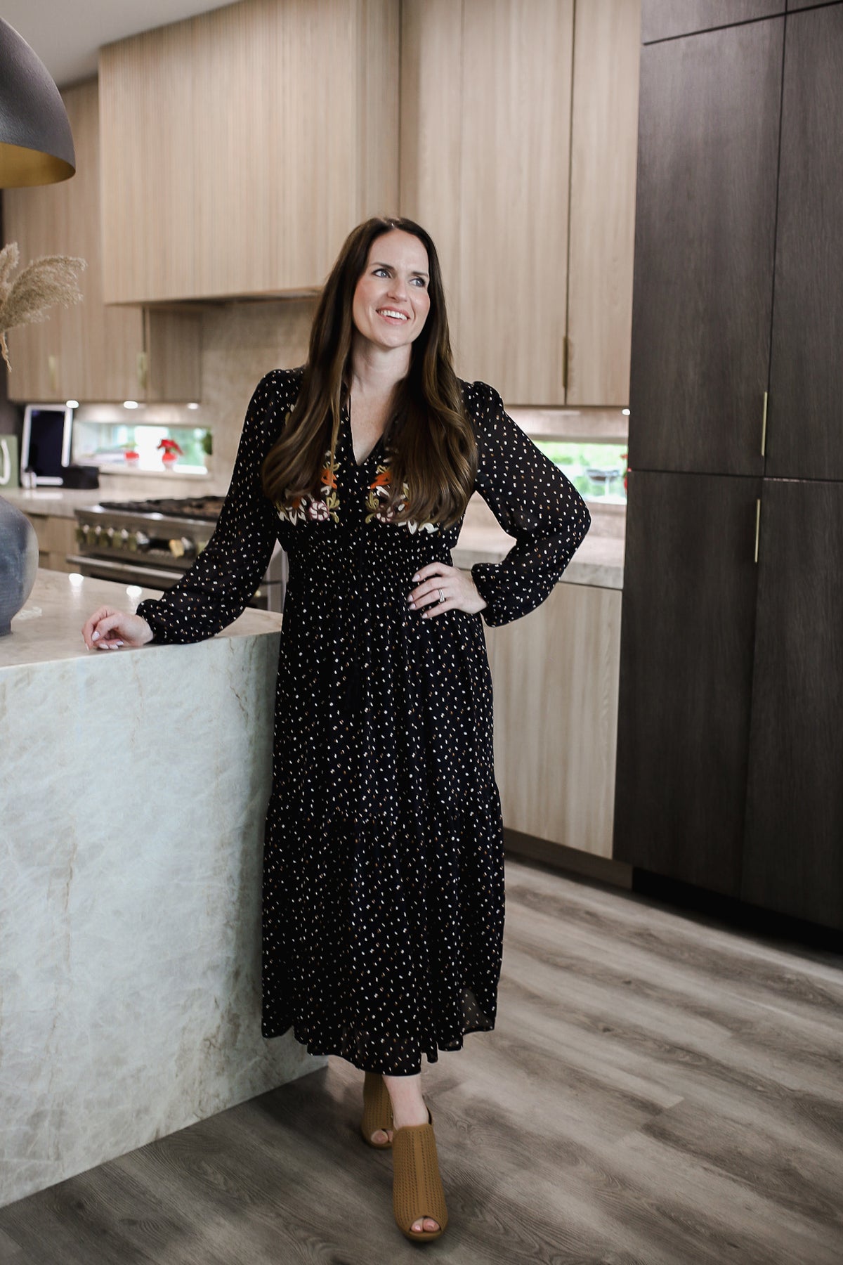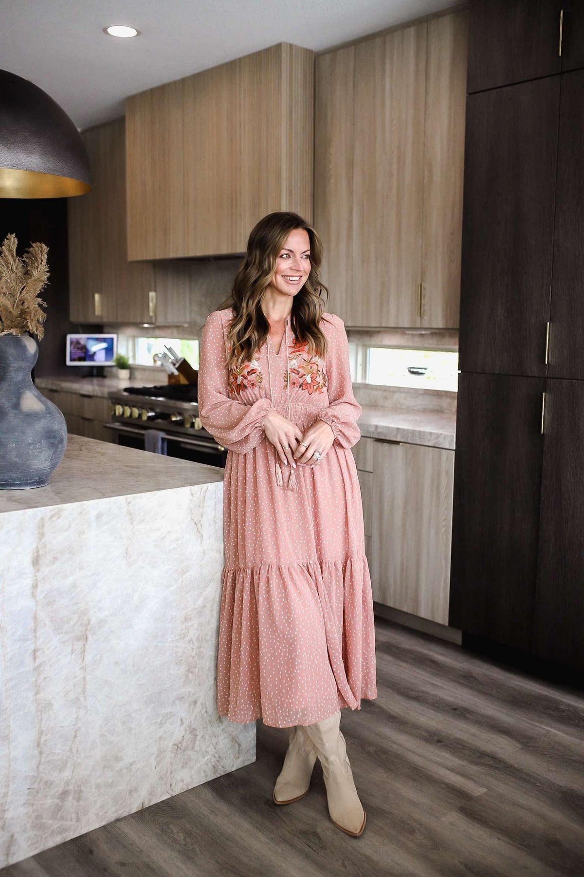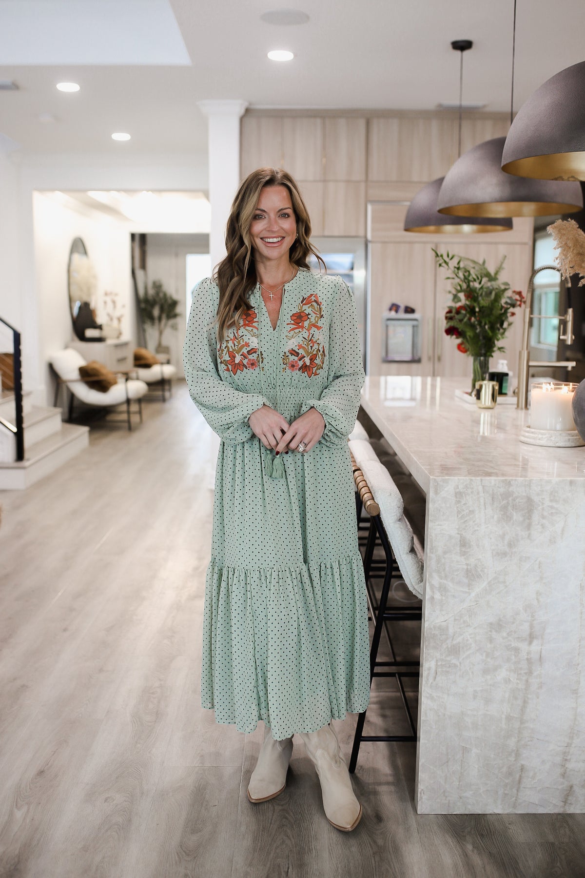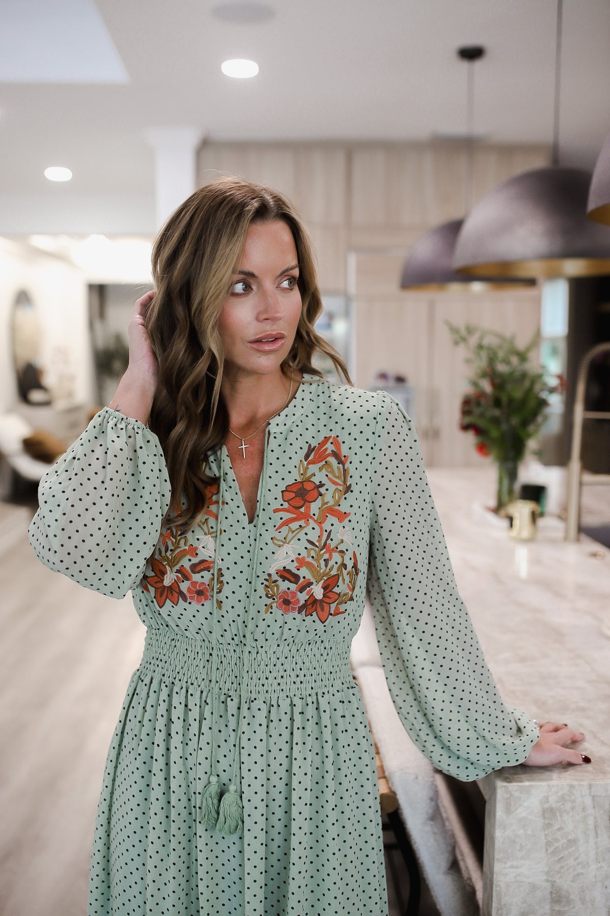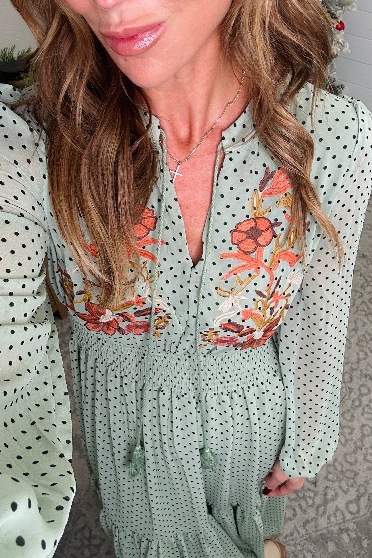 Step out in style with our playful and chic Embroidered Polka Dot Tie Neck Midi Dress. The long sleeve design and tie neck accent add a touch of sophistication, while the embroidered polka dot pattern adds a fun twist. Perfect for any occasion, this dress will have you turning heads and feeling confident all day (and night) long. The model is in the small.
