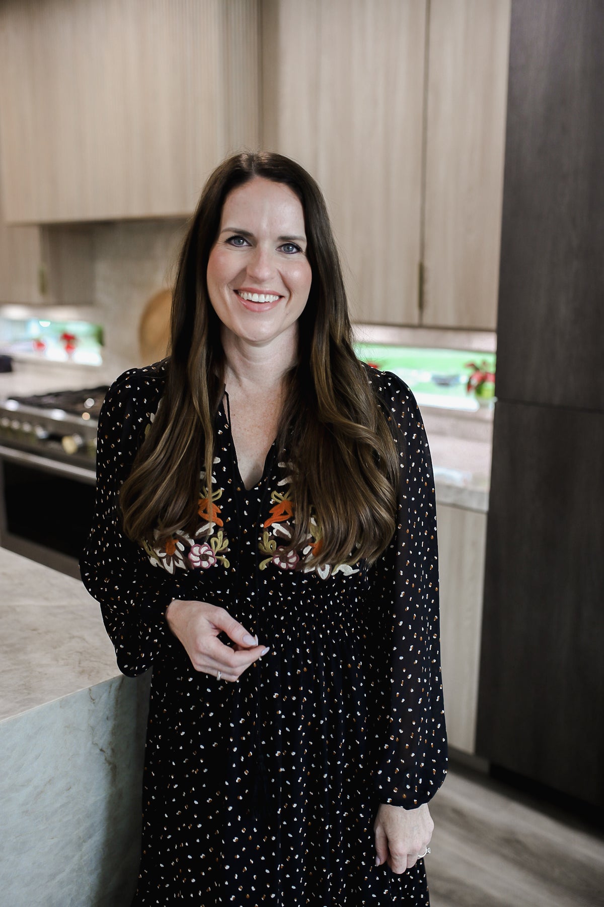 Embroidered Polka Dot Tie Neck Long Sleeve Midi Dress