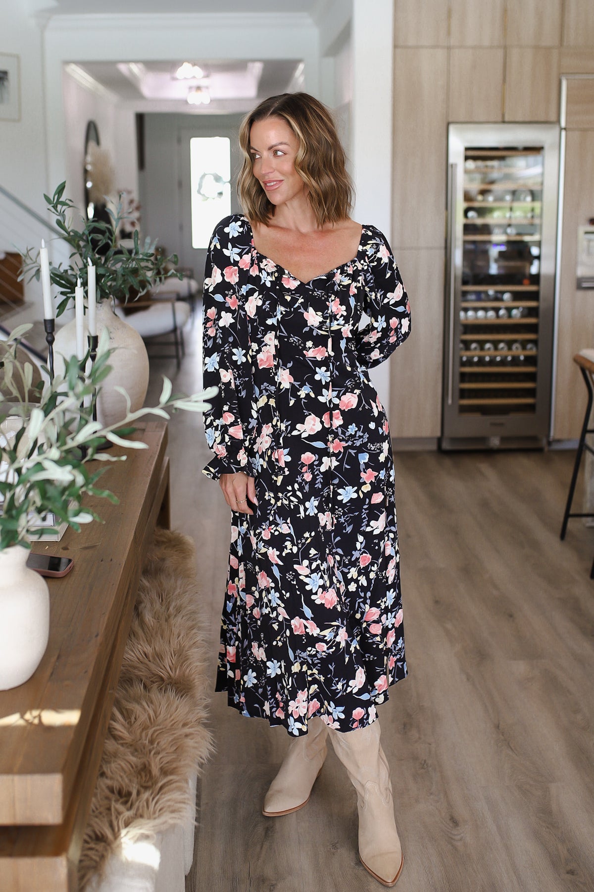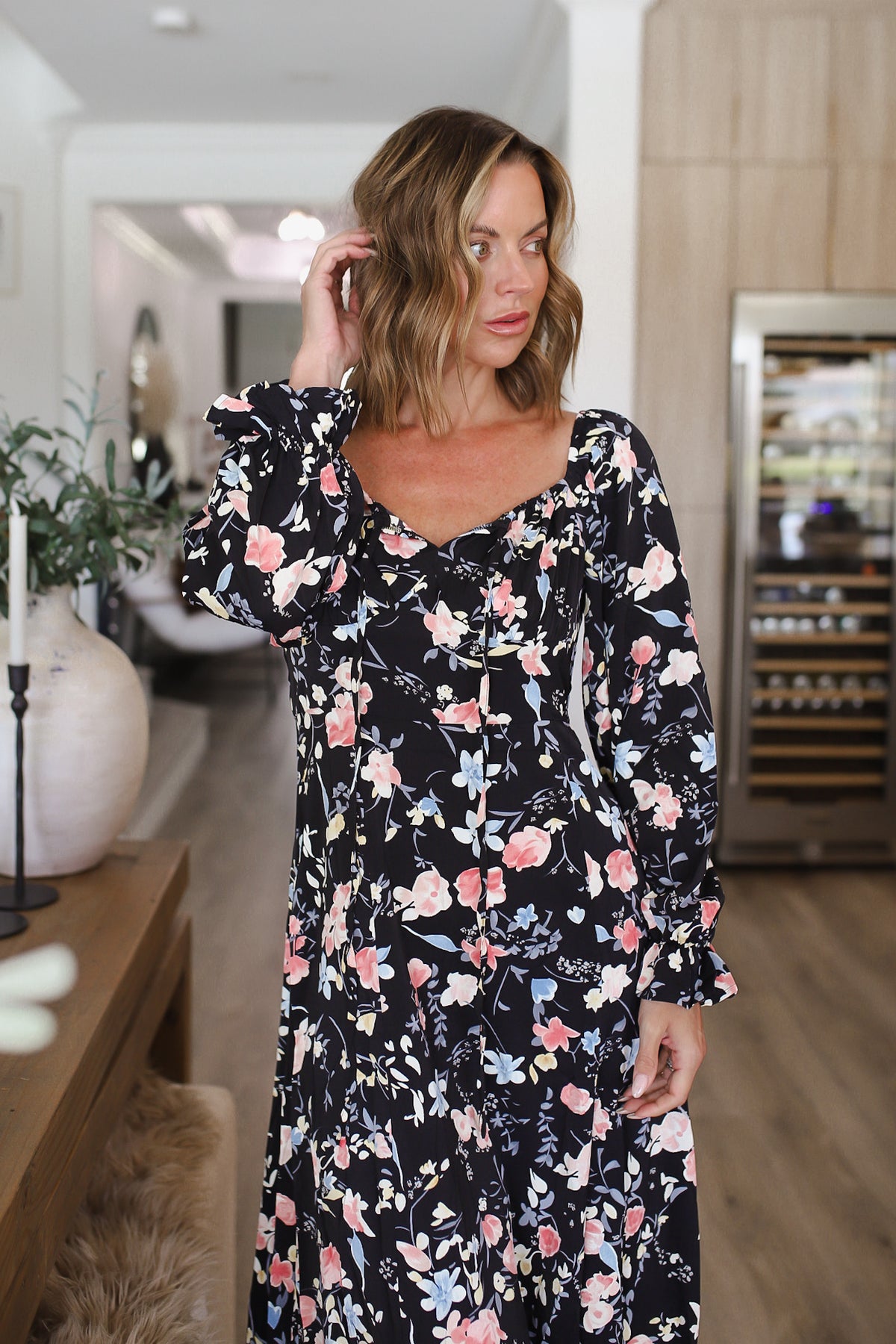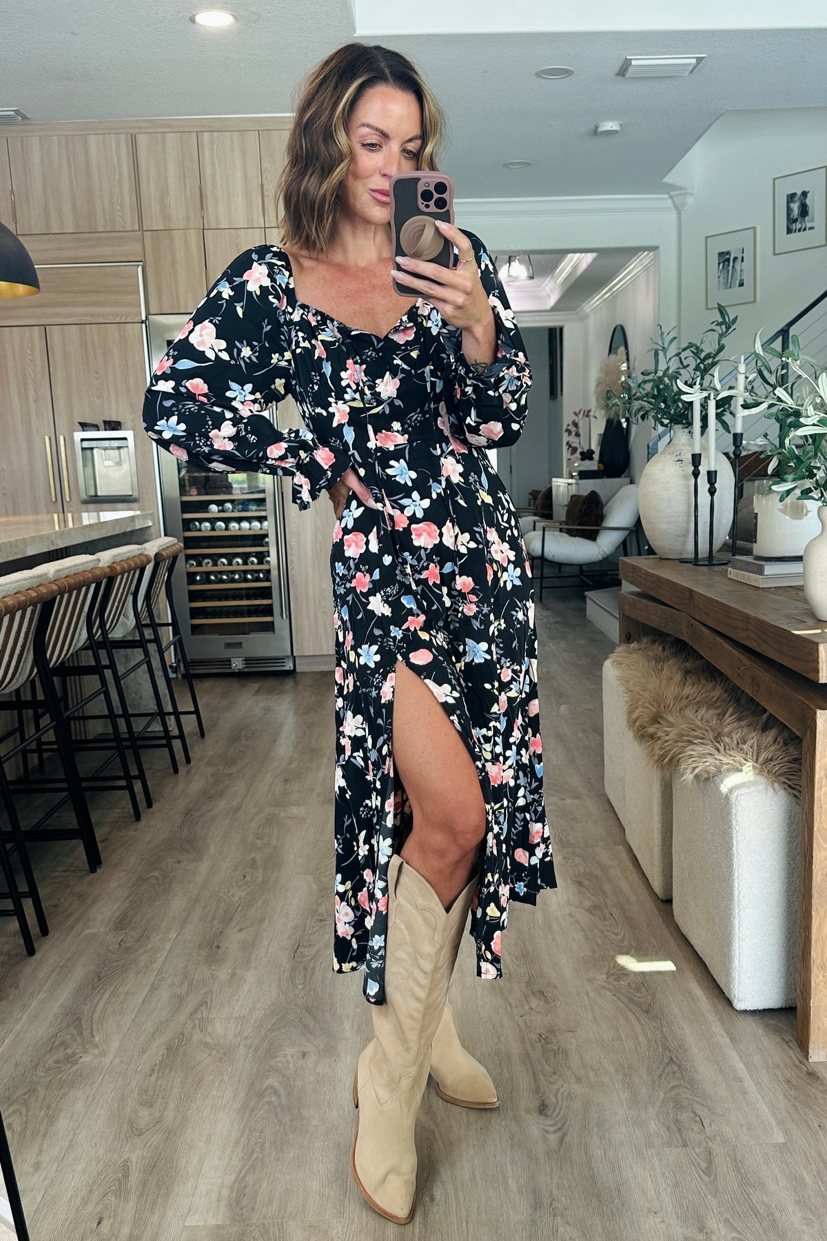 Say hello to effortless elegance with this floral midi dress. The flounce sleeves add a playful, romantic touch, while the flowy midi length keeps things chic and breezy. Covered in a dreamy floral print, it’s perfect for garden parties, brunch dates, or anytime you want to feel pretty without even trying. Just add sandals and a smile, you're ready to go! The model is in the small.