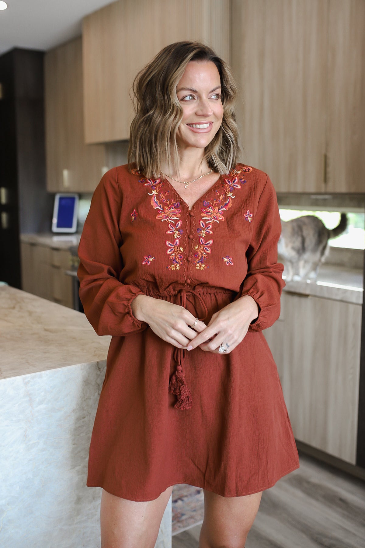 Feminine and timeless, this mini dress features delicate floral embroidery that adds charm and detail to every stitch. The long sleeves balance the playful length, while the flattering fit makes it perfect for brunch, date nights, or special occasions. Pair it with boots for a chic fall vibe or heels for a dressier look. The model is in the small.