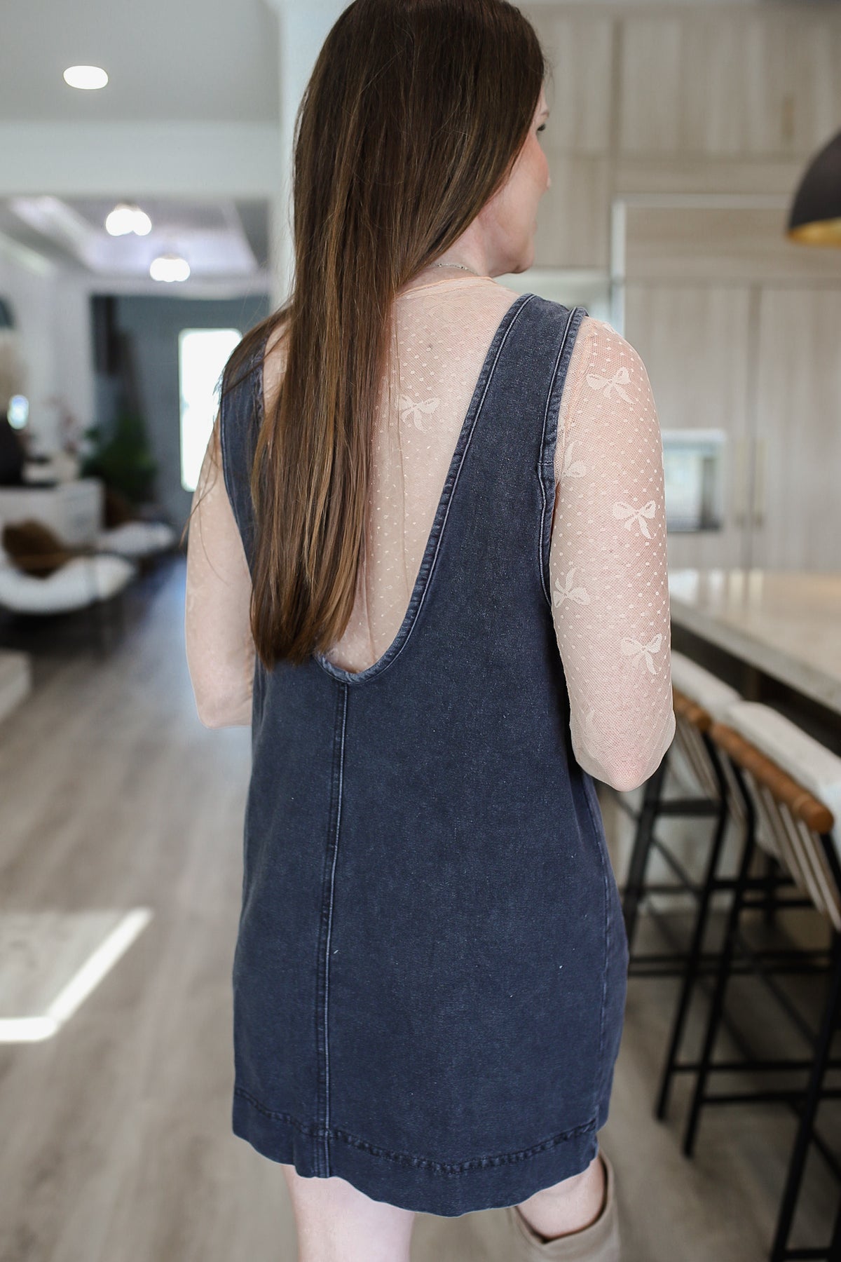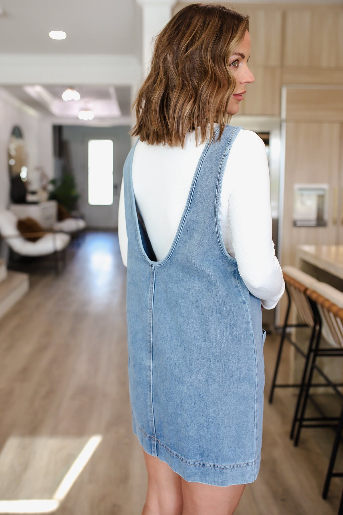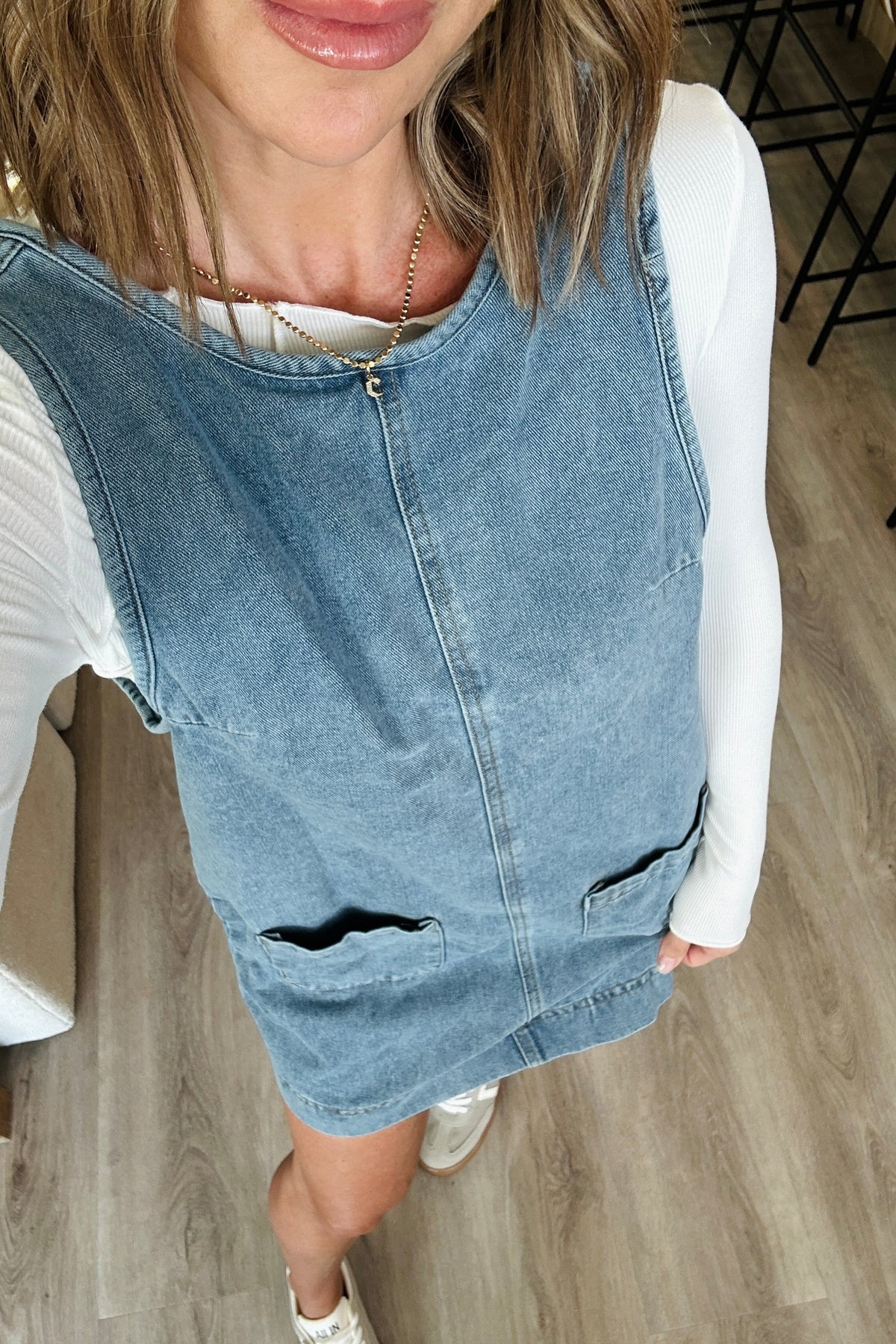 Effortlessly cool and timelessly versatile, this Round Neck Denim Overall Dress is a wardrobe essential. Crafted from soft, durable denim, it features a flattering round neckline and adjustable shoulder straps for the perfect fit. The relaxed A-line silhouette makes it easy to layer over your favorite tees, blouses, or lightweight sweaters, creating endless outfit possibilities. Complete with functional front pockets, this dress combines style and practicality, making it perfect for casual days, weekend adventures, or layering for a cozy fall look. The model is in the small.
