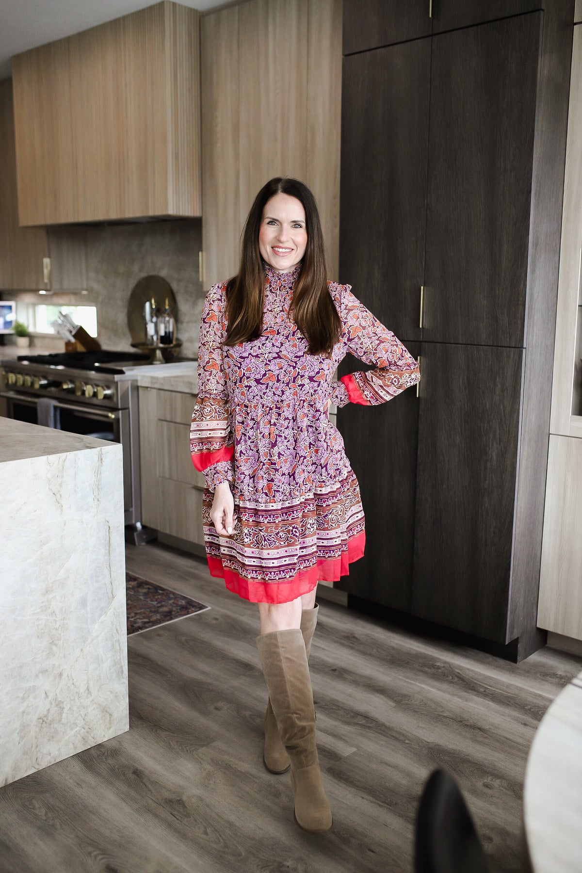 Get ready to turn heads with our playful Smocked Floral Turtleneck Long Sleeve Dress. The smocked detailing adds a unique touch of texture while the turtleneck and long sleeves keep you warm and stylish. Perfect for any occasion, this dress will have you feeling confident and chic. The model is in the medium.