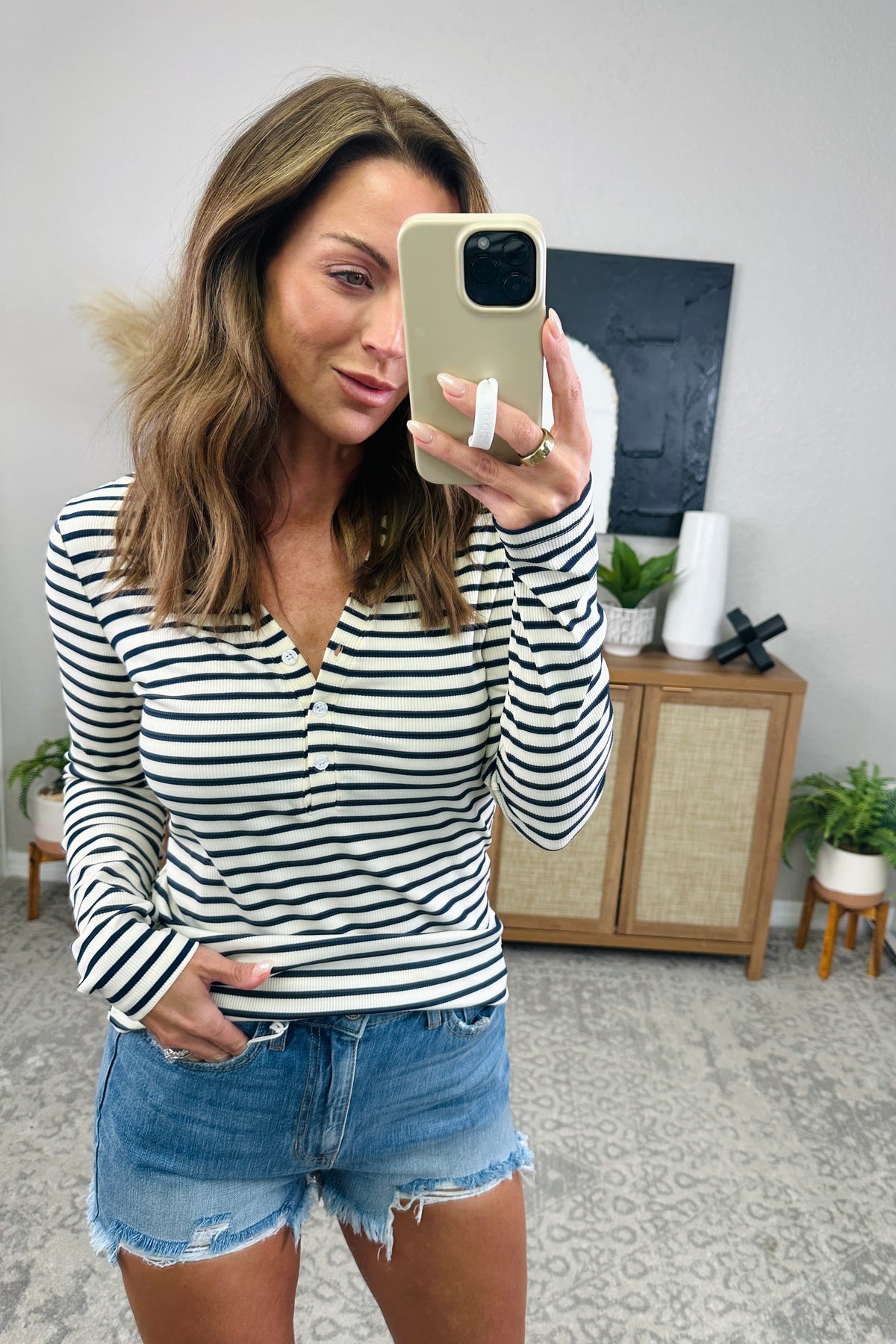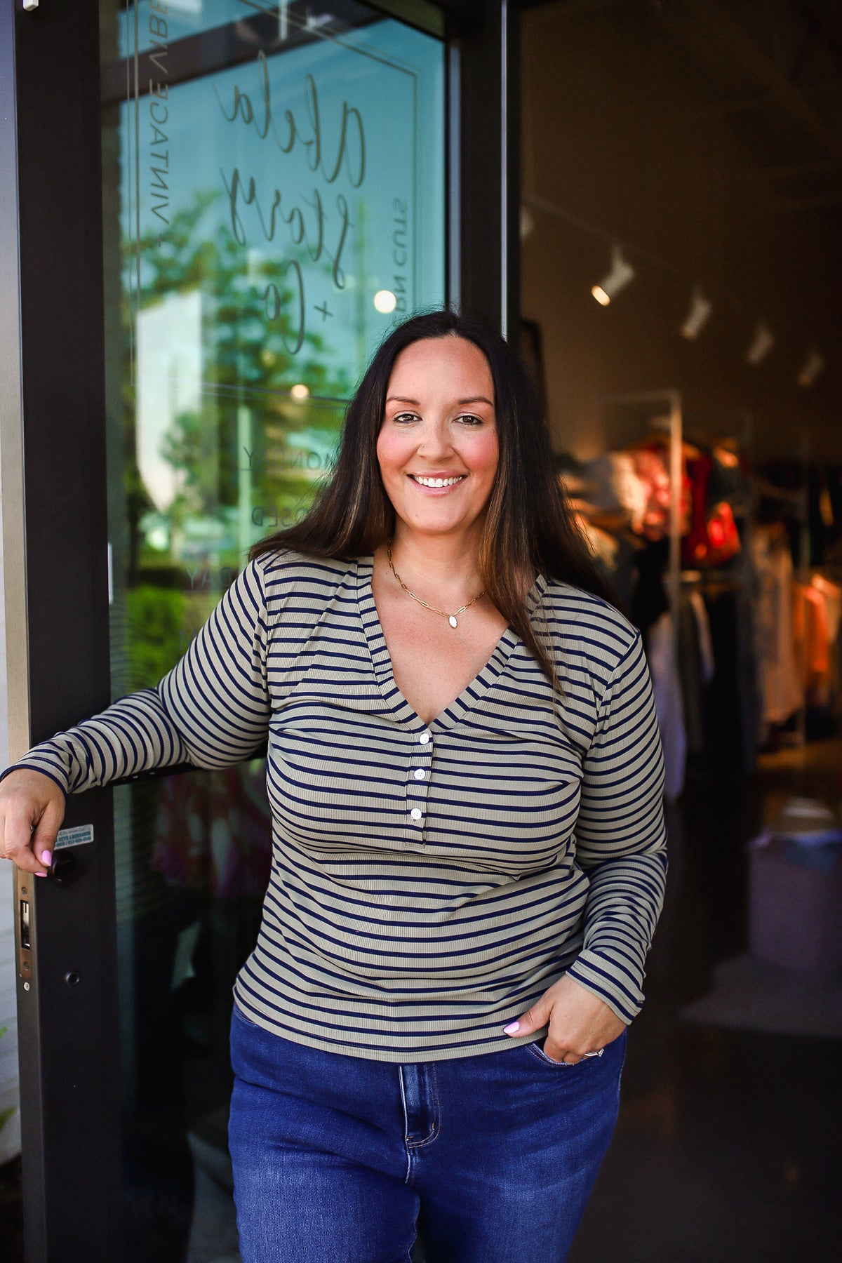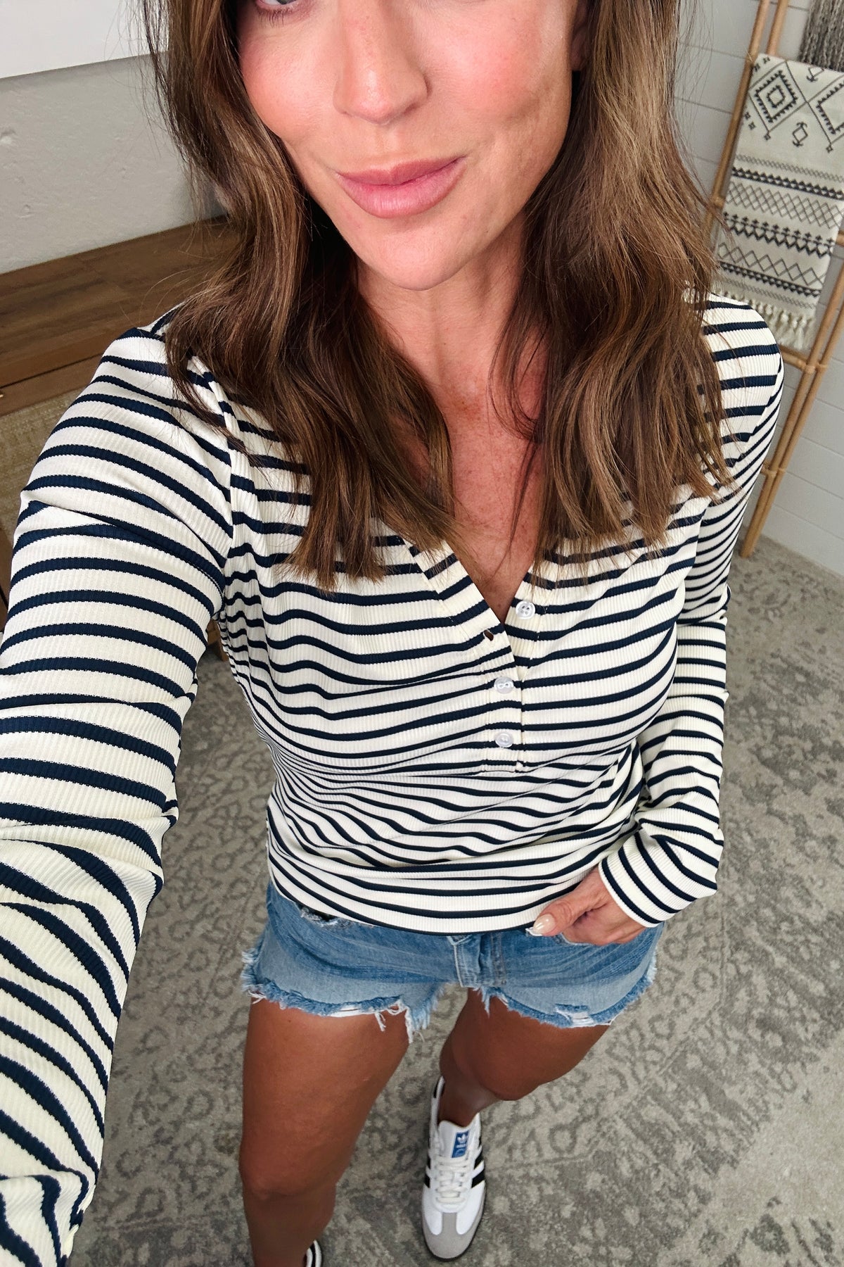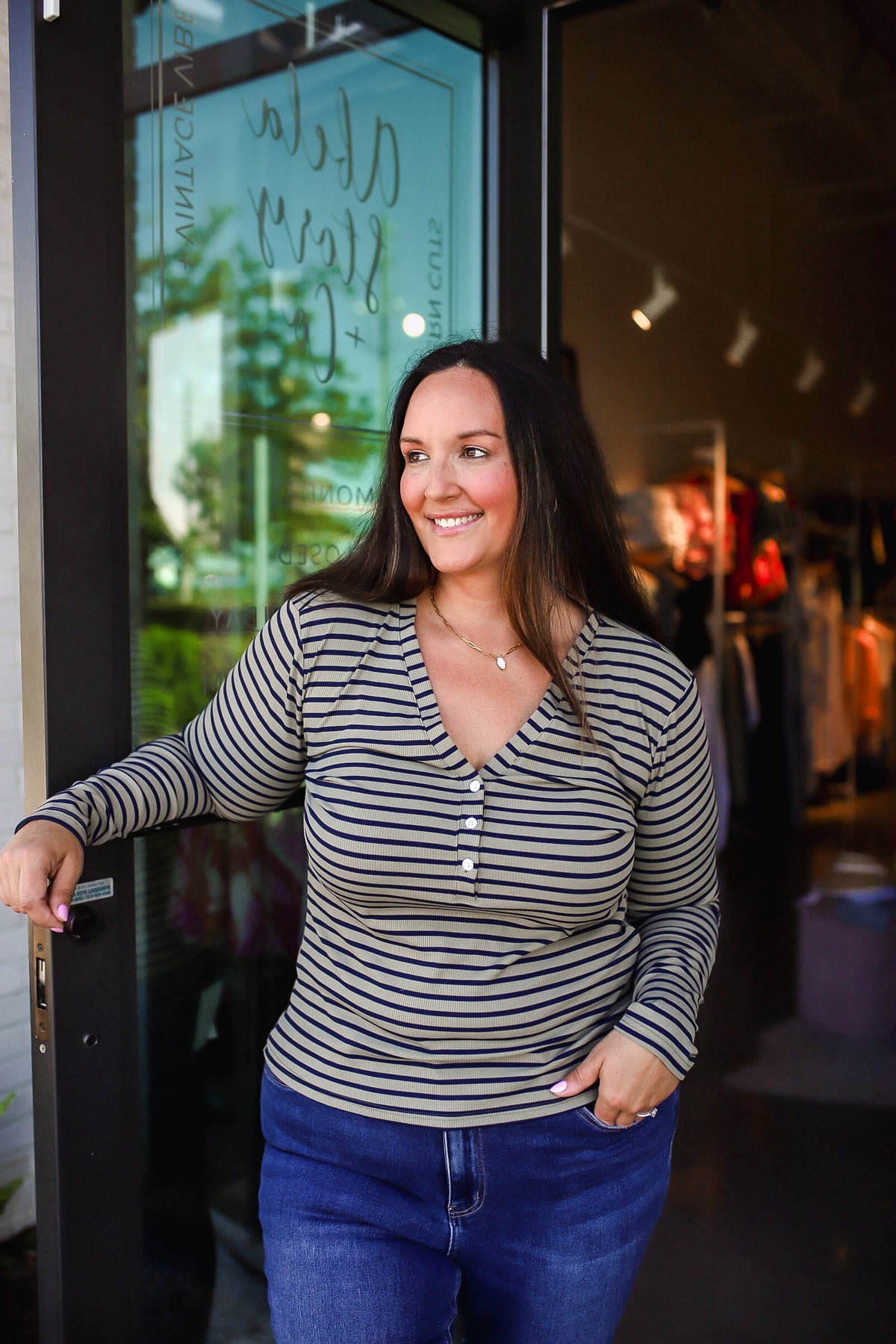 Introducing the Striped V-Neck Long Sleeve Top - perfect for adding a touch of playfulness to your wardrobe. Featuring a trendy striped pattern and a flattering v-neckline, you'll be looking stylish and feeling comfortable all day. Pair it with your favorite jeans for a laid-back, yet quirky look. The model is in the medium.