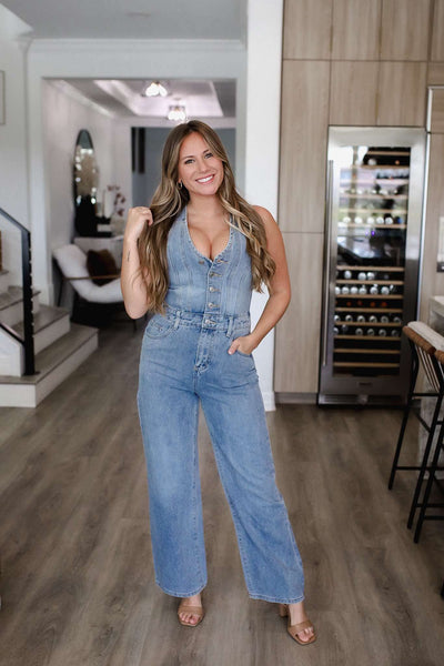 V-neck Wide Leg Denim Jumpsuit