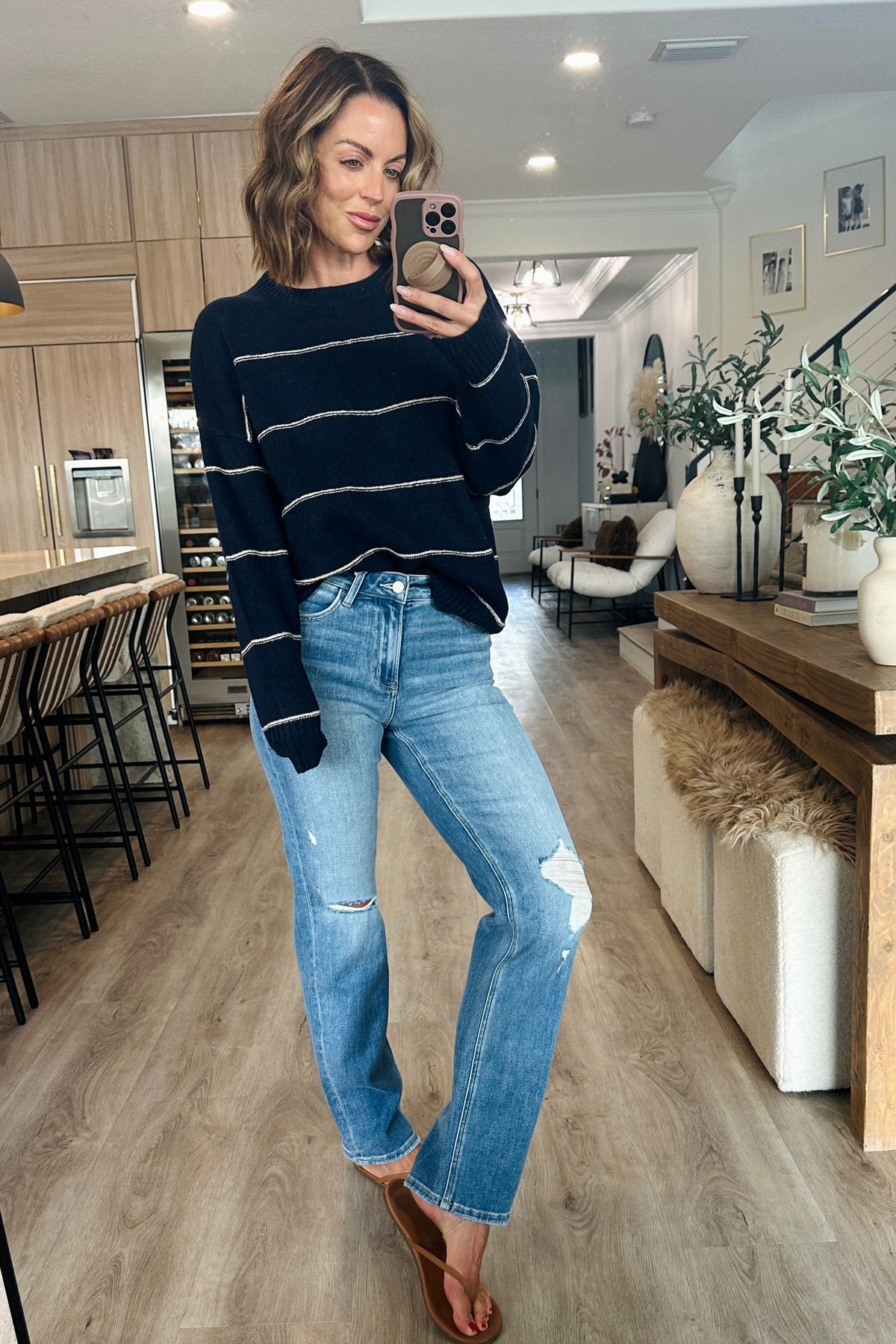 The model is a 4, wearing the 3. You can size down one from your even size. Paired with Find My Zen Contrast Ruffle Sleeve Sweater Top, Relaxed Rhythm Collared Button Front Top - Navy, Sweater is currently sold out.