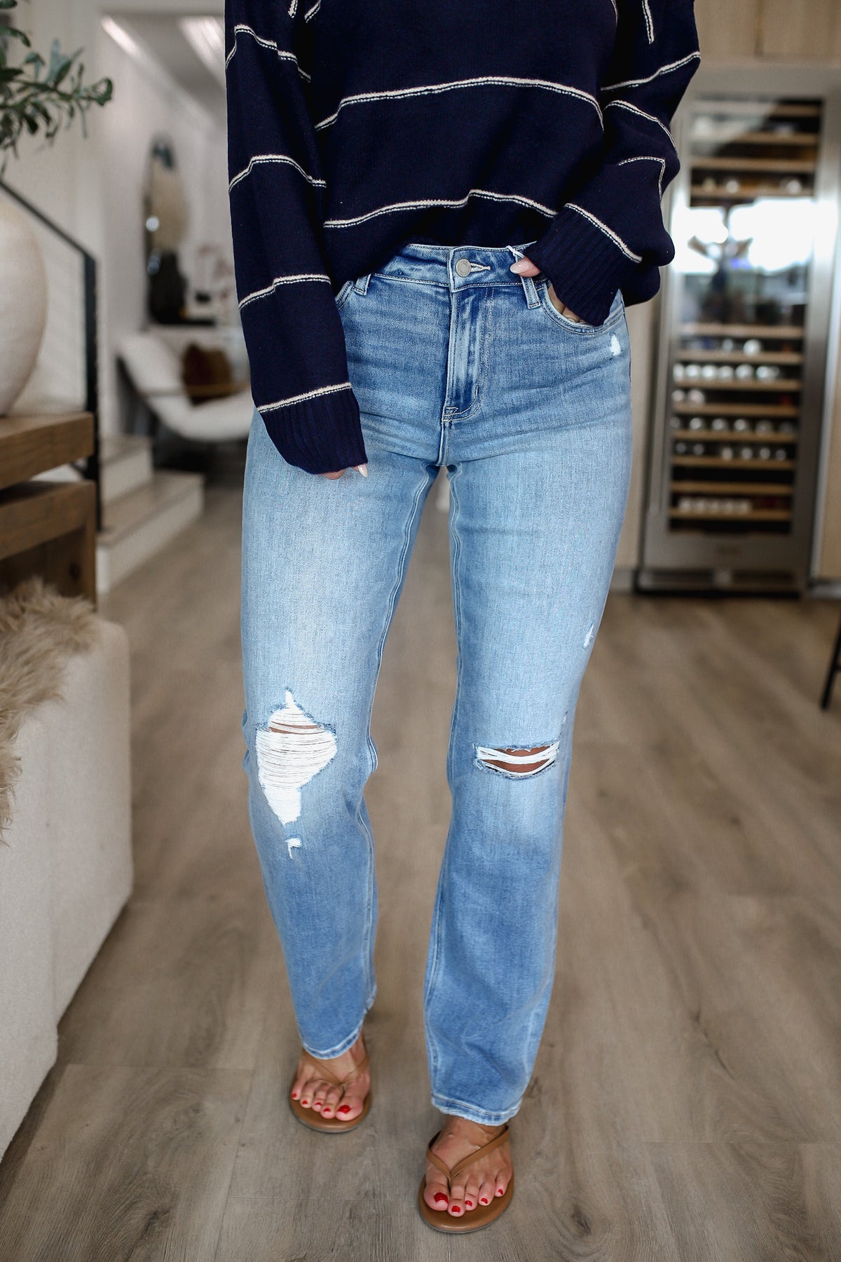 Comfort stretch denim, distressed detail, finished hem, full length, straight leg jeans