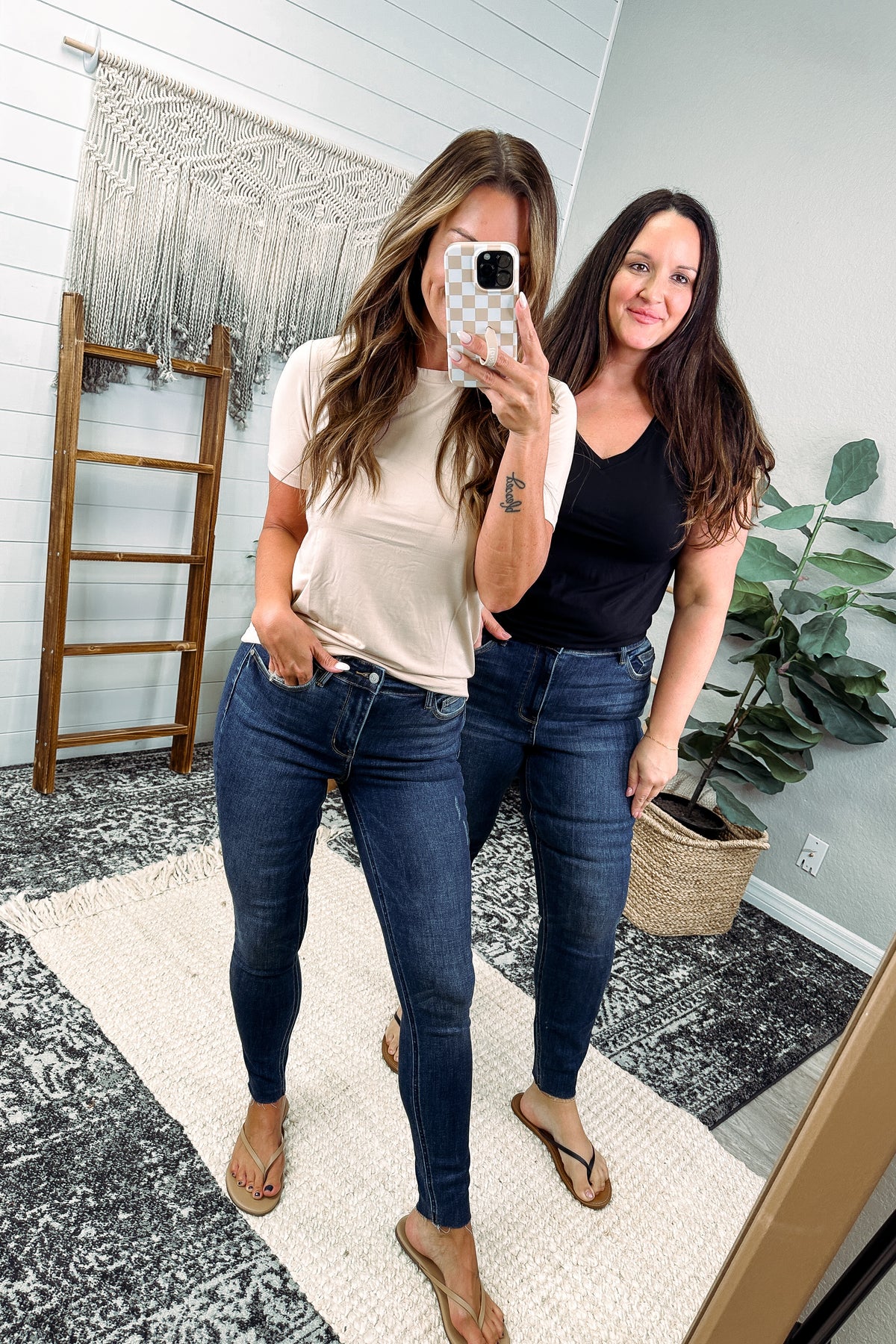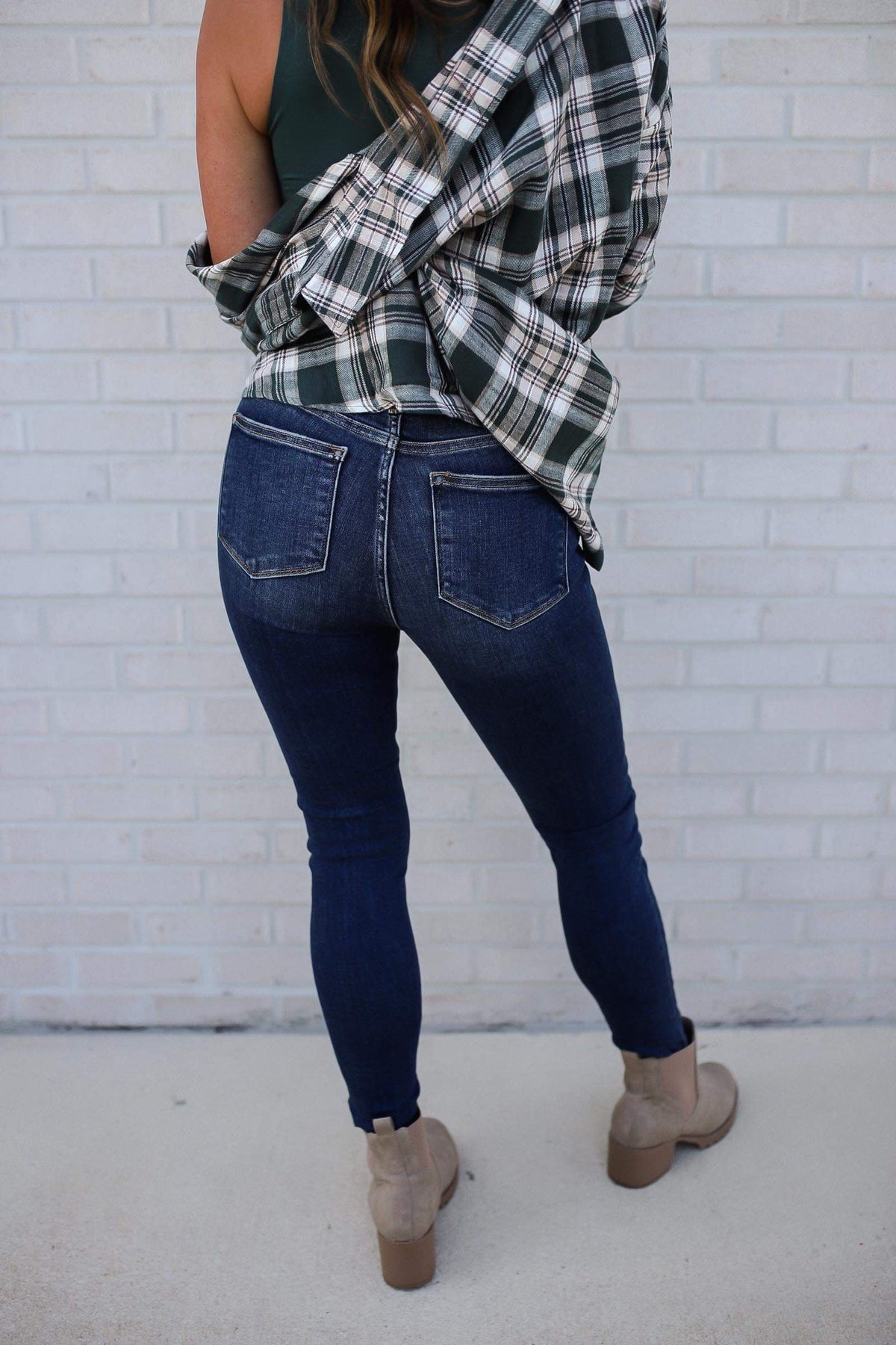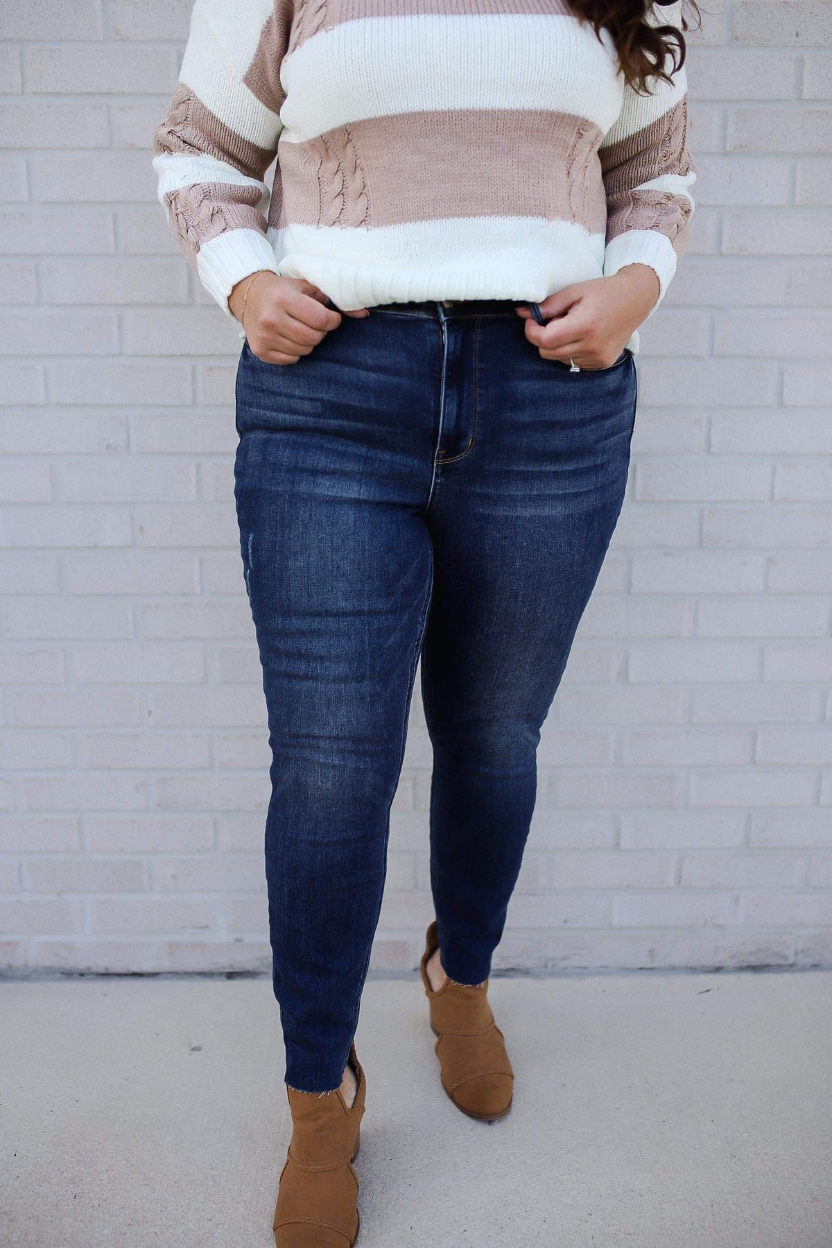 Discover classic style and gorgeous comfort with Lydia Skinny Jeans from Judy Blue! The perfect mid-rise fit hugs your curves in all the right places, while the dark vintage wash and raw hem add a subtle touch of edge. Plus, the 4-way stretch fabric ensures the perfect fit all day long. Your newest wardrobe staple awaits! The model is in the 5, the model is in the 16. Paired with Fall Forecast and Laurel tank.