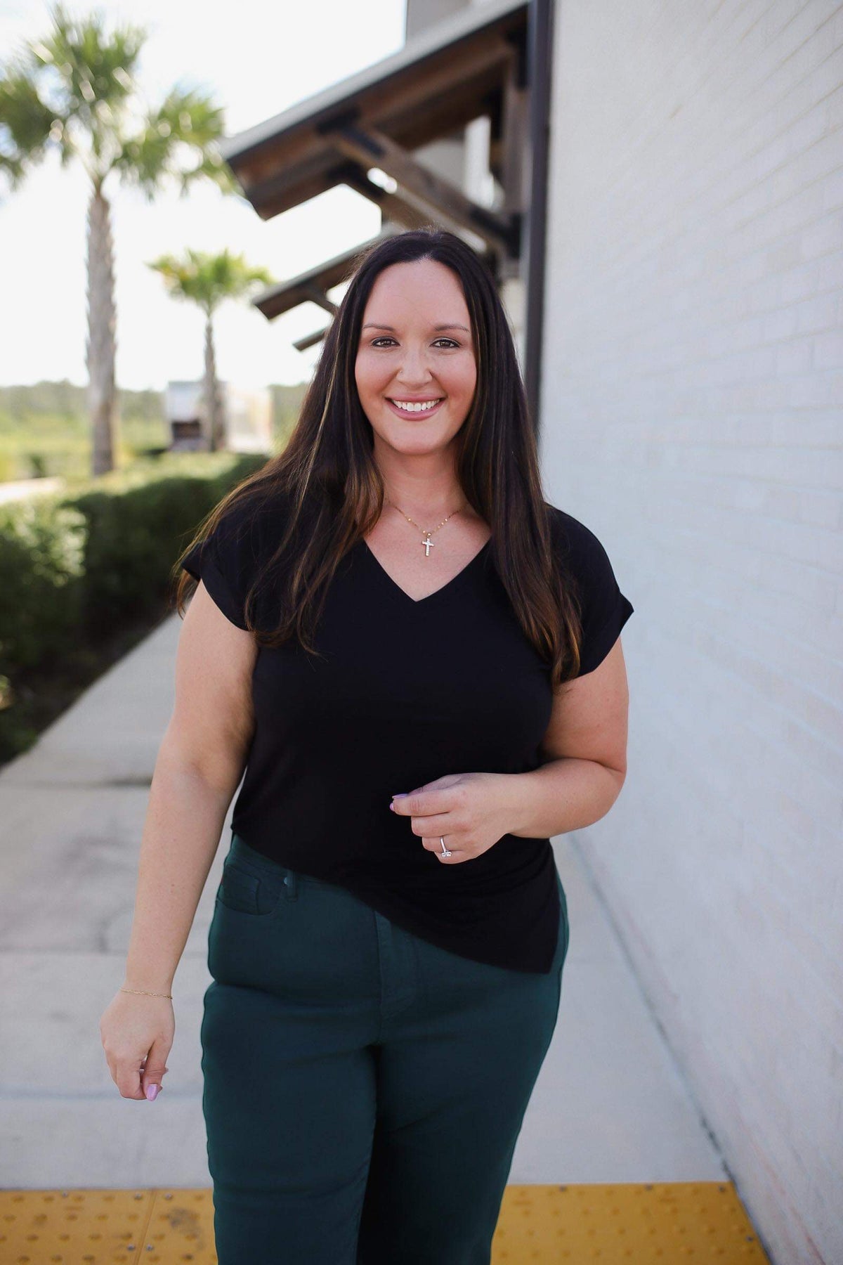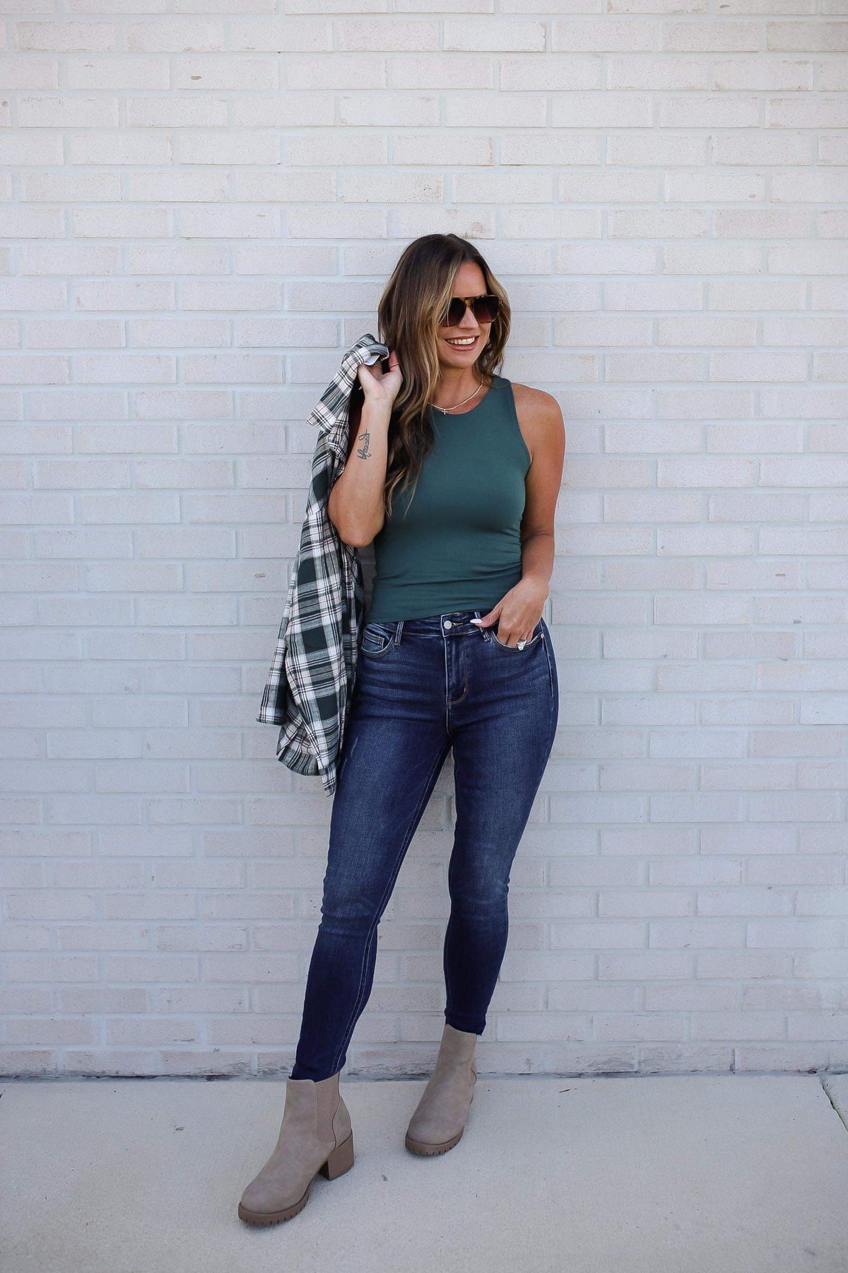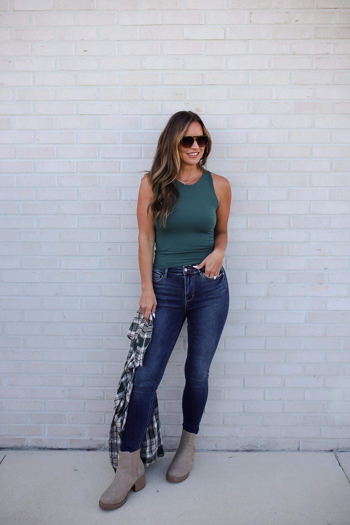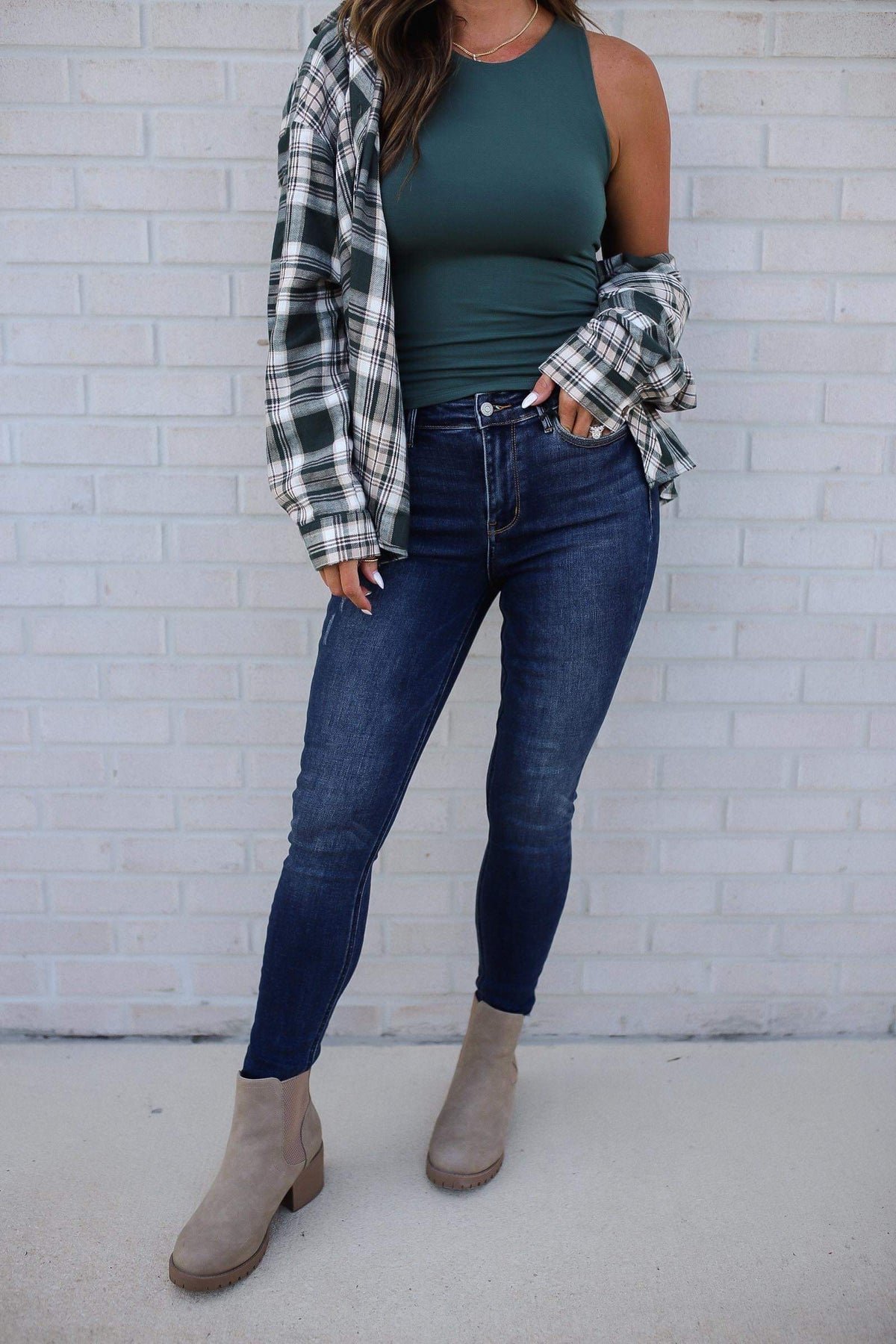 Discover classic style and gorgeous comfort with Lydia Skinny Jeans from Judy Blue! The perfect mid-rise fit hugs your curves in all the right places, while the dark vintage wash and raw hem add a subtle touch of edge. Plus, the 4-way stretch fabric ensures the perfect fit all day long. Your newest wardrobe staple awaits! The model is in the 5, the model is in the 16. Paired with Fall Forecast and Laurel tank.