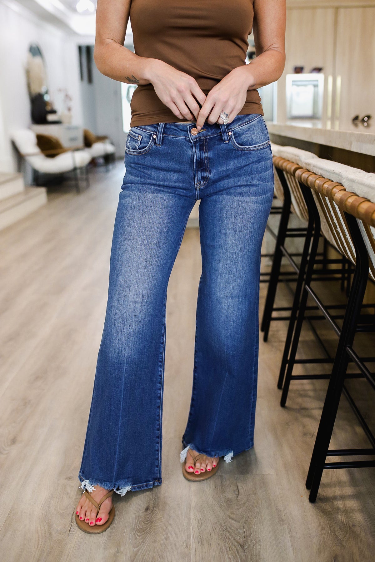 These premium wide-leg flare jeans feature a flattering high-rise waist and contemporary distressed details. Made from high-quality cotton blend denim with just the right amount of stretch for comfort. The medium wash creates a versatile look while the raw hem adds modern edge. The flared silhouette elongates the legs while maintaining a comfortable fit throughout. Perfect for casual to semi-formal occasions, these jeans combine classic styling with modern trends. The model is in the 3. You can size down one from your even size.
