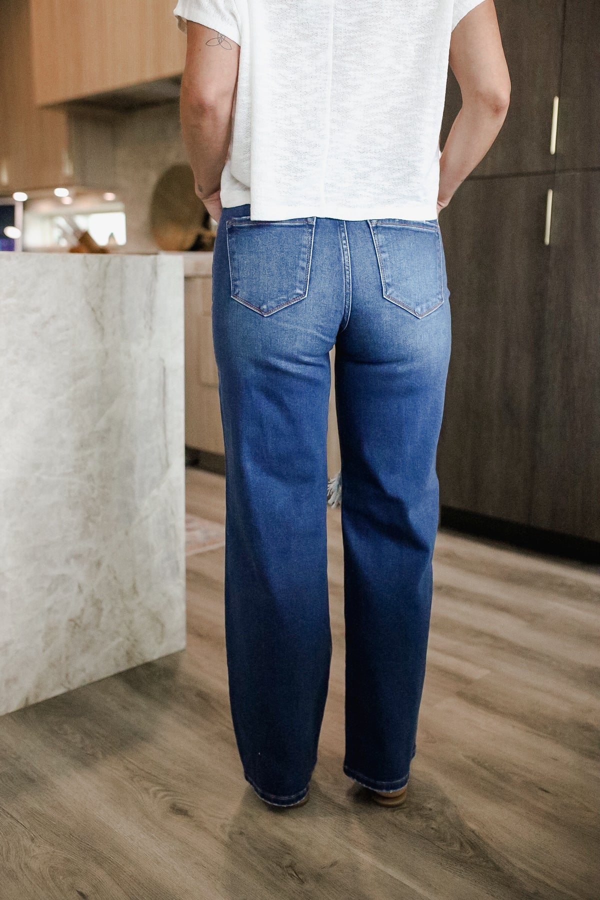 These premium high-rise straight leg jeans feature on-trend distressed knee rips that add an edgy, contemporary touch to your wardrobe. Crafted from high-quality stretch denim in a versatile medium blue wash, they offer both comfort and style. The high-rise waistband provides a flattering fit while the straight leg cut creates a timeless silhouette. The strategic knee distressing and raw hem details give these jeans a perfectly lived-in look. Made with a cotton-polyester-spandex blend for optimal stretch and recovery, ensuring all-day comfort without compromising shape retention. The model is a size 4 wearing the 3. You can size down one from your even size.