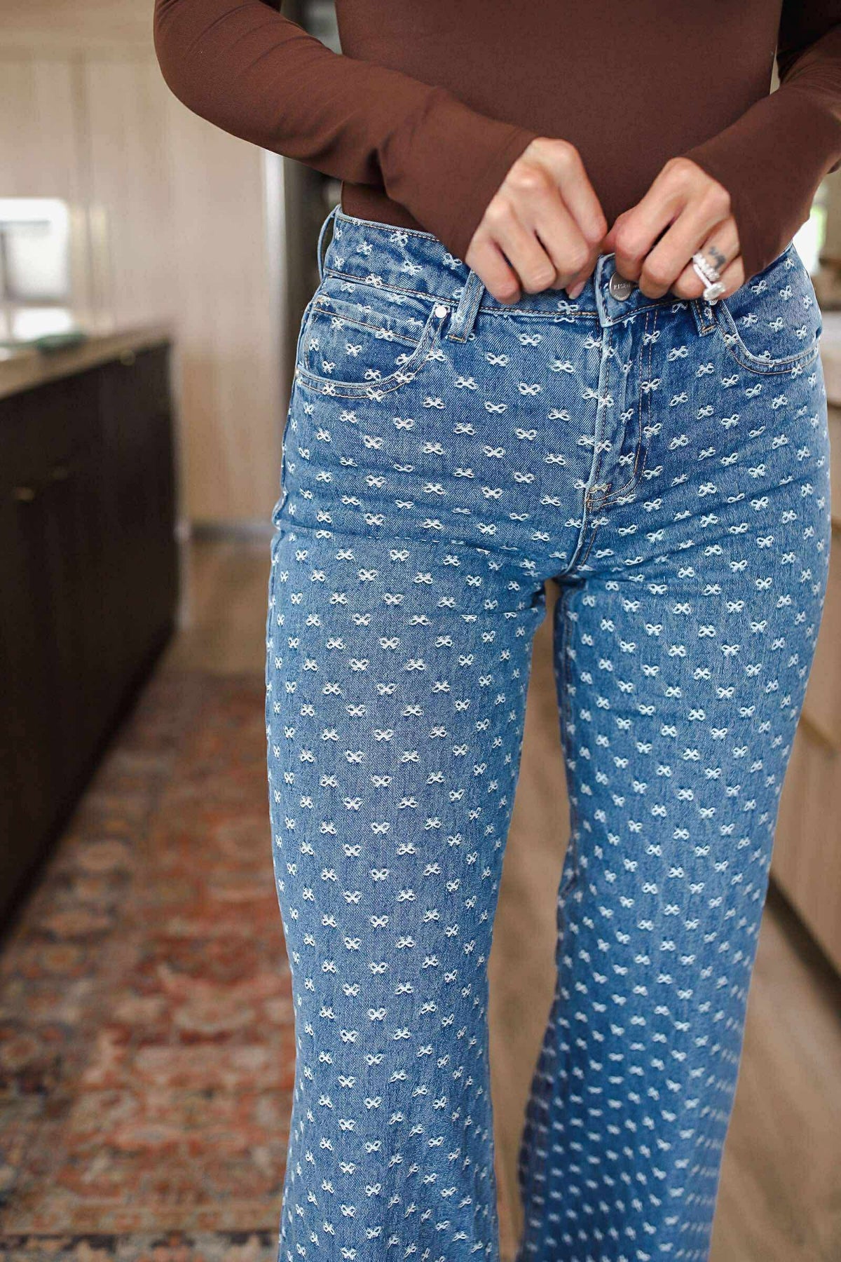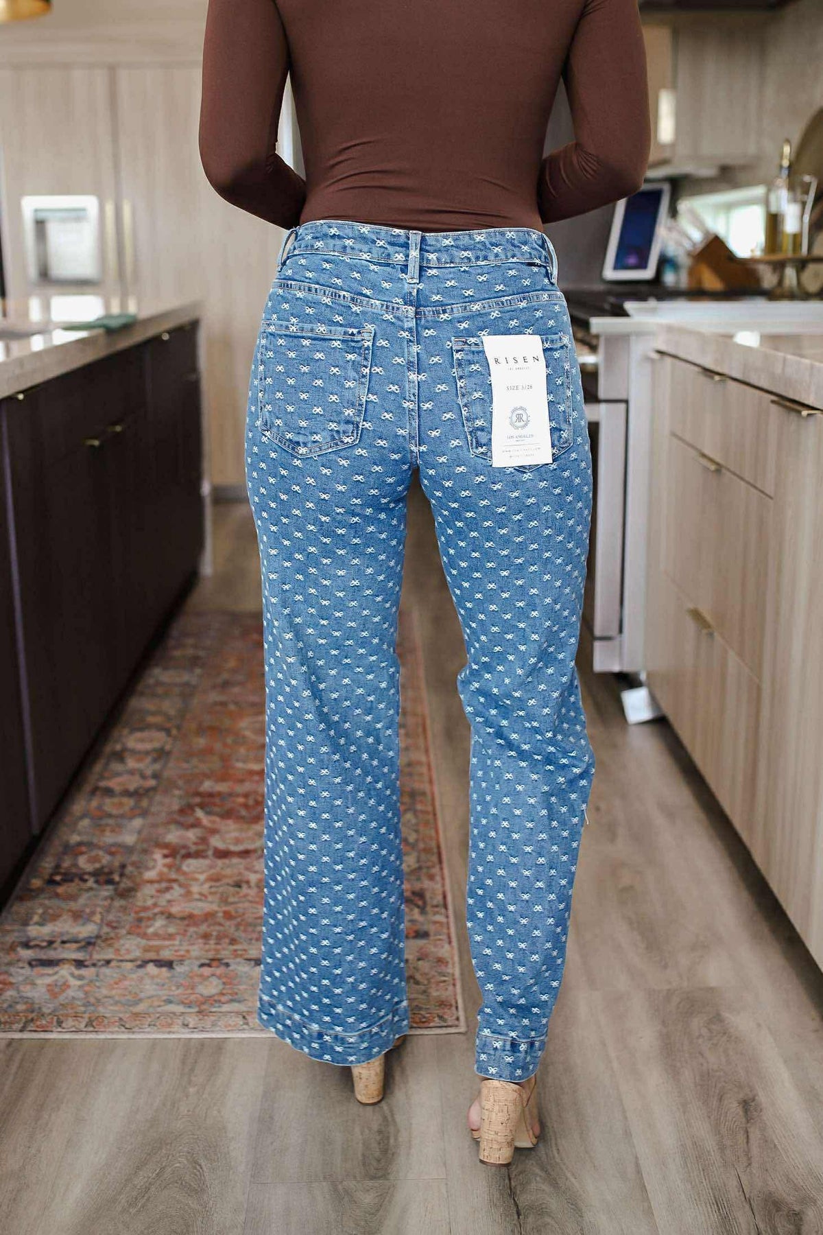 RISEN High Rise Wide Leg Bow Embroidered Jeans