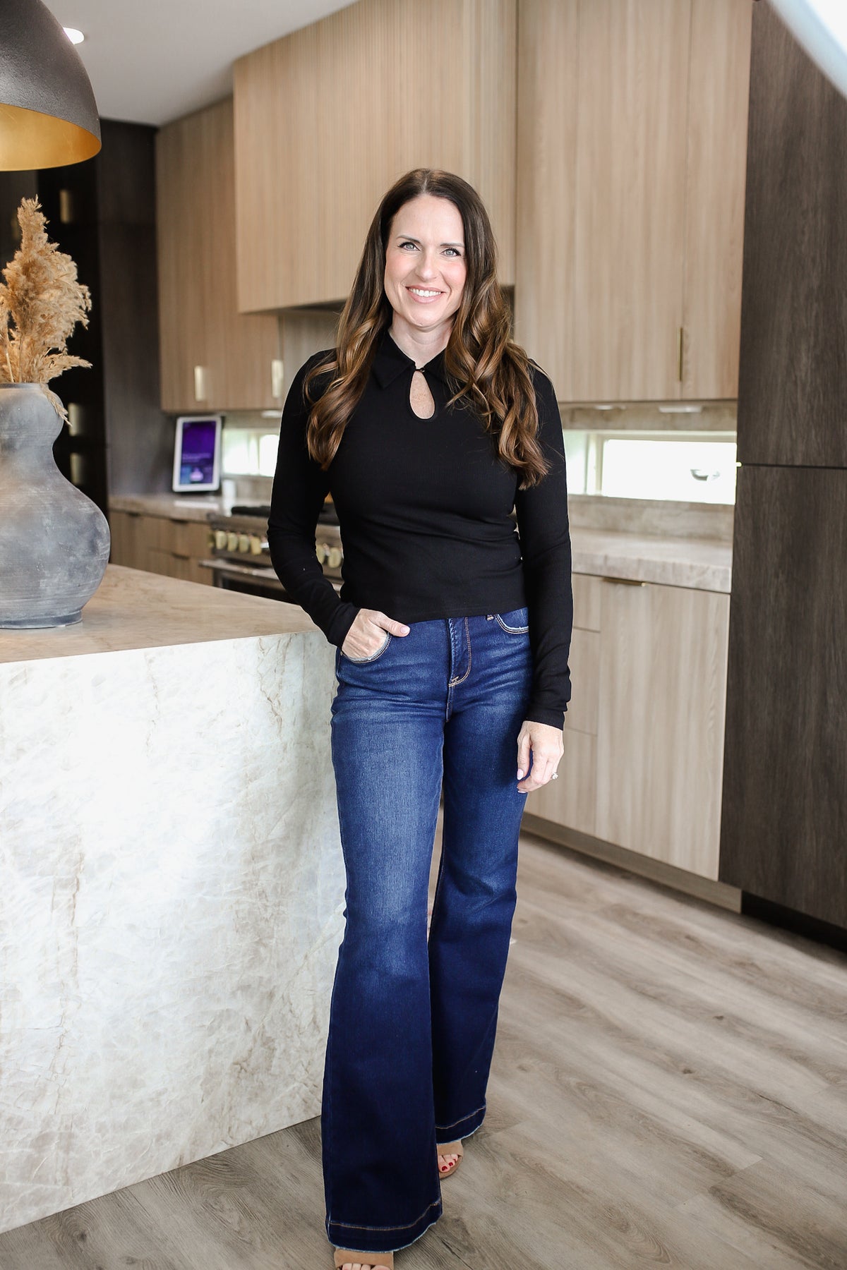 Elevate your everyday essentials with this sleek long sleeve knit top. Featuring a button loop with a chic brass button and a true-to-size fit, it’s both polished and effortless. Crafted from a soft, lightweight blend of rayon and spandex, this top offers comfortable stretch while maintaining a refined silhouette—perfect for workdays, casual outings, or layering under jackets. The model is in the small.
