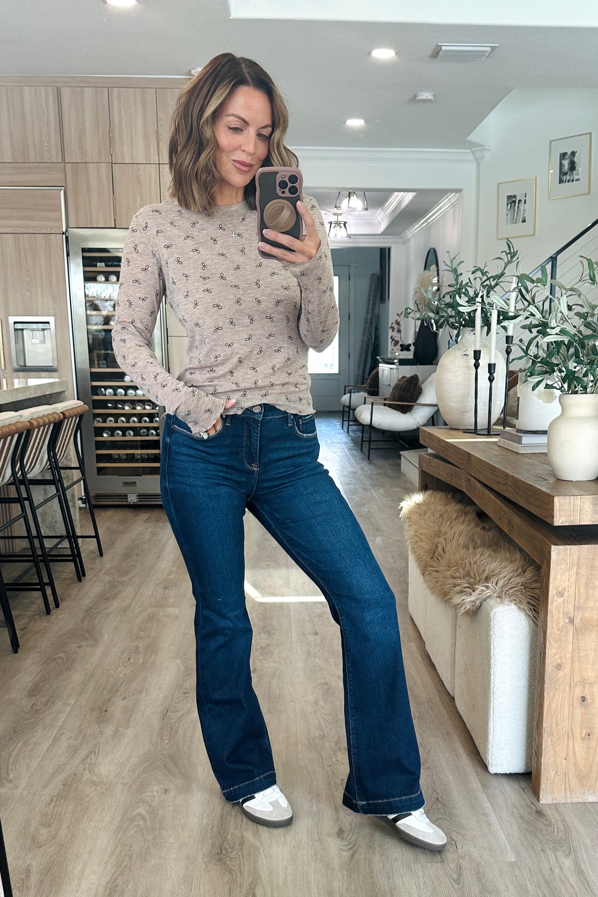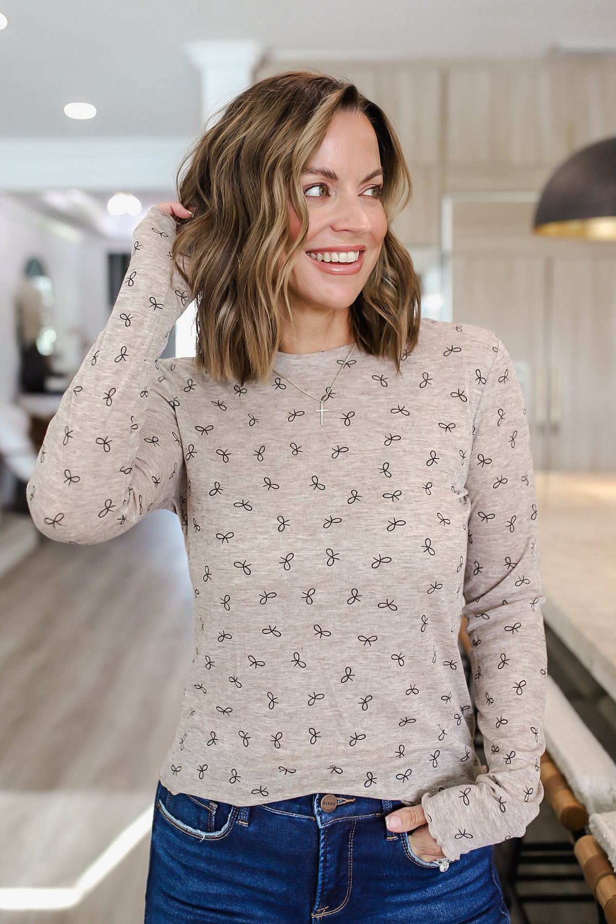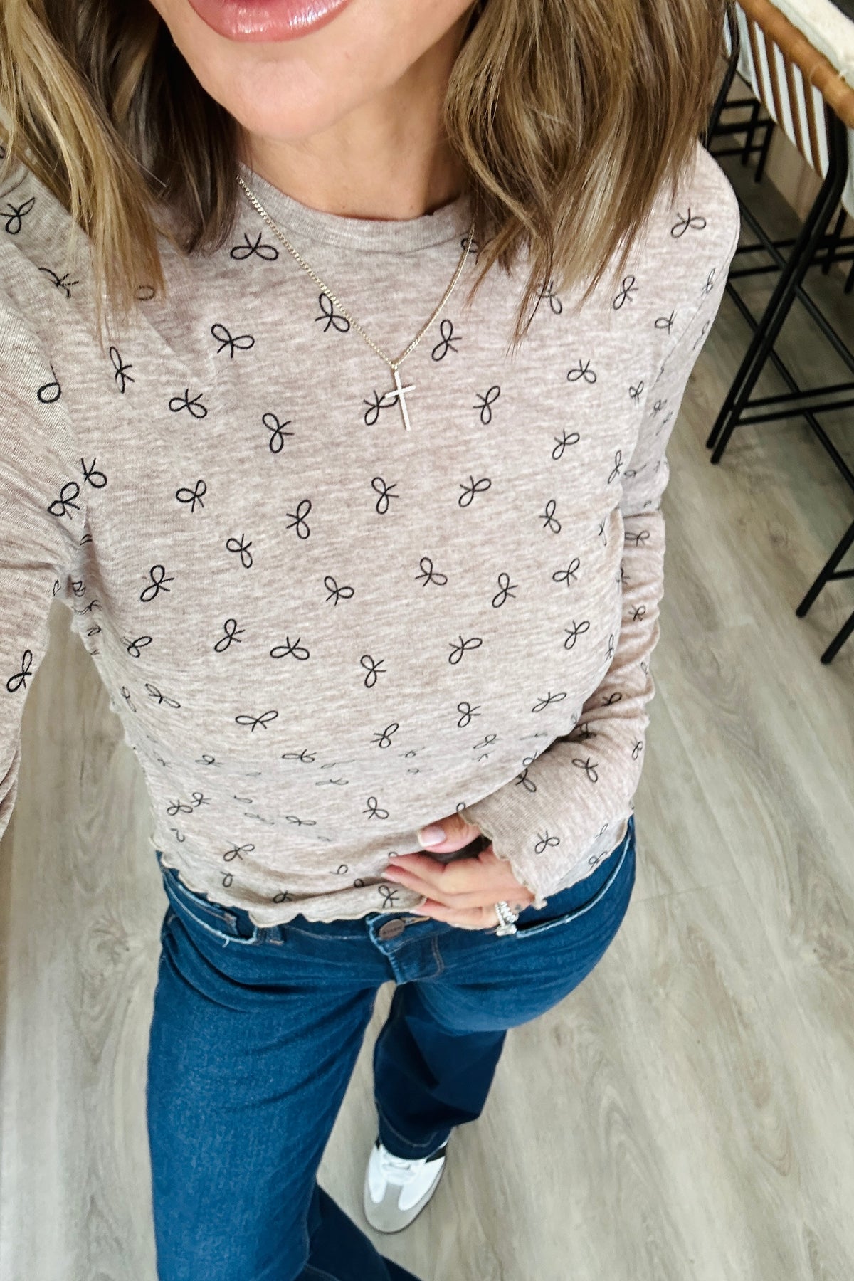 The Bow Print Lightweight Knit Top is a charming and versatile addition to your wardrobe. Featuring a delicate bow print design, this top adds a feminine touch to any outfit. The lightweight knit fabric is perfect for layering or wearing on its own, offering both style and comfort. Pair this top with jeans for a casual day out or dress it up with a skirt for a more polished look. Embrace your sweet and chic side with this adorable bow print top! The model is in the small. Paired with RISEN Full Size Tummy Control Mid Rise Flare Jeans Plus Size.