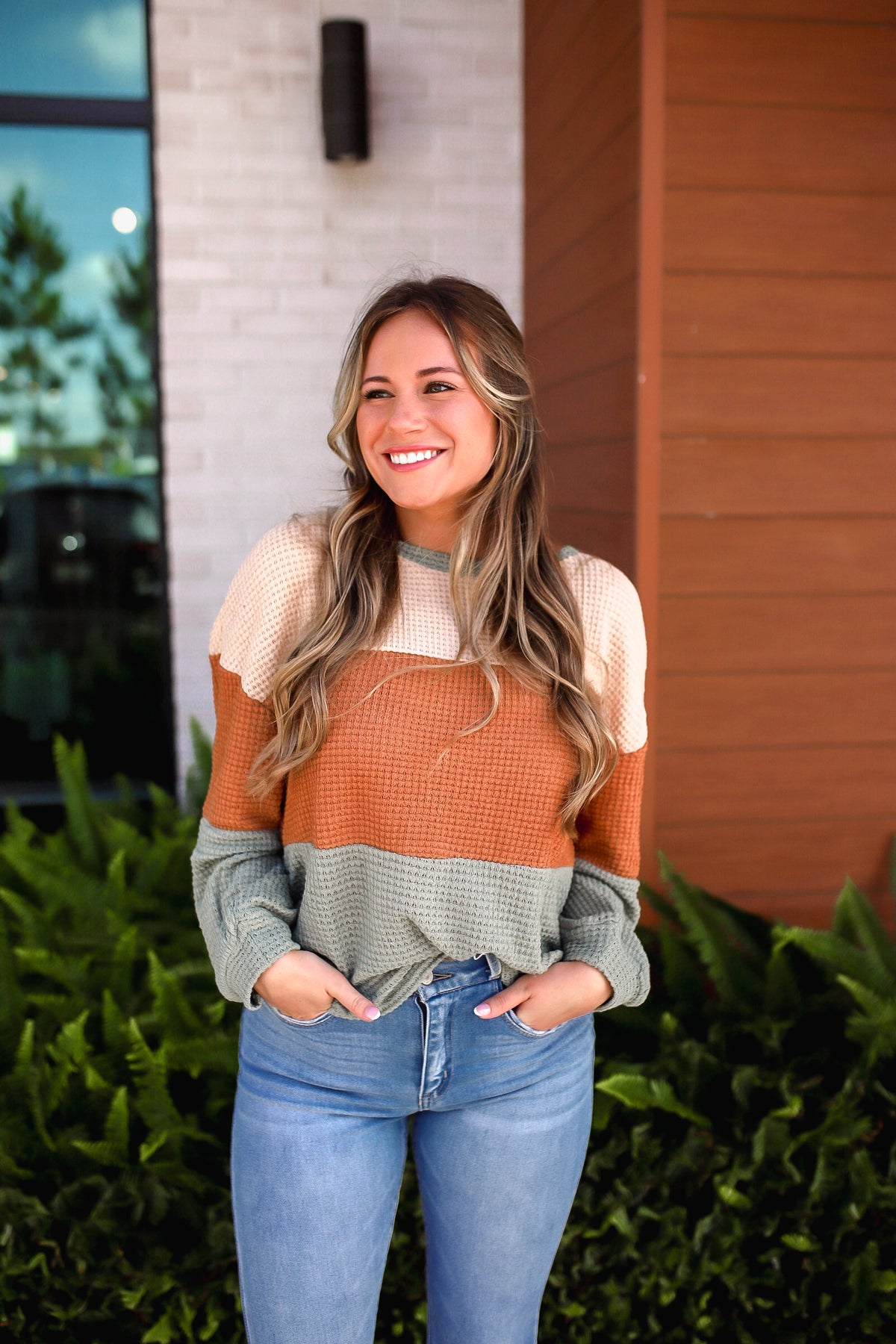 Waffle-Knit Color Block Round Neck Long Sleeve Blouse