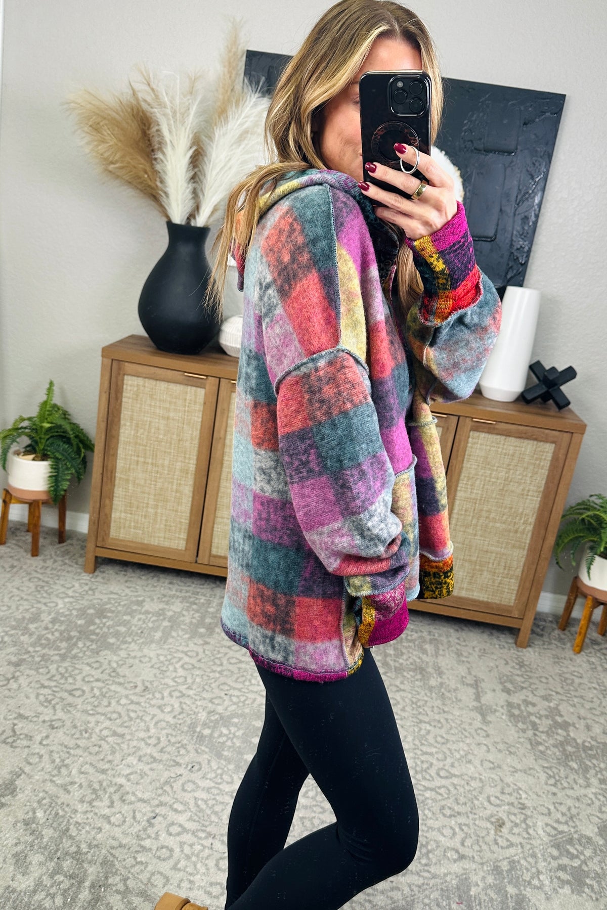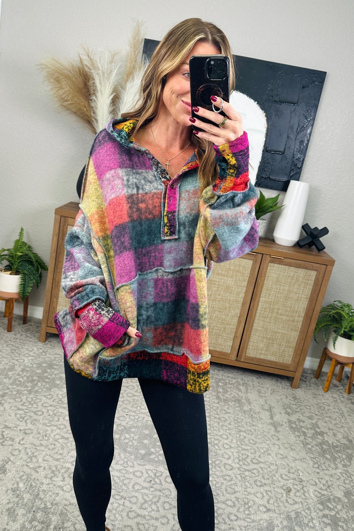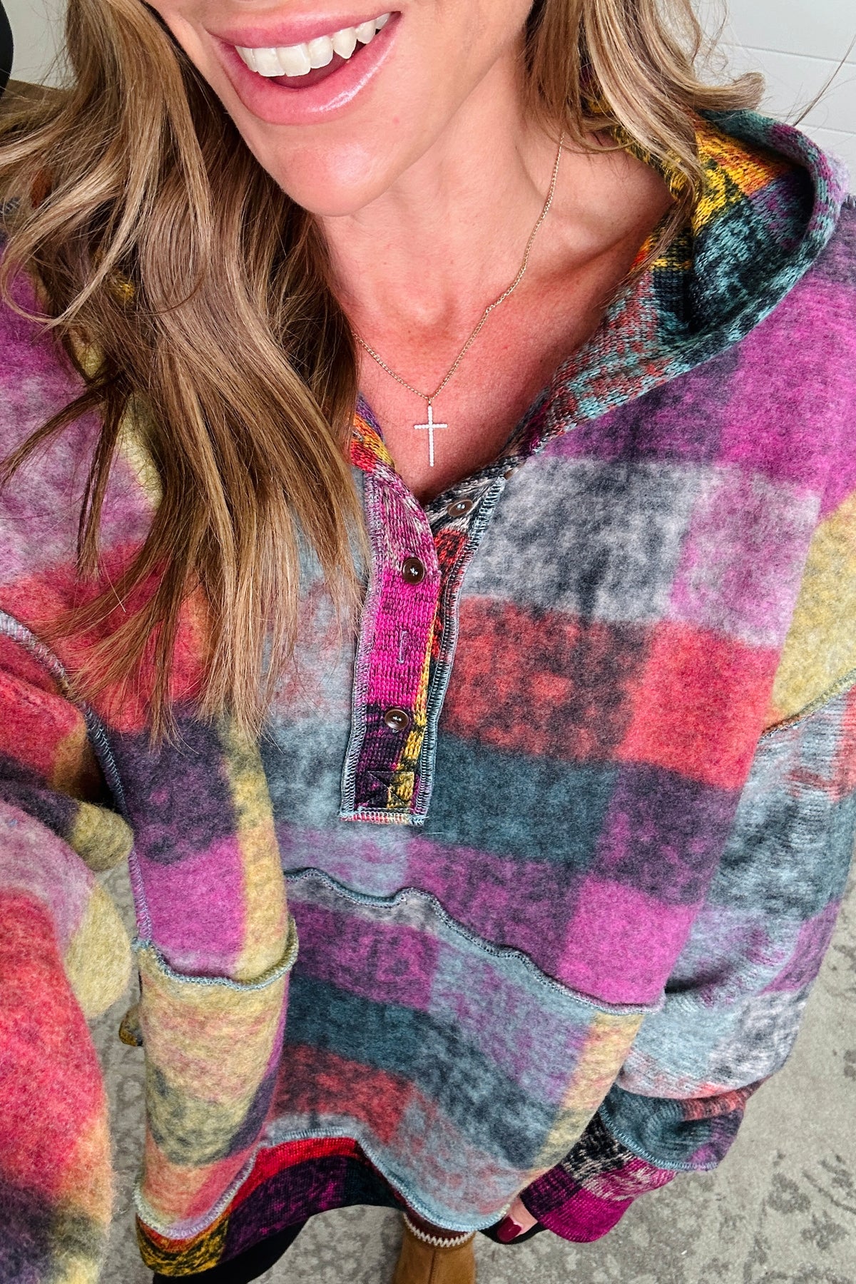This Long Sleeve Fleece Hoodie is a perfect combination of style and comfort. Featuring a trendy color block design, a unique half button closure, and practical thumbholes in the sleeves, this hoodie will keep you warm and fashionable. A must-have for any wardrobe! The model is in the medium.