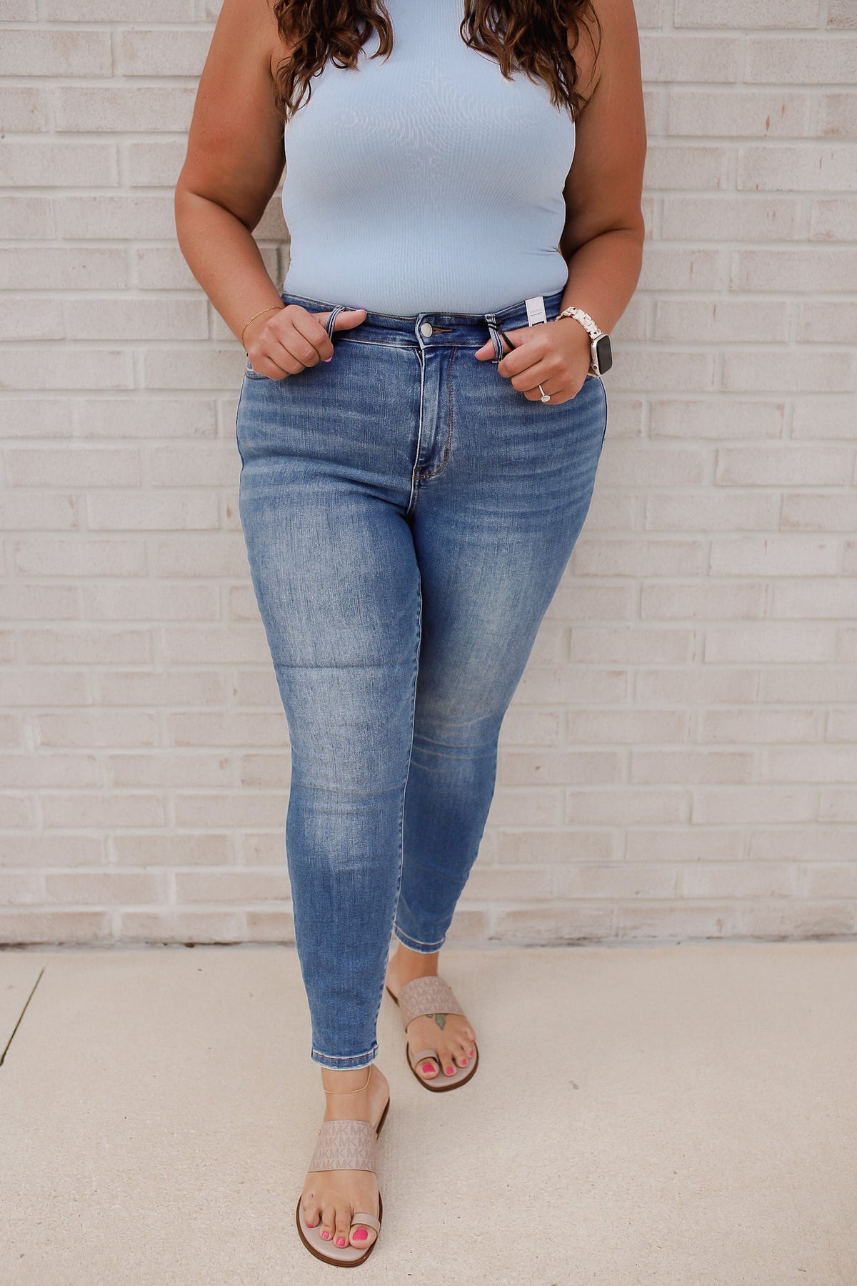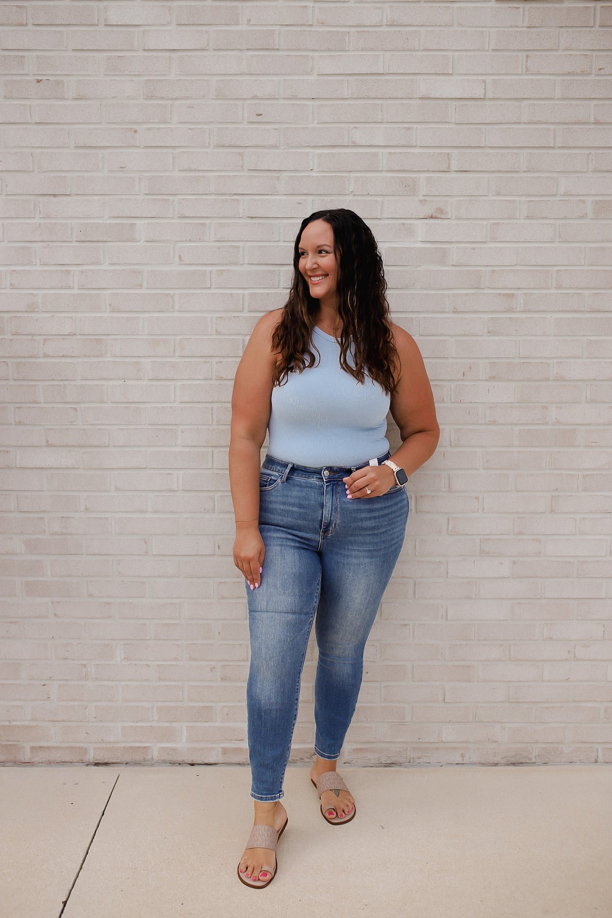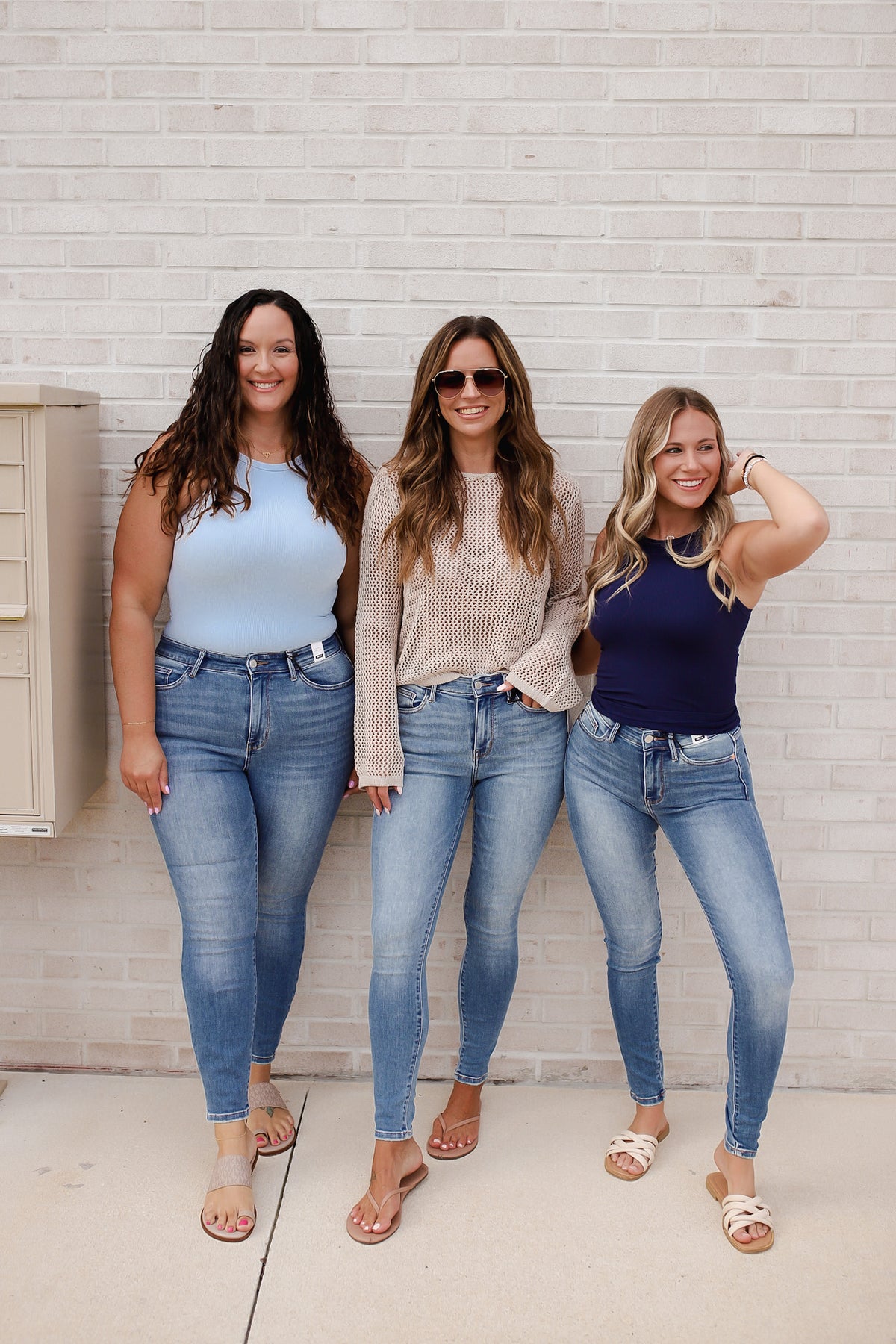 The Catherine jeans feature a high-waisted, skinny fit with a non-distressed finish. Perfect for a stylish but classic look, these jeans will pair wonderfully with your favorite top or blouse. Enjoy superior comfort and stretch performance with the timeless look of mid-rise jeans. Carina is a 6, wearing the 5. You can size down one from your even size. *Paired with Open Edit Long Sleeve Top*