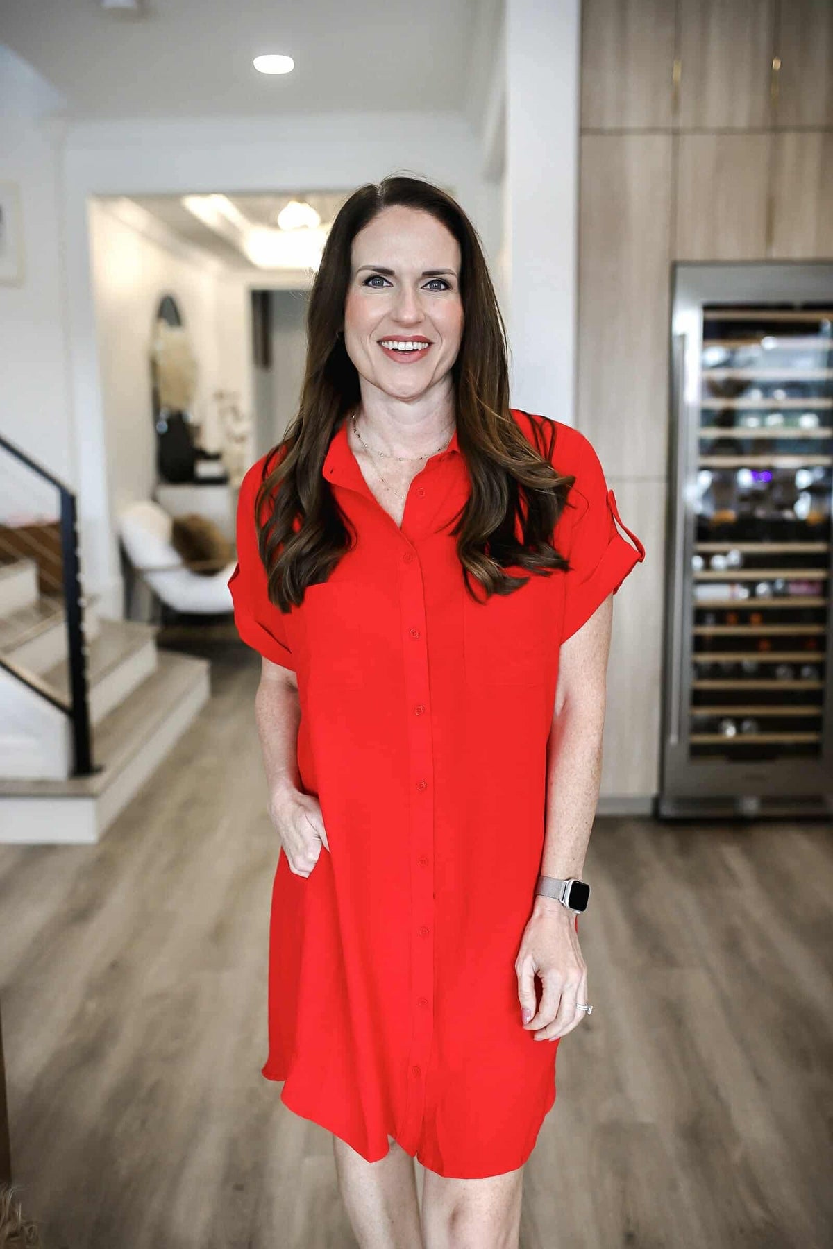 The Button Down Short Sleeve Woven Shirt Dress is a classic and versatile piece for your wardrobe. This dress features a button-down front, short sleeves, and a woven fabric construction. Its simplistic design makes it easy to dress up or down for various occasions. Pair it with sandals for a casual daytime look or dress it up with heels and accessories for a more polished ensemble. The model is in the small.