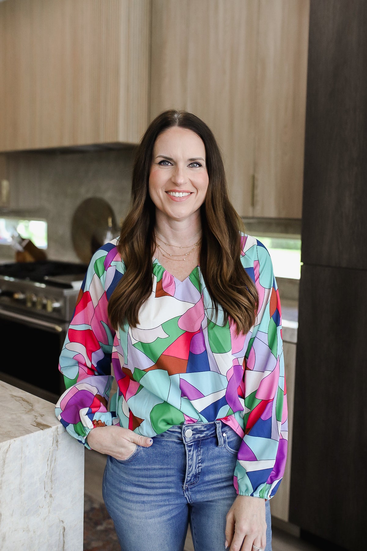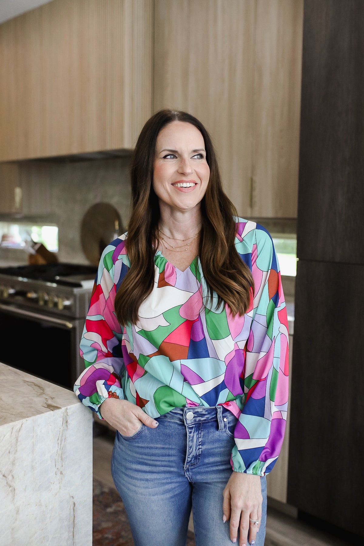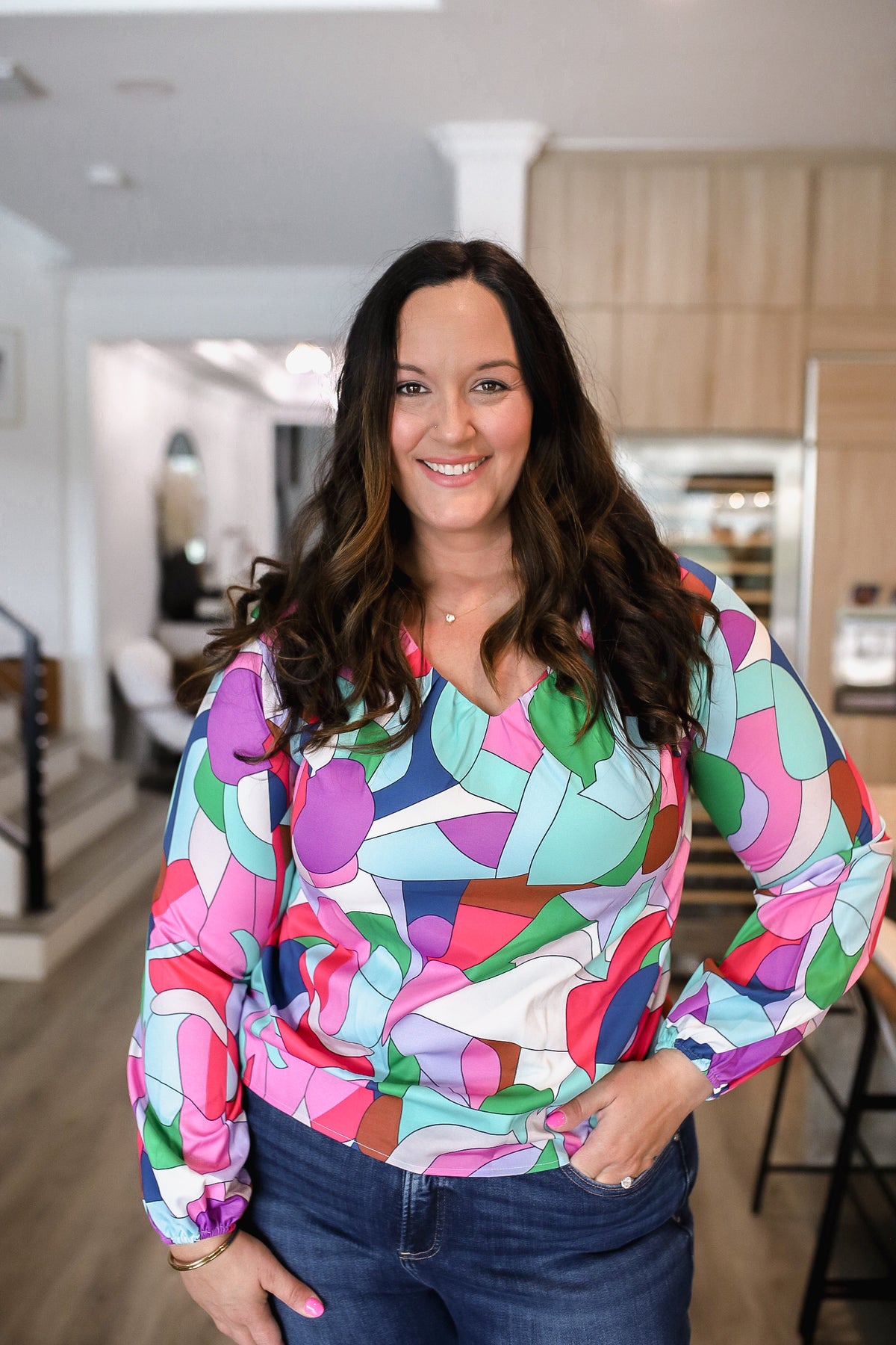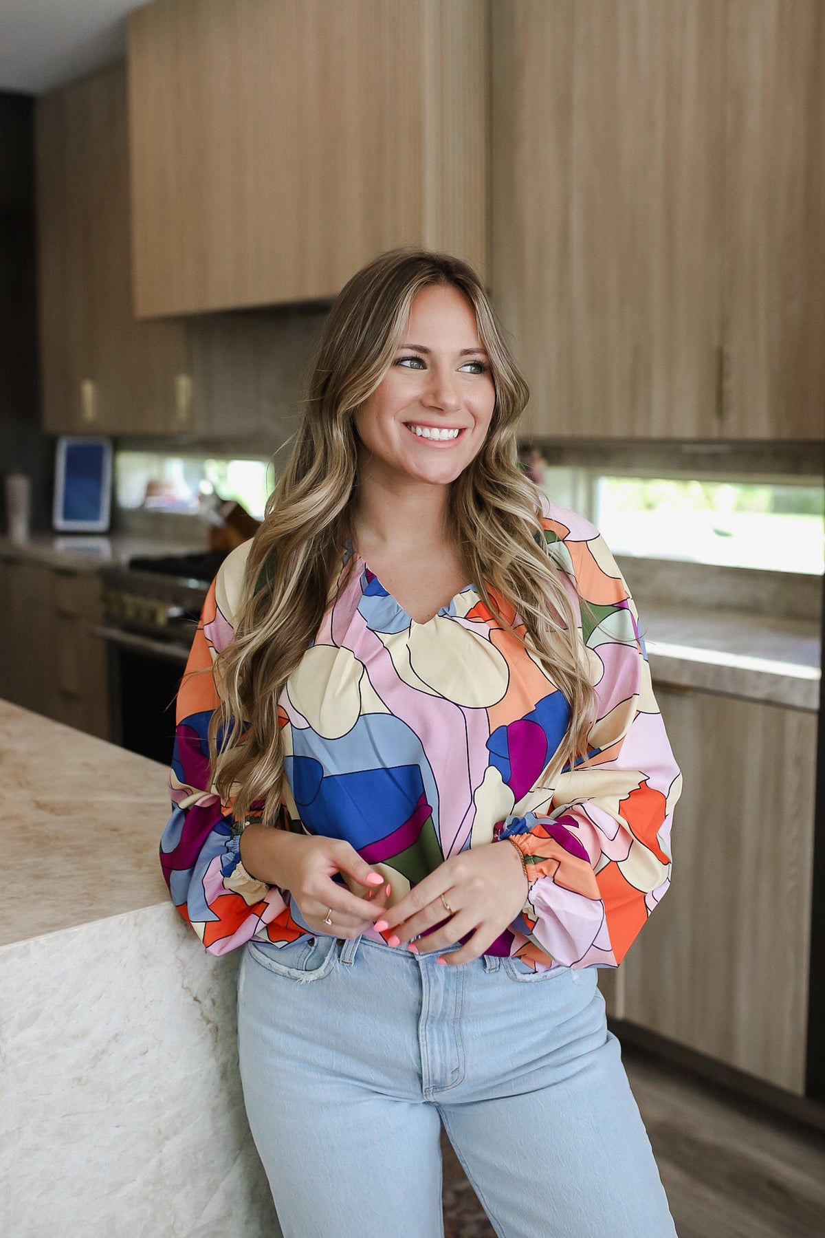 Printed V-Neck Long Sleeve Blouse WH