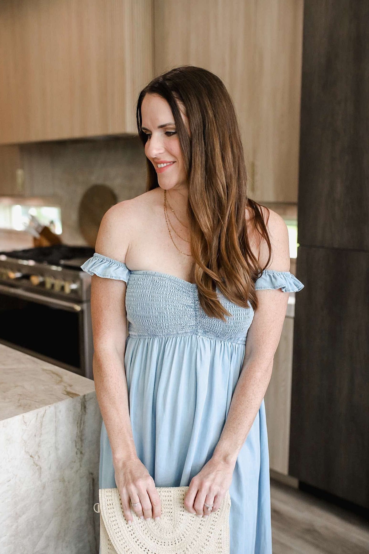 This playful Allure Smocked Denim Off-shoulder Maxi Dress features a strapless sweetheart neckline and a smocked bodice with a ruched center for a flattering fit. Off-shoulder ruffle straps add a flirty touch, while the high empire waist and gathered skirt create a breezy, fit-and-flare silhouette. A front slit and low back bring a hint of allure, and the ankle-length design makes it perfect for sunny days and casual outings.