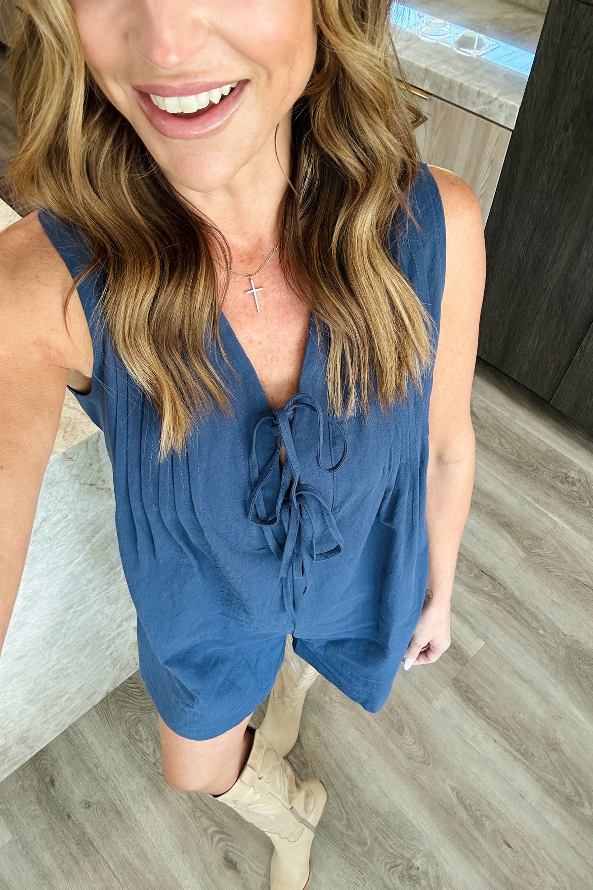 Ready to slay the day in ultimate comfort and style? This Tie Front Sleeveless Romper is your new warm-weather go-to. Featuring a flattering tie-front detail and sleek sleeveless design, it’s perfect for staying cool and chic all season long. The functional pockets add a touch of practicality, making it easy to carry your essentials while looking effortlessly stylish.