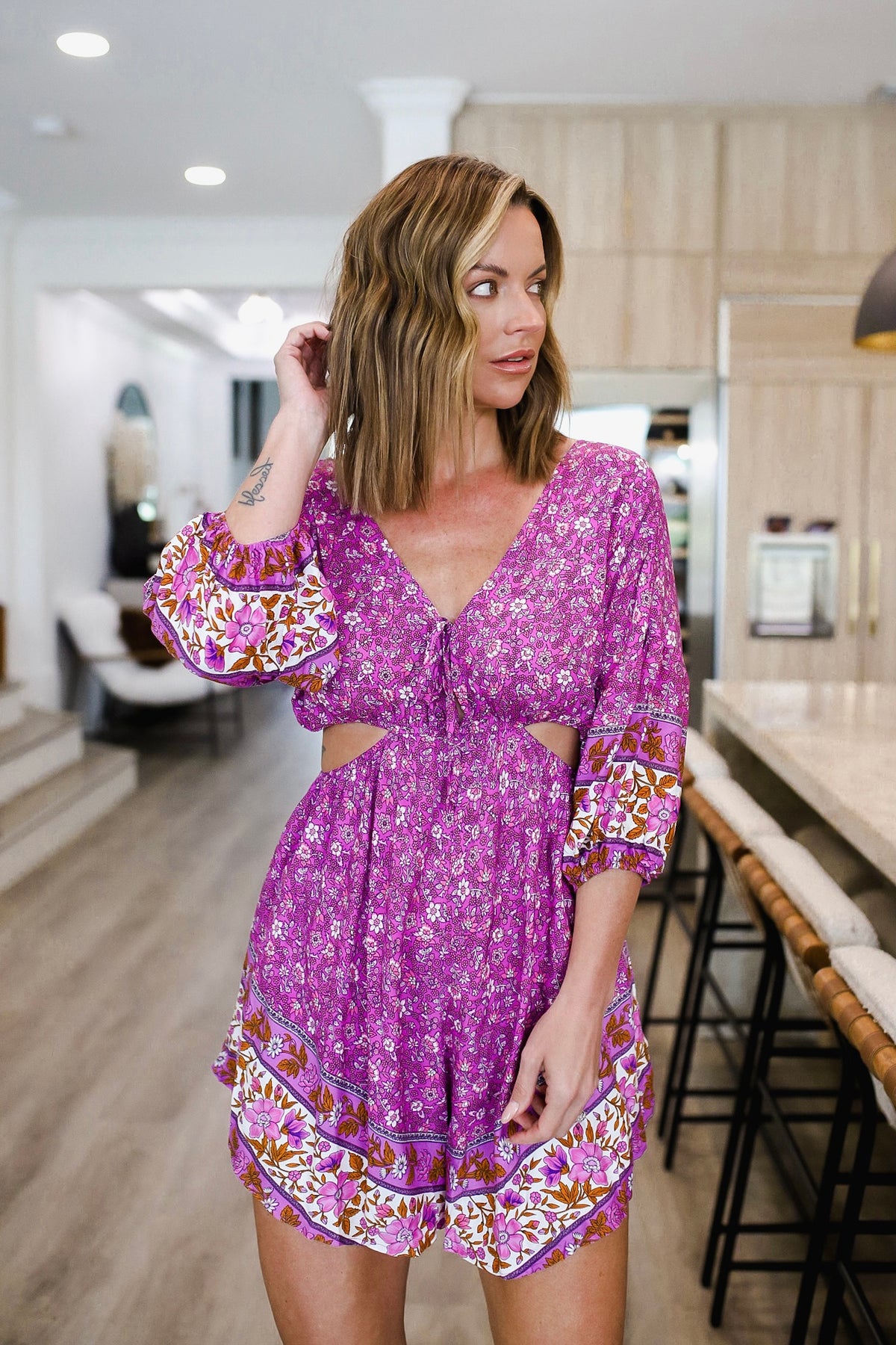 Flirty meets free-spirited in the Tied Front Cutout Printed Romper. Featuring a bold purple paisley design, this one-piece stunner is all about standout details—from the flirty front tie and peekaboo cutout to the relaxed fit that keeps you comfy and cute. With adjustable straps and a breezy silhouette, it’s perfect for festivals, girls’ night, or any sun-soaked adventure. Just add boots or slides and let the print do the talking. The model is in the medium for length.