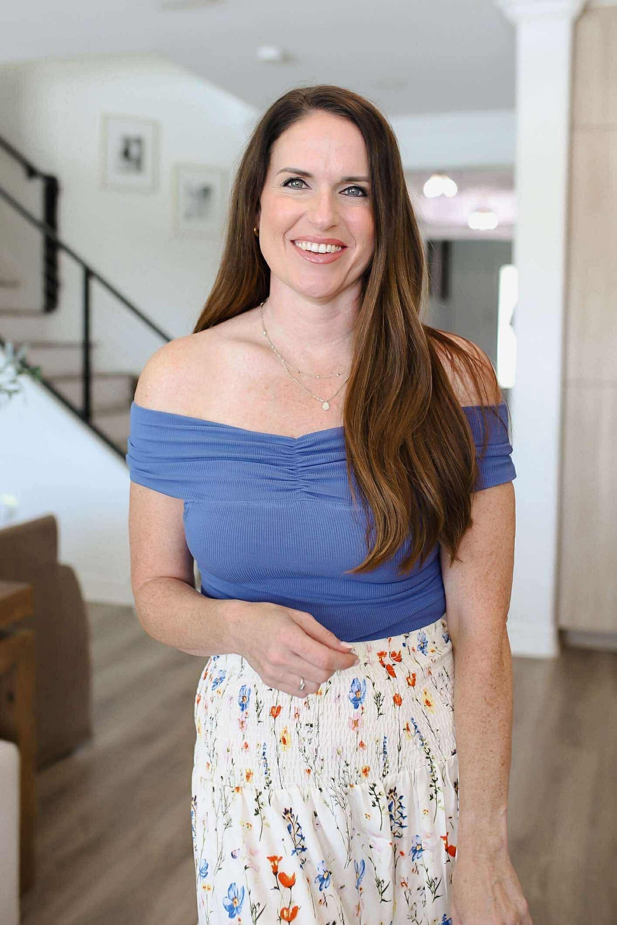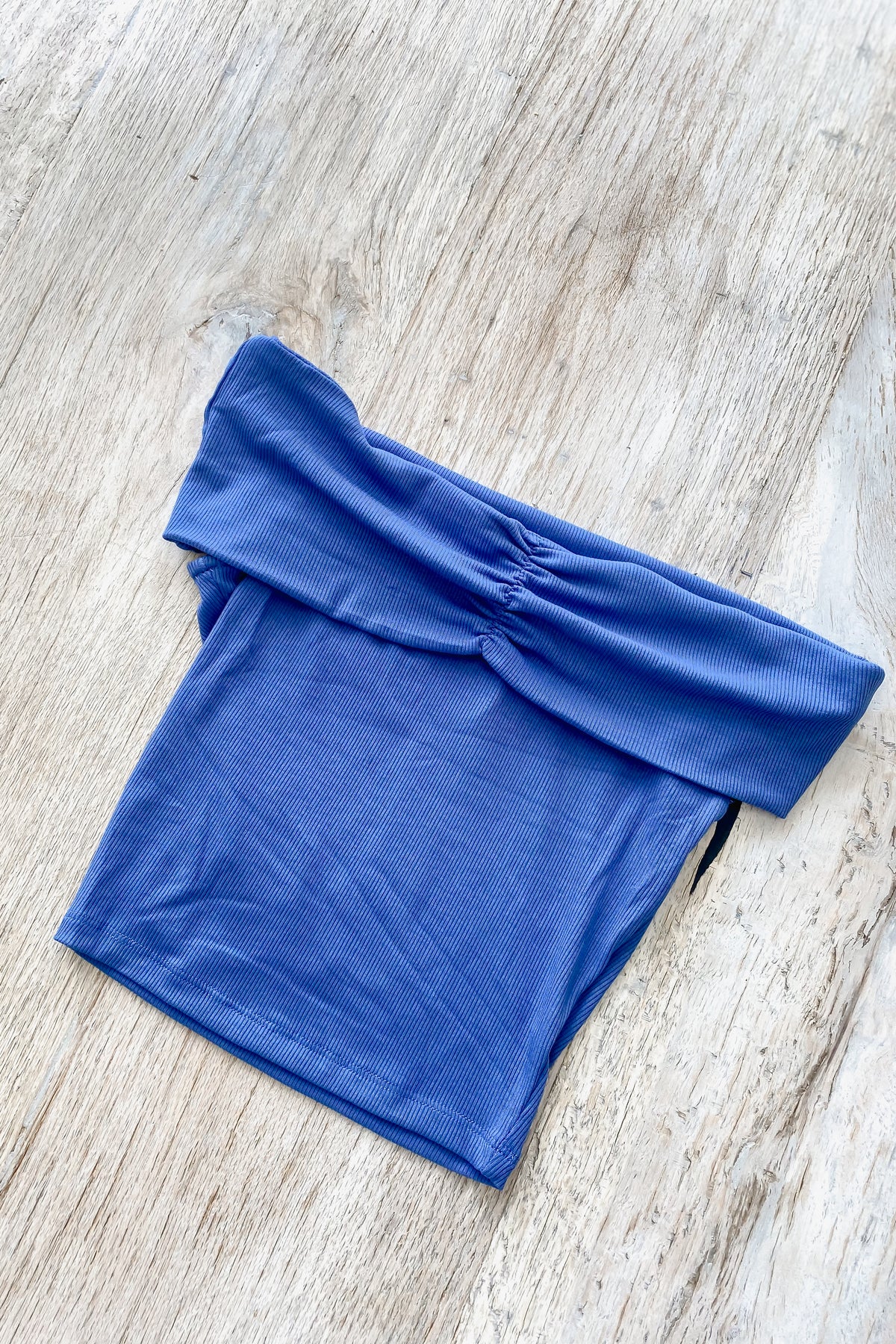 This playful blue crop top features a trendy off-the-shoulder design with a ruched front that adds a flirty touch. Its solid color makes it easy to pair with your favorite bottoms for a fun, stylish look perfect for sunny days or casual nights out.