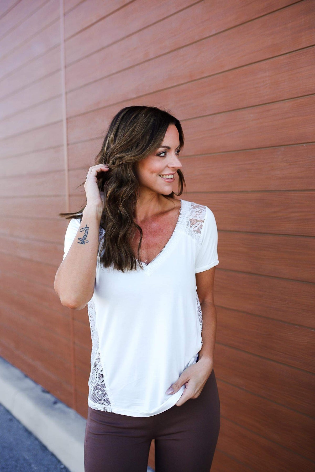 The V-Neck Short Sleeve Lace Trim Top is an elegant and versatile top that exudes femininity. The delicate lace trim detailing adds a touch of sophistication to the classic V-neck design. With short sleeves, this top is perfect for warmer weather and can be layered under a jacket or cardigan for a stylish look. The soft and breathable fabric ensures comfort throughout the day. Pair it with jeans or a skirt for a chic and romantic ensemble that is suitable for both casual and dressier occasions. Elevate your outfit with this lovely lace trim top that adds a touch of refinement and charm to any wardrobe.