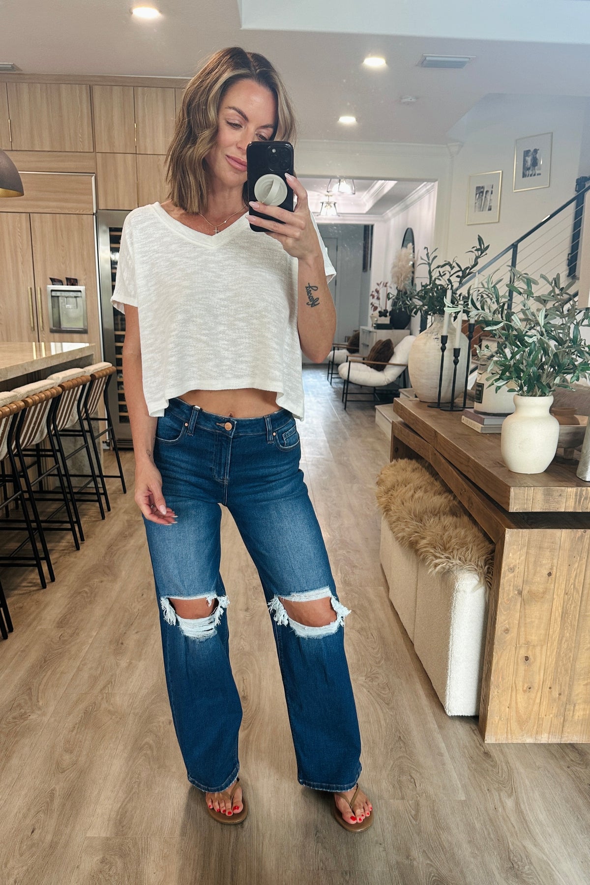This essential V-neck t-shirt combines style with comfort, featuring a relaxed silhouette that's perfect for everyday wear. Made from soft, breathable fabric, it offers a casual loose fit with dolman short sleeves for enhanced mobility. The classic black color and minimalist design make it a versatile wardrobe staple that can be easily paired with jeans, skirts, or shorts. The lightweight material ensures all-day comfort while maintaining a polished look. Ideal for both casual outings and casual workplace settings. The model is in the small.