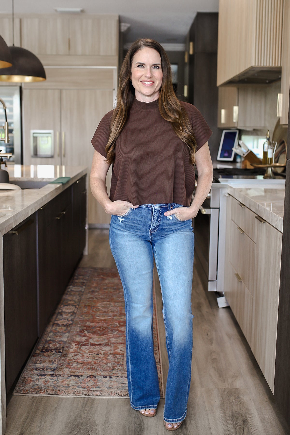 This sophisticated brown ribbed pullover sweater features a fashion mock neck design and short sleeves, making it perfect for spring and summer styling. Crafted from soft, breathable knit fabric with distinctive ribbed texture, this versatile piece offers a relaxed fit and cropped silhouette. The rich brown colorway adds warmth to any outfit, while the pullover construction ensures easy wear. Ideal for layering or wearing alone, this sweater top combines comfort with contemporary style, perfect for casual outings or dressed-up occasions when paired with your favorite jeans or skirts.
