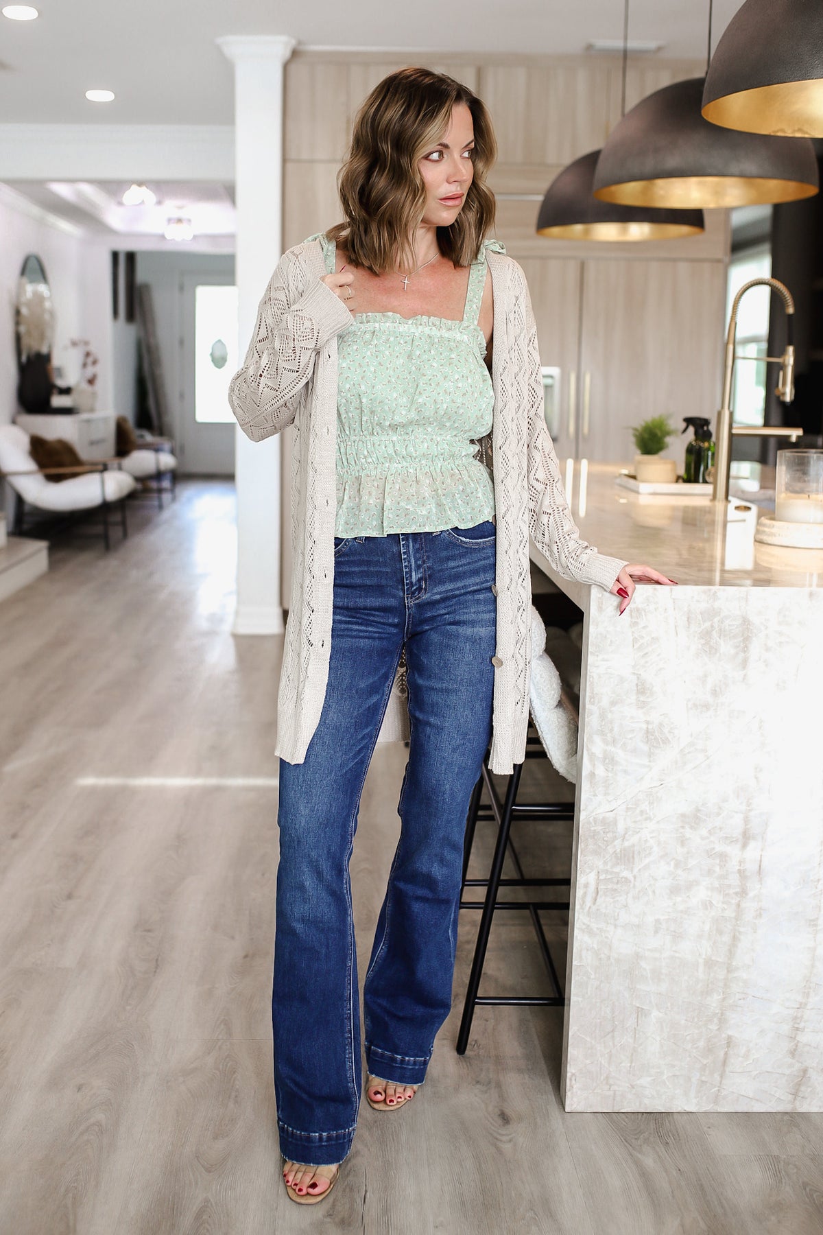 Elevate your denim game with the perfect mix of classic structure and modern edge. Crafted from comfort stretch denim, these high-rise bootcut jeans feature a sleek trouser-style hem for a polished finish that pairs effortlessly with boots or heels. The full-length silhouette elongates the leg, while the bootcut shape balances every figure for a flattering fit. The model is a 4, wearing the 3. You can size down one from your even size. Paired with Call Me Cute top.