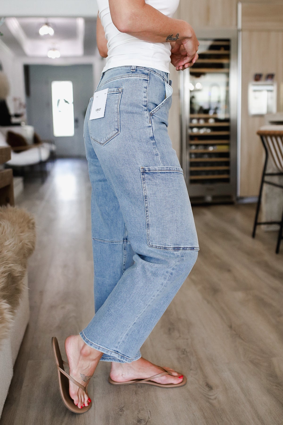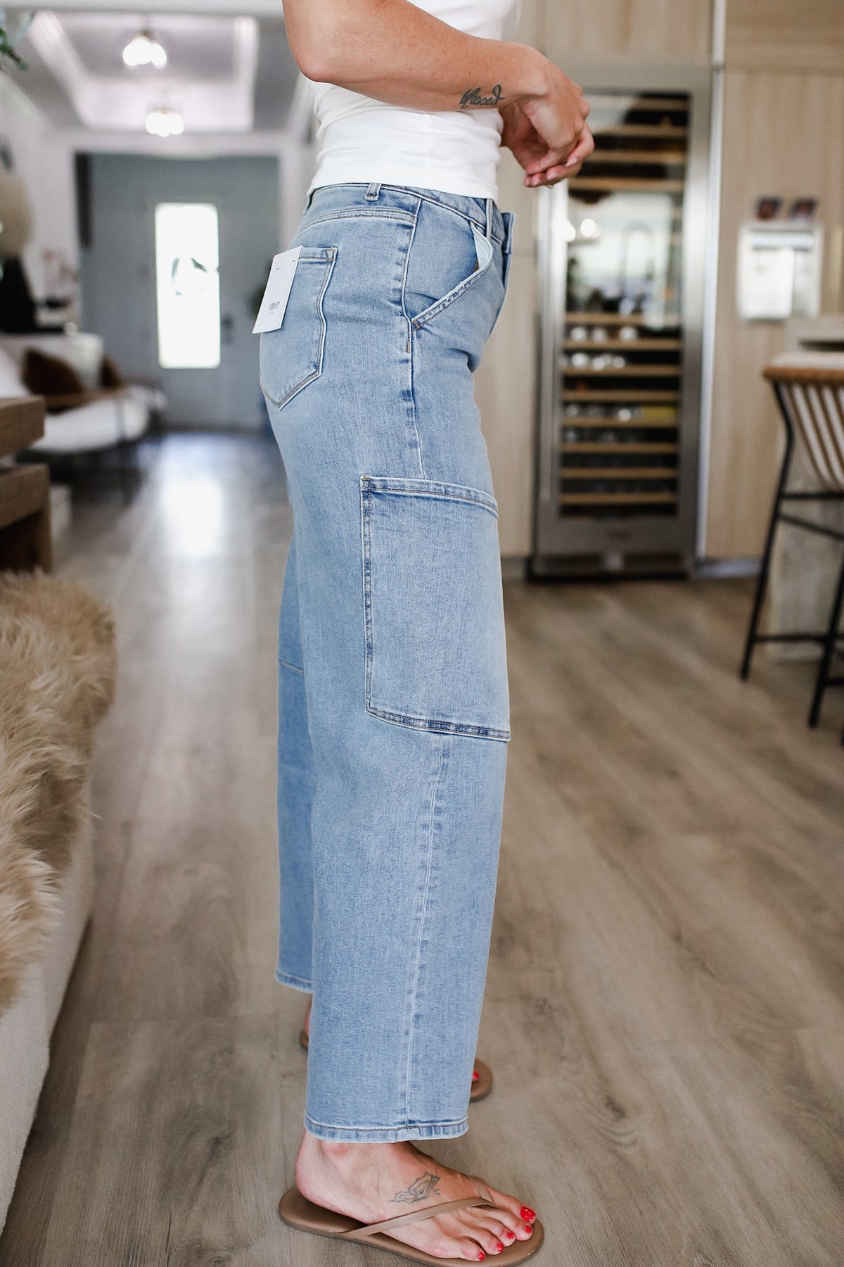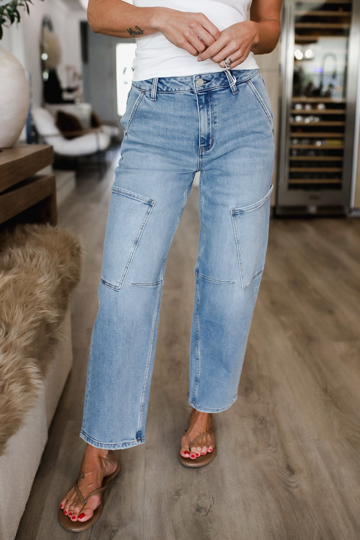 Comfort stretch denim, high rise waist, ankle length, utility barrel leg jeans