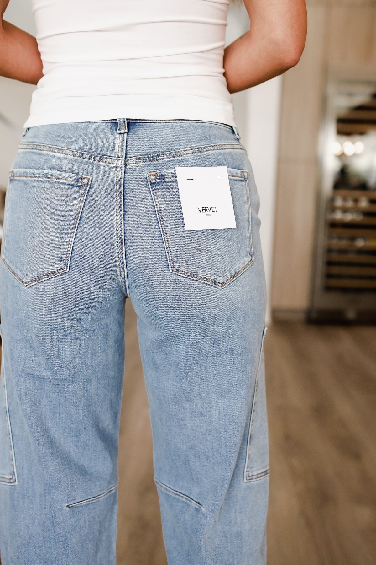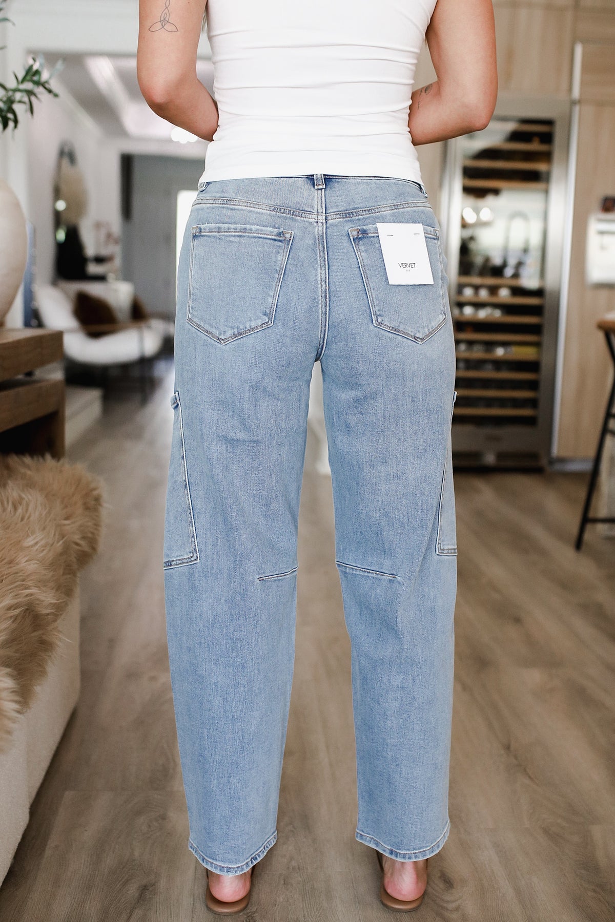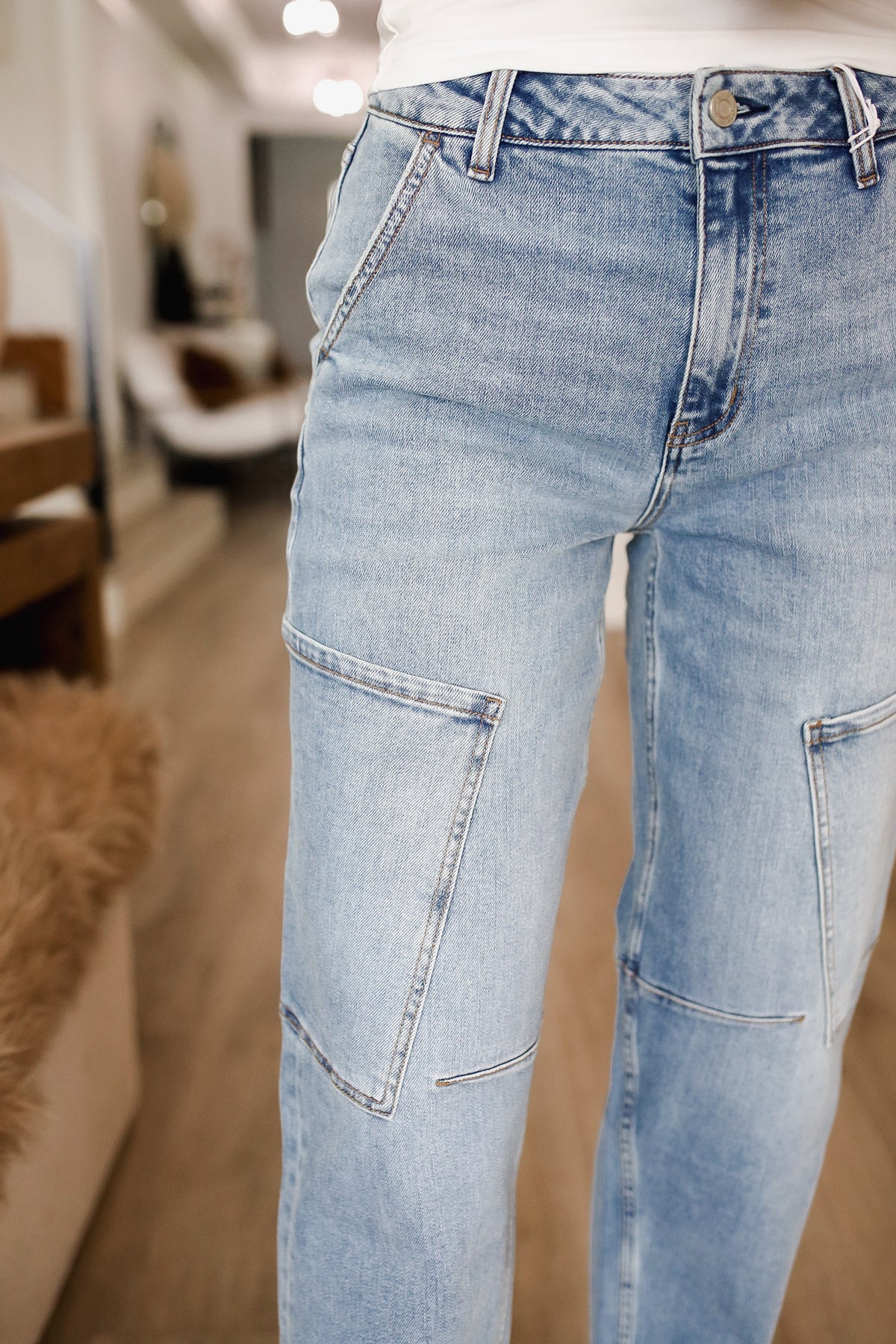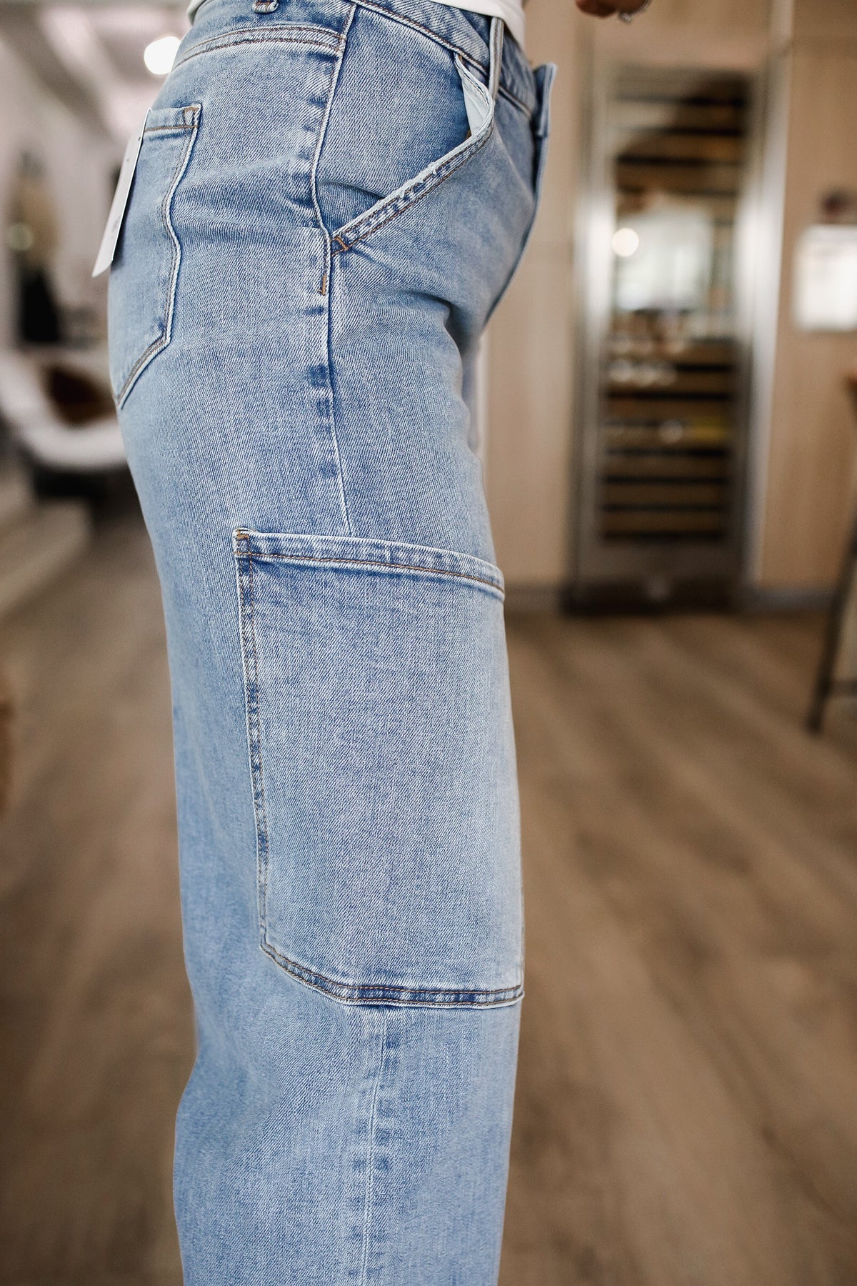 Comfort stretch denim, high rise waist, ankle length, utility barrel leg jeans