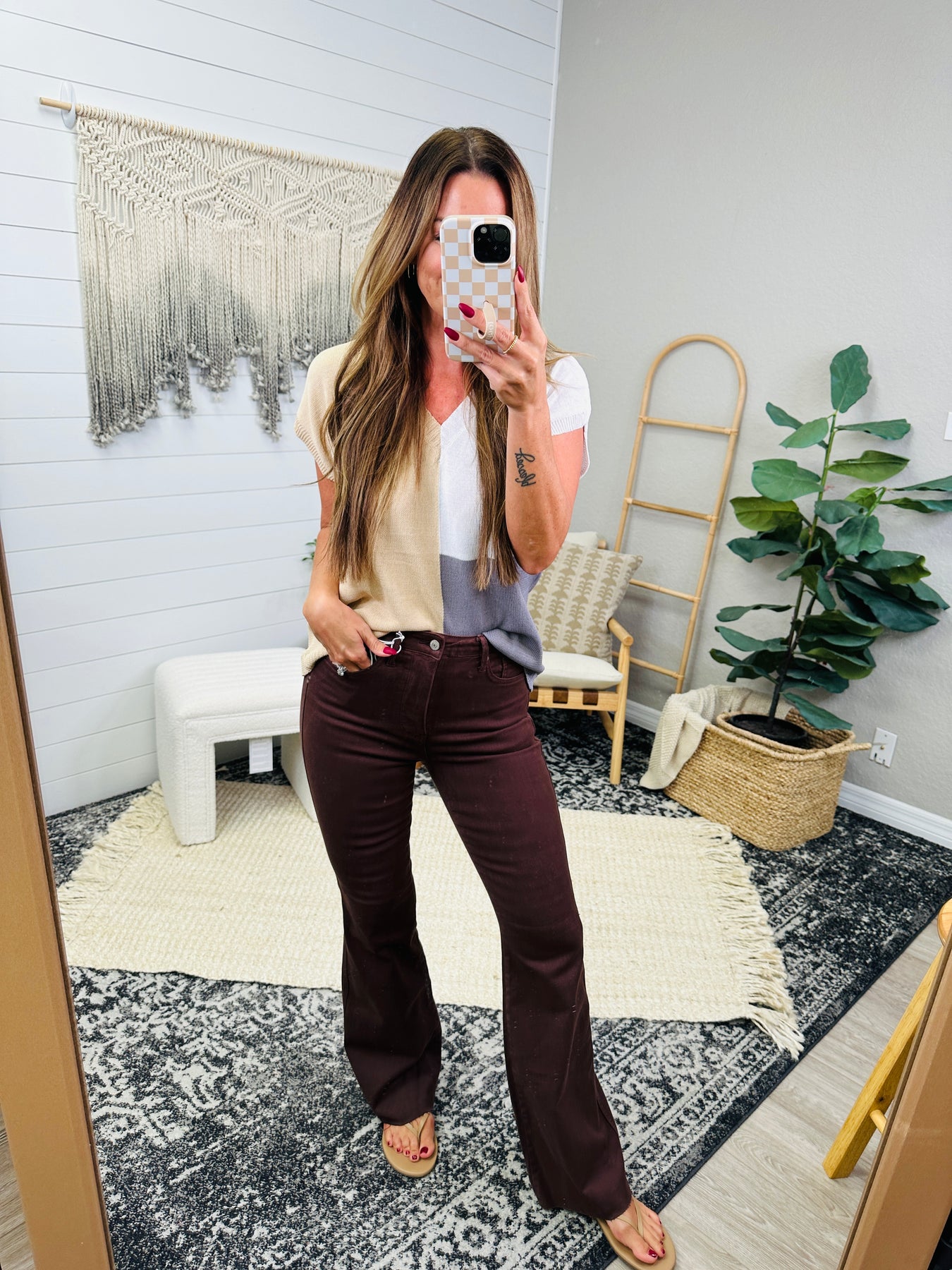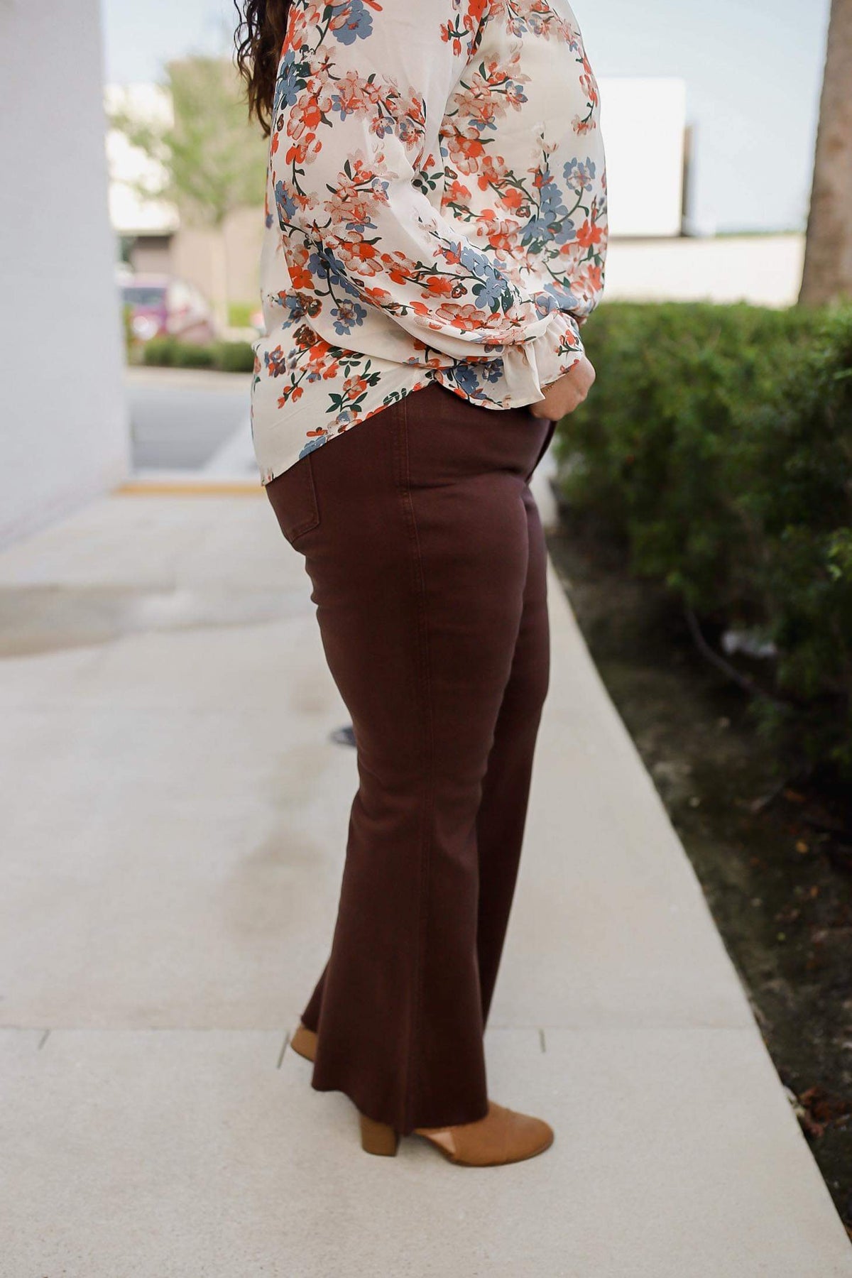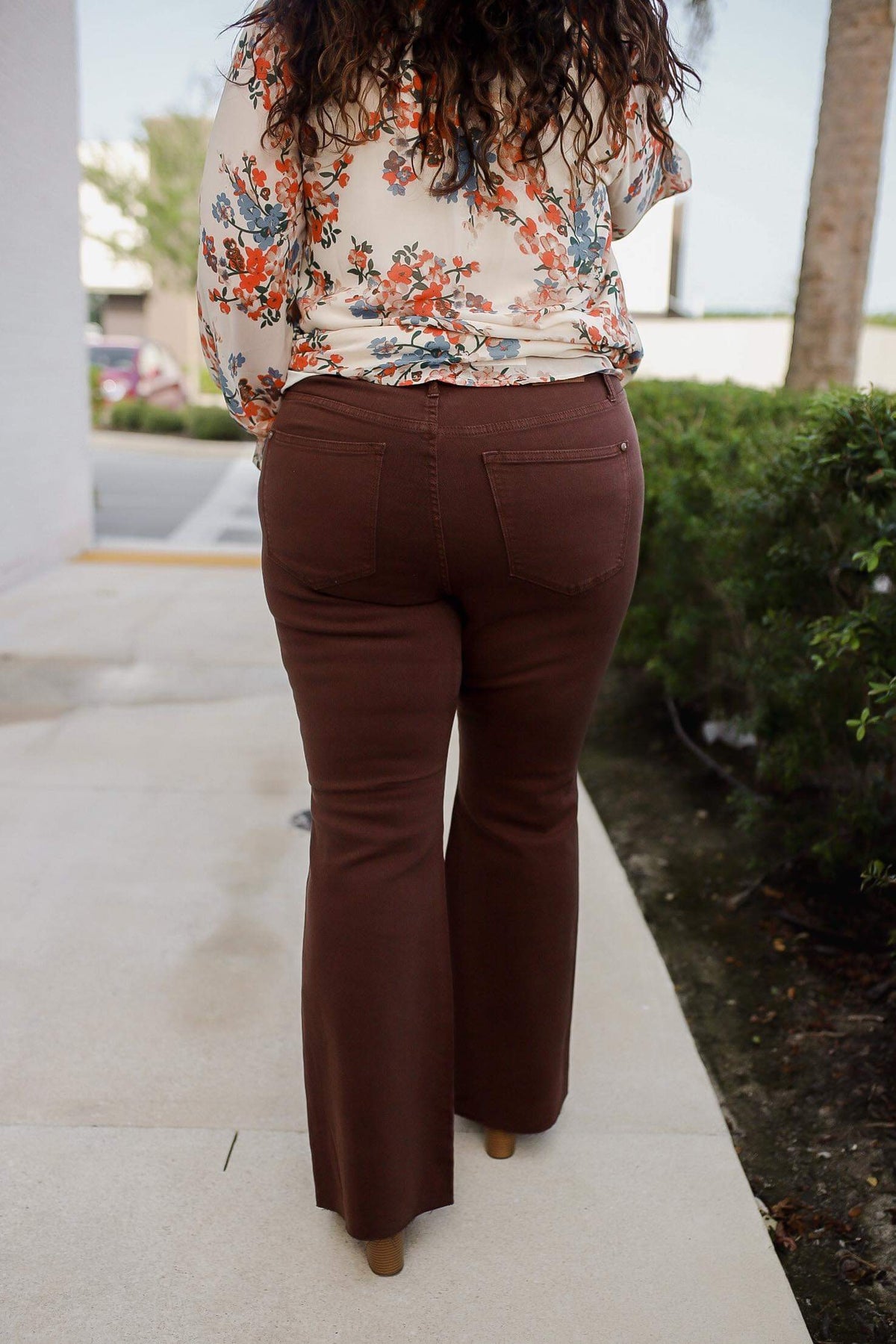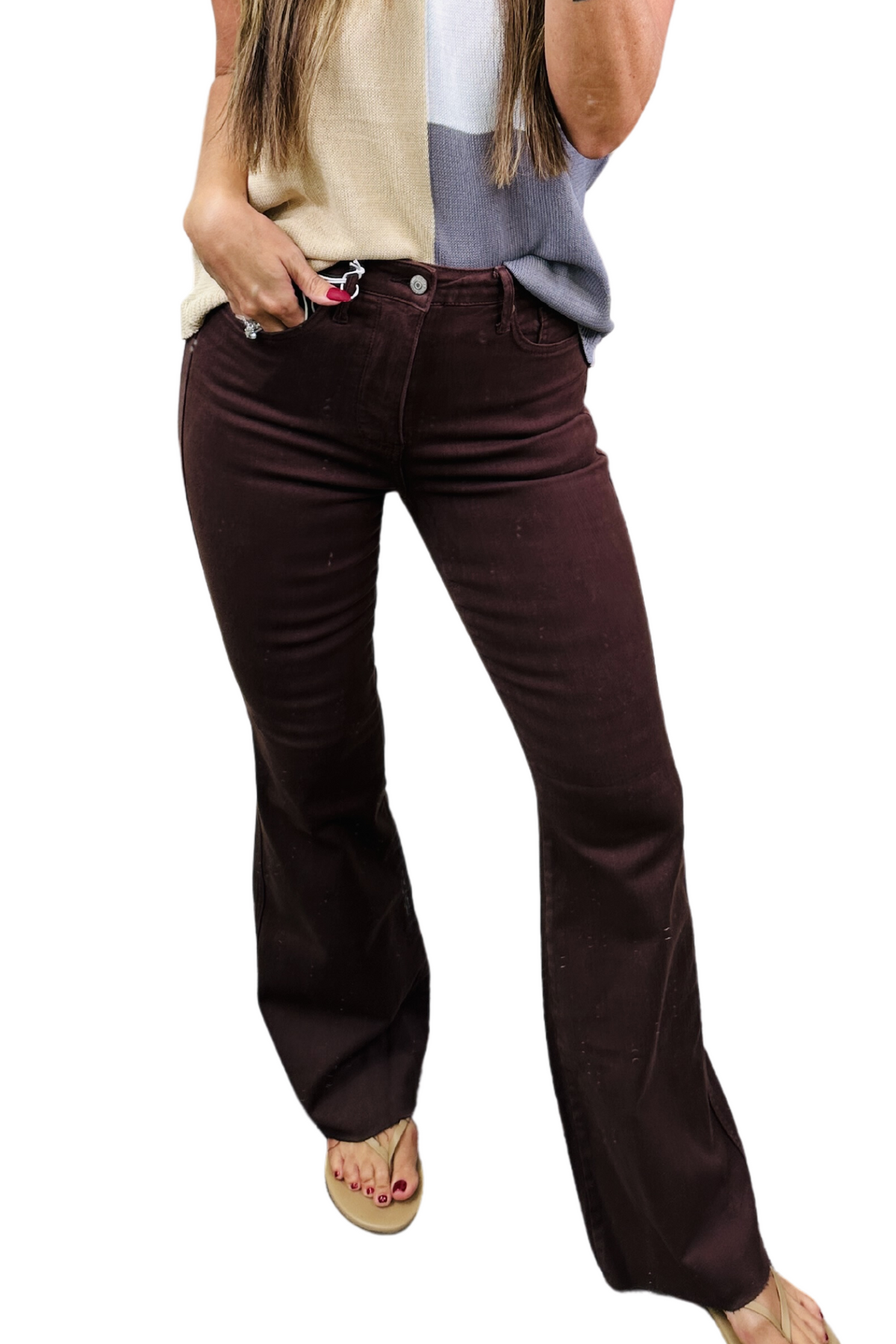 Our Sienna High Rise Control Top Flare Jeans ifrom Judy Blue look as great as they feel. Enjoy the garment-dyed espresso brown coloring and the tummy control tech to help you look your best. The flared silhouette, raw hemline, and non-distressed look provide amazing style and comfort. Carina is a 6, wearing the 5. You can size down one from your even size.
