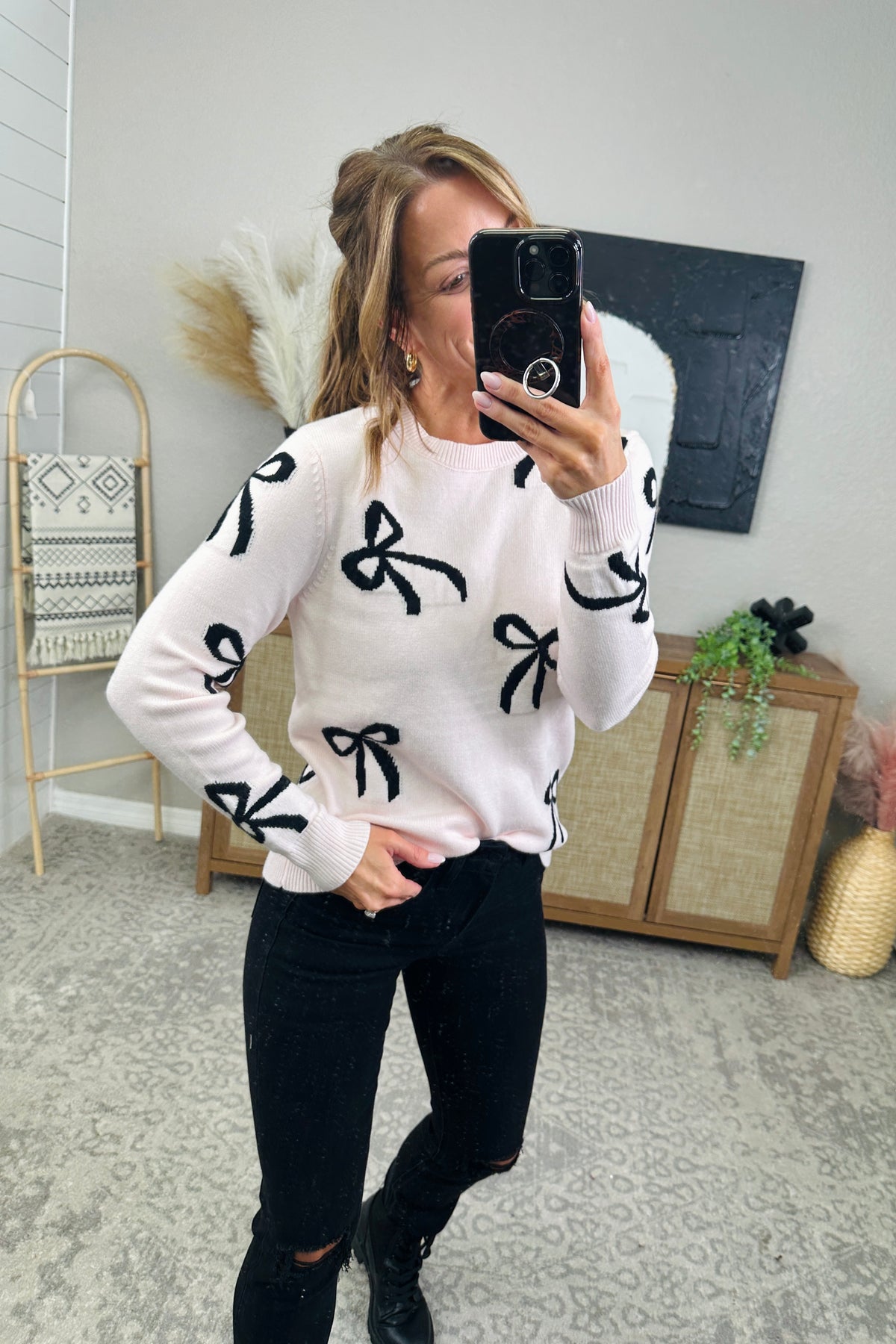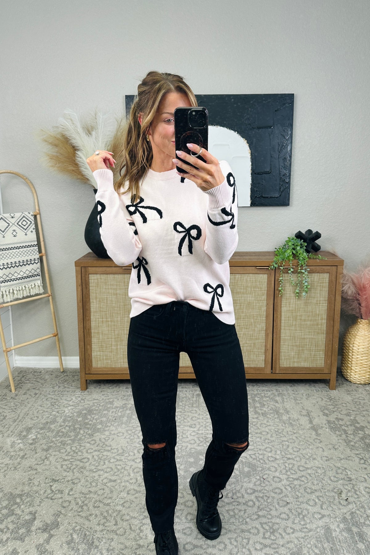 Get cozy in our Bow Pattern Sweater! With a playful round neck and loose fit, this sweater is perfect for those chilly days. The unique bow pattern adds a touch of whimsy to your wardrobe. Stay warm and stylish in this must-have piece! Paired with Eileen straight black jeans. The model is in her true to size small, for a more relaxed fit size up one.