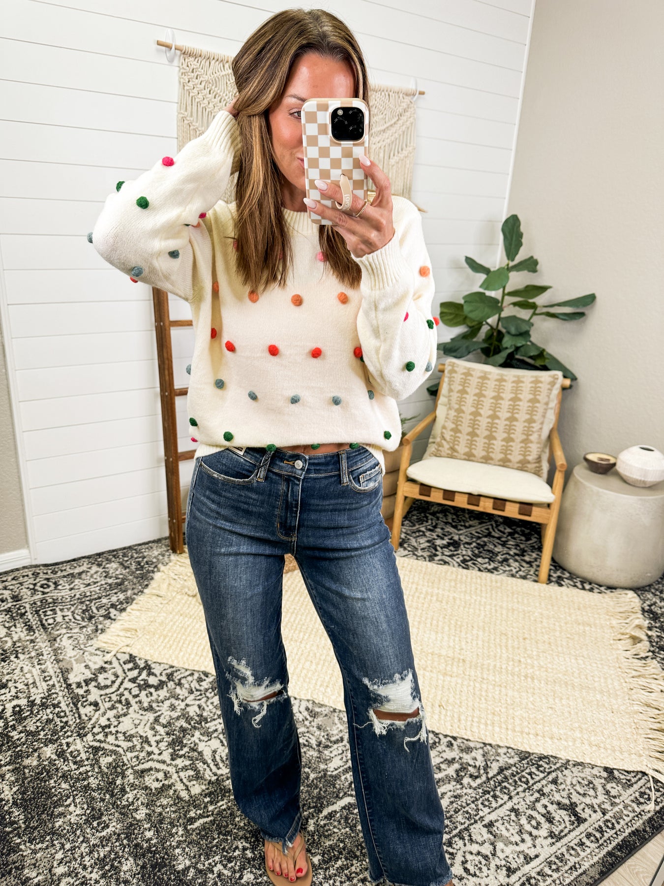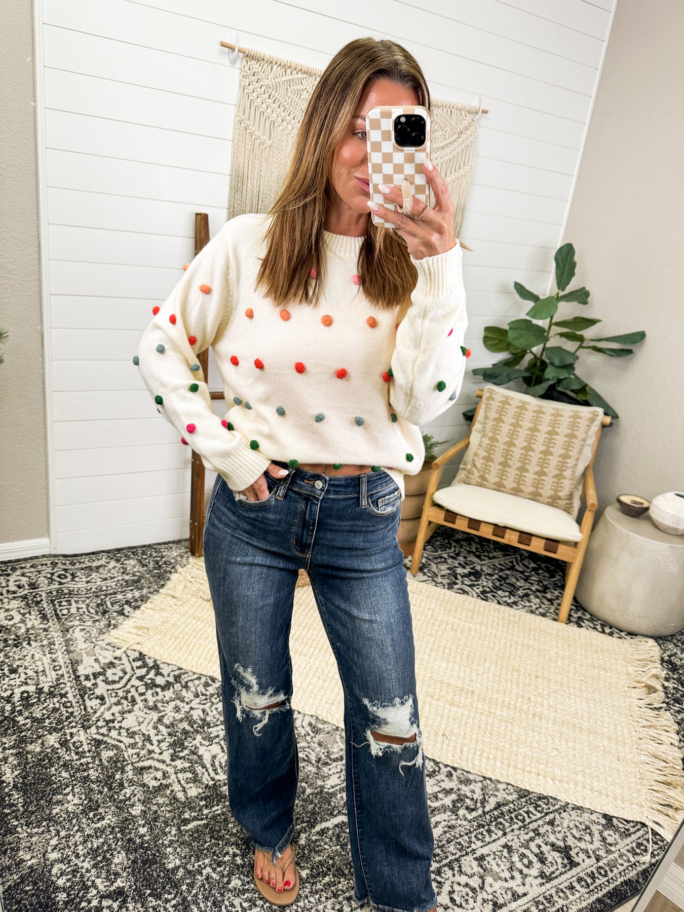 This Candy Buttons sweater features a cozy knit with rainbow-hued pom pom details for a unique look. The round neckline and long sleeves provide a comfortable fit, while ribbed hems complete the design. Cozy and stylish–all in one! The model is in the medium. Paired with Raina High Rise.