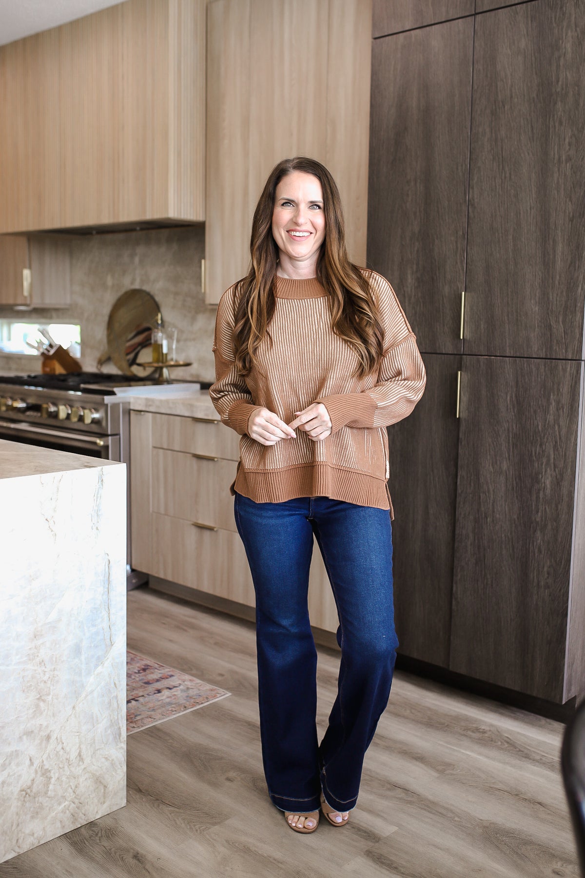 This stylish oversized pullover sweater features a luxurious ribbed knit construction in warm camel tones. Made from soft, comfortable fabric blend that provides excellent warmth and breathability. The relaxed fit design with dropped shoulders creates a modern, effortless silhouette perfect for casual everyday wear. The classic crew neckline and long sleeves offer versatile styling options for layering or wearing alone. Ideal for fall and winter seasons, this pullover combines comfort with contemporary fashion trends, making it a wardrobe essential for casual outings, work-from-home days, or cozy weekend activities.