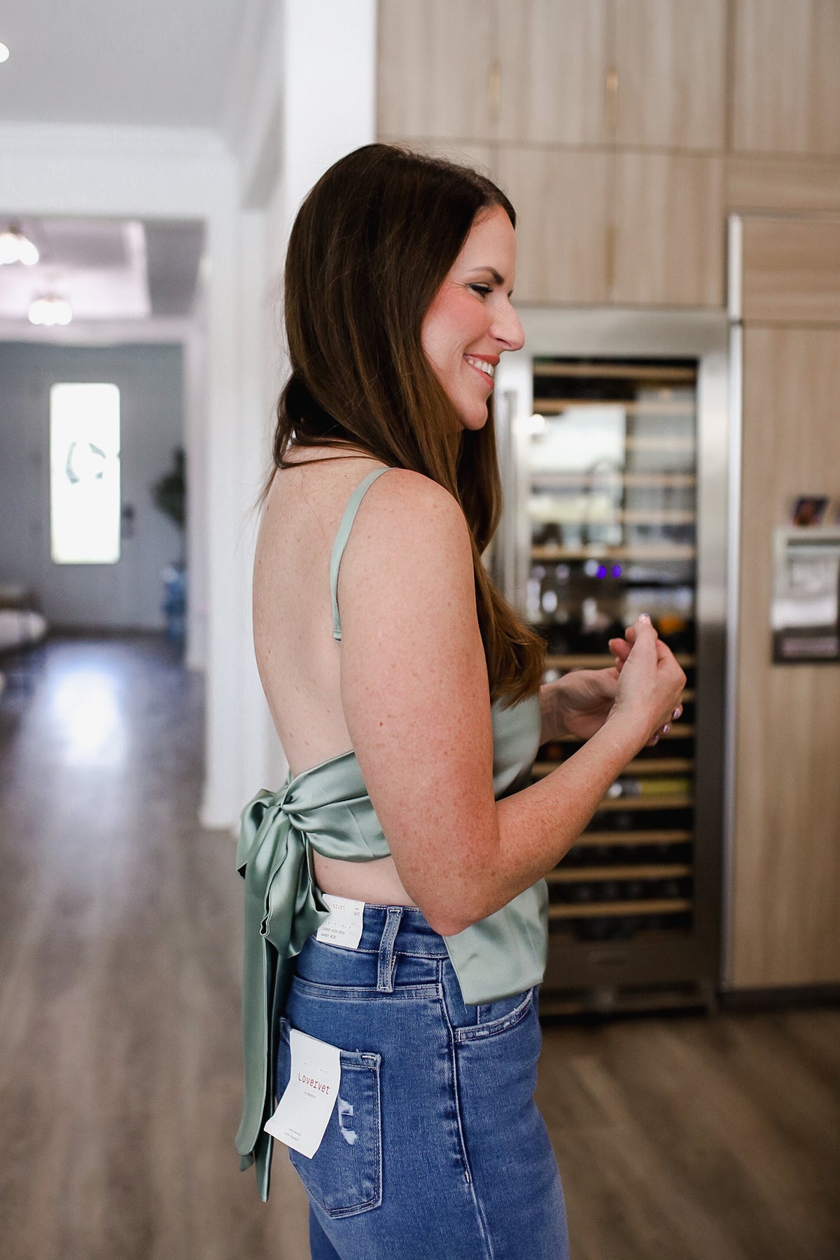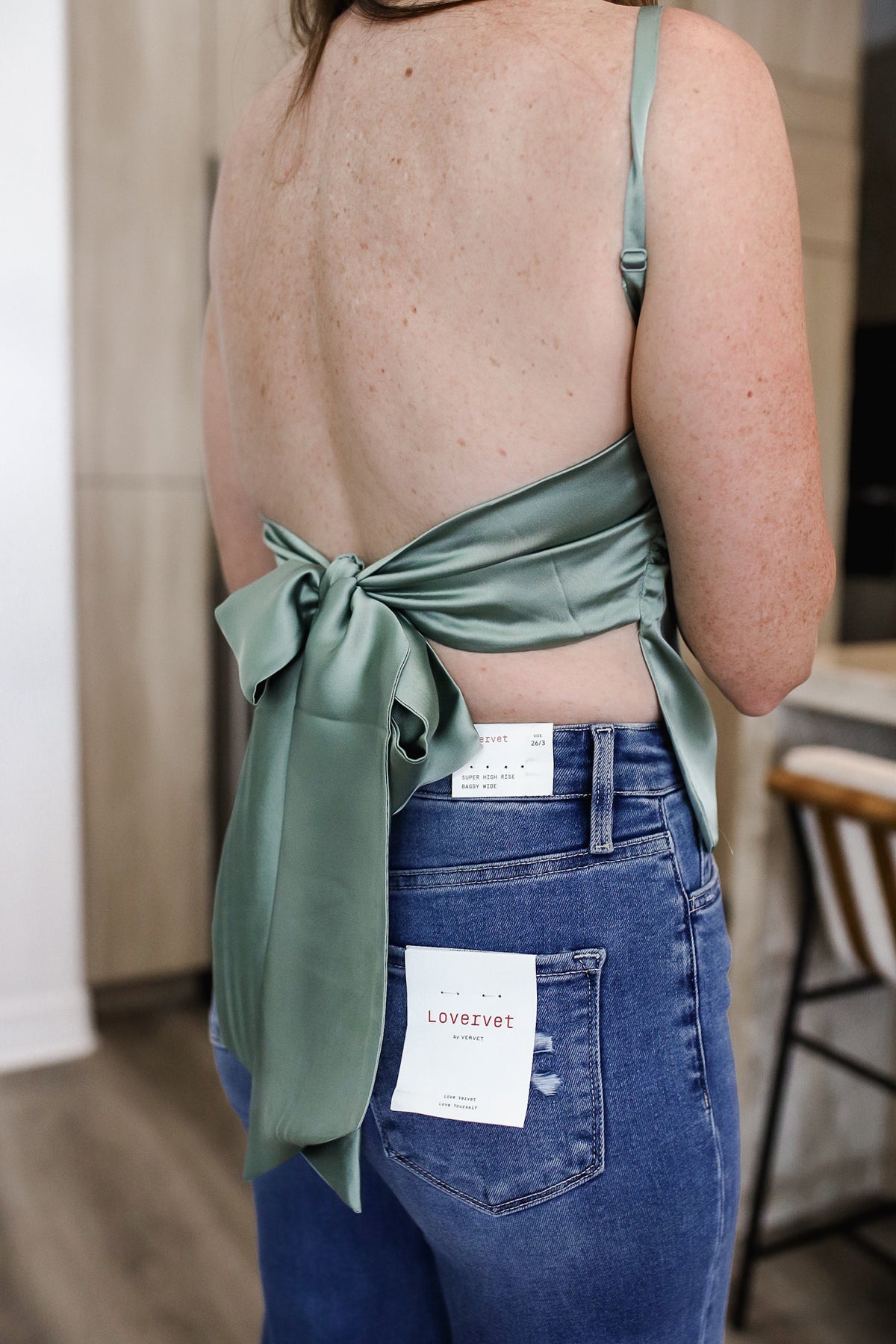 The satin back tie detail cami is a sophisticated and luxurious piece that adds a touch of elegance to your outfit. The satin fabric offers a silky and smooth texture, perfect for dressing up any look. The back tie detail adds a feminine and chic element, allowing you to adjust the fit to your liking. This cami is versatile and can be styled in various ways - wear it alone with jeans or dress it up with a blazer and trousers for a more formal look. The satin fabric and tie detail create a sleek and stylish ensemble that is perfect for both casual and dressier occasions.