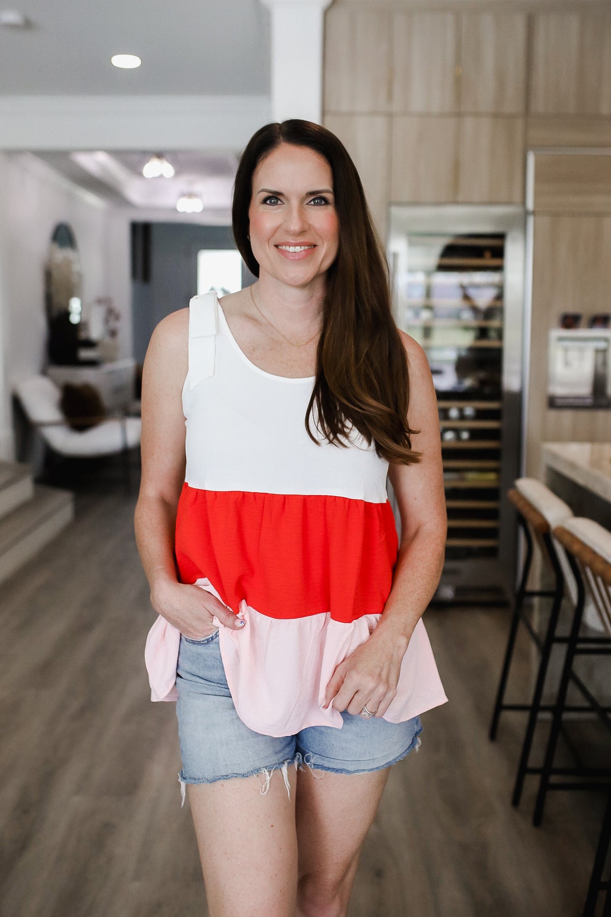 Stay on-trend with this color block sleeveless tie shoulder babydoll top. The color block design adds a modern and eye-catching element to the top. The tie shoulder detailing offers a playful and adjustable touch. The babydoll silhouette is flattering and comfortable for all-day wear. Pair with shorts or jeans for a cute and stylish outfit. Embrace a chic and fun style with this versatile and trendy top.