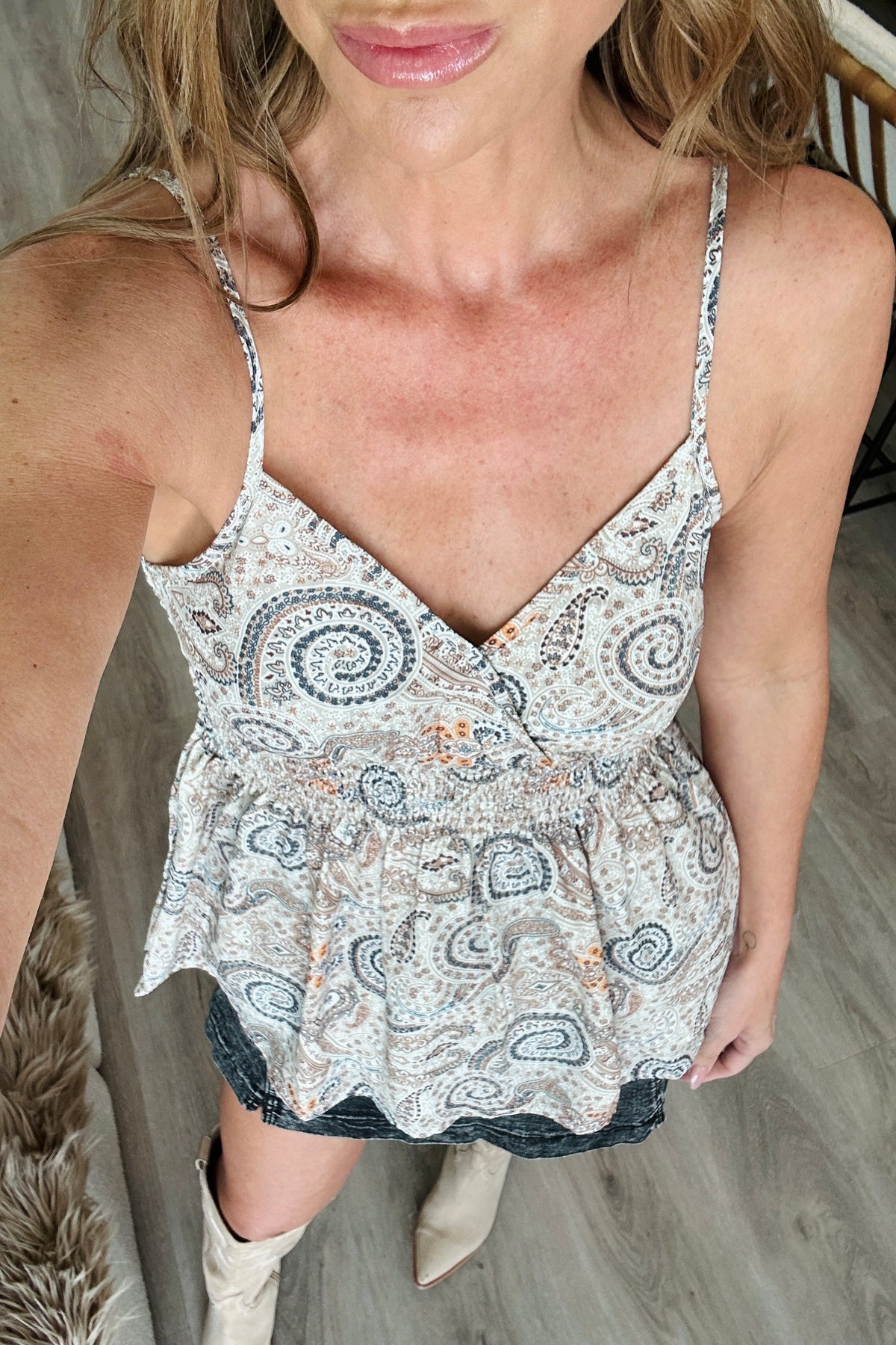 Embrace a boho-chic vibe with our Paisley Printed Smocked Babydoll Cami. This breezy, sleeveless top features a flattering smocked bodice that hugs your curves, flowing into a relaxed, babydoll silhouette for a carefree, feminine look. The vibrant paisley print adds a touch of vintage charm, making it the perfect addition to your warm-weather wardrobe. Pair it with denim shorts, skirts, or your favorite summer trousers for a versatile piece that’s ideal for everything from beach days to casual outings. The model is in the small.