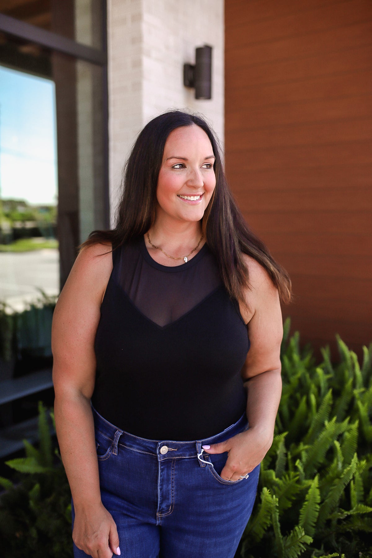 Get ready to feel the love with our Miss You Much Mesh V-Neck Bodysuit. Made with high stretch jersey knit, this bodysuit hugs your curves and provides ultimate comfort. Perfect for date nights, girls' night out, or just lounging at home. Say goodbye to boring outfits and hello to fun!