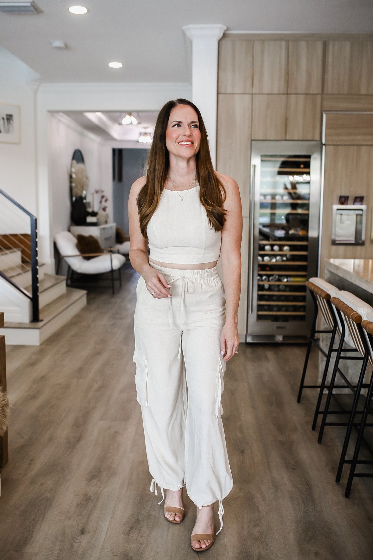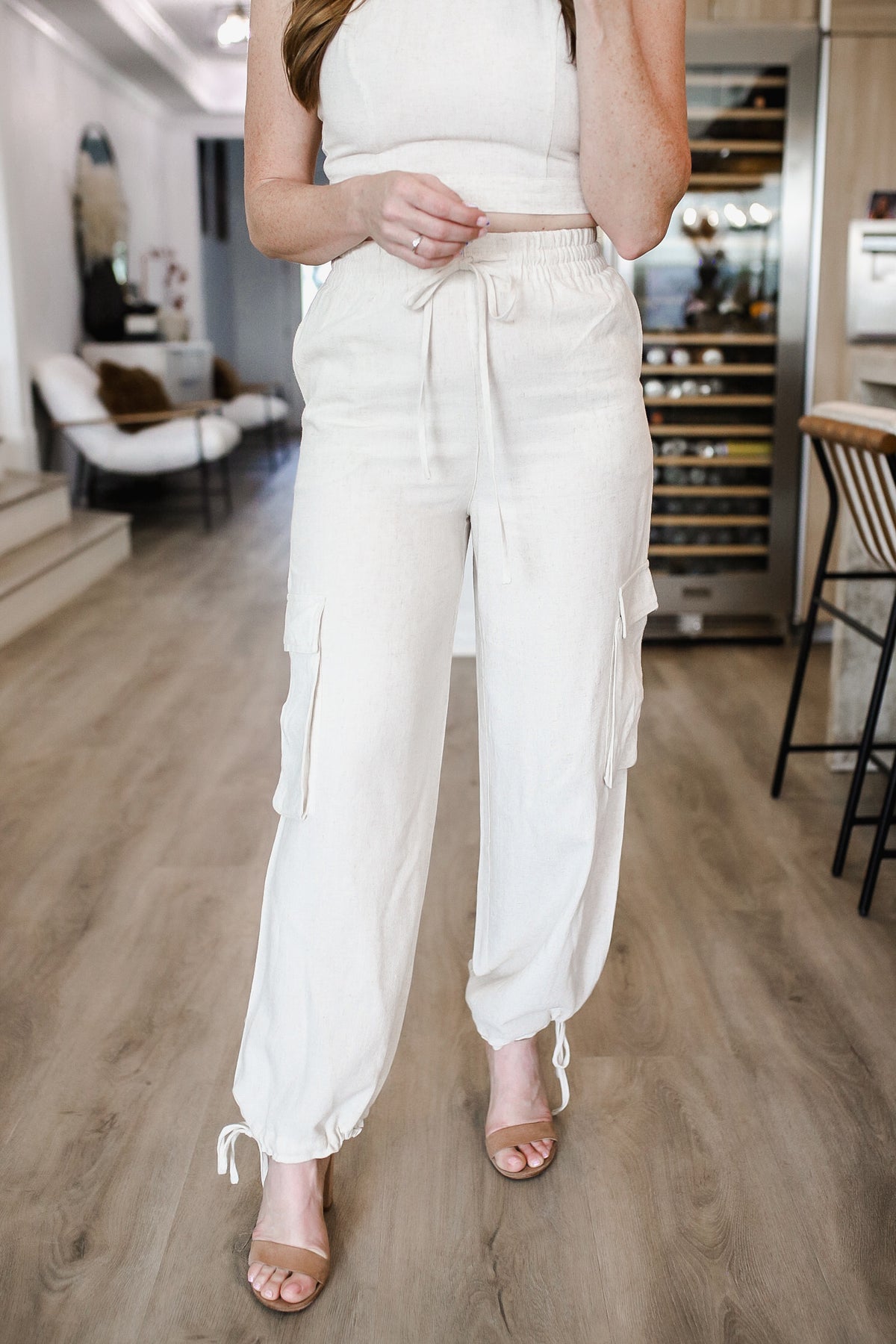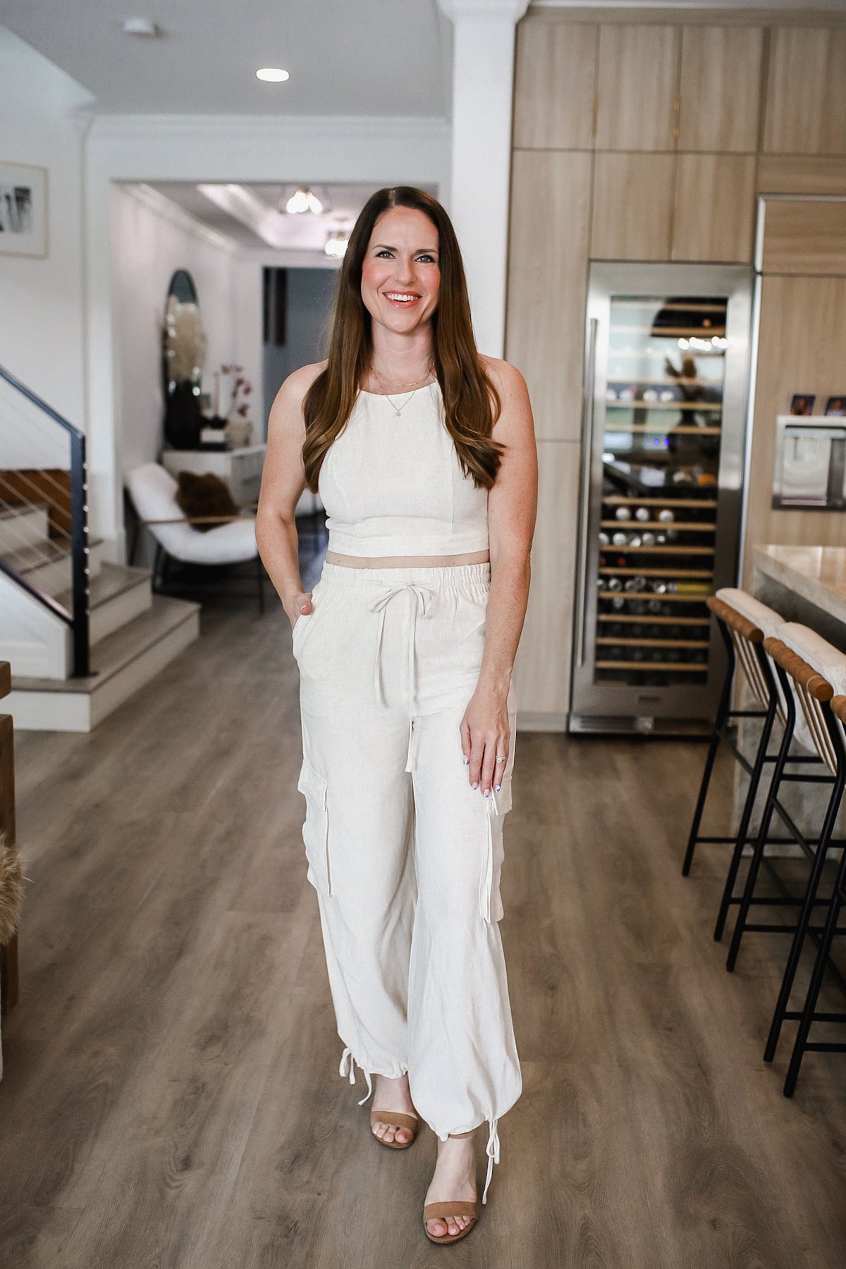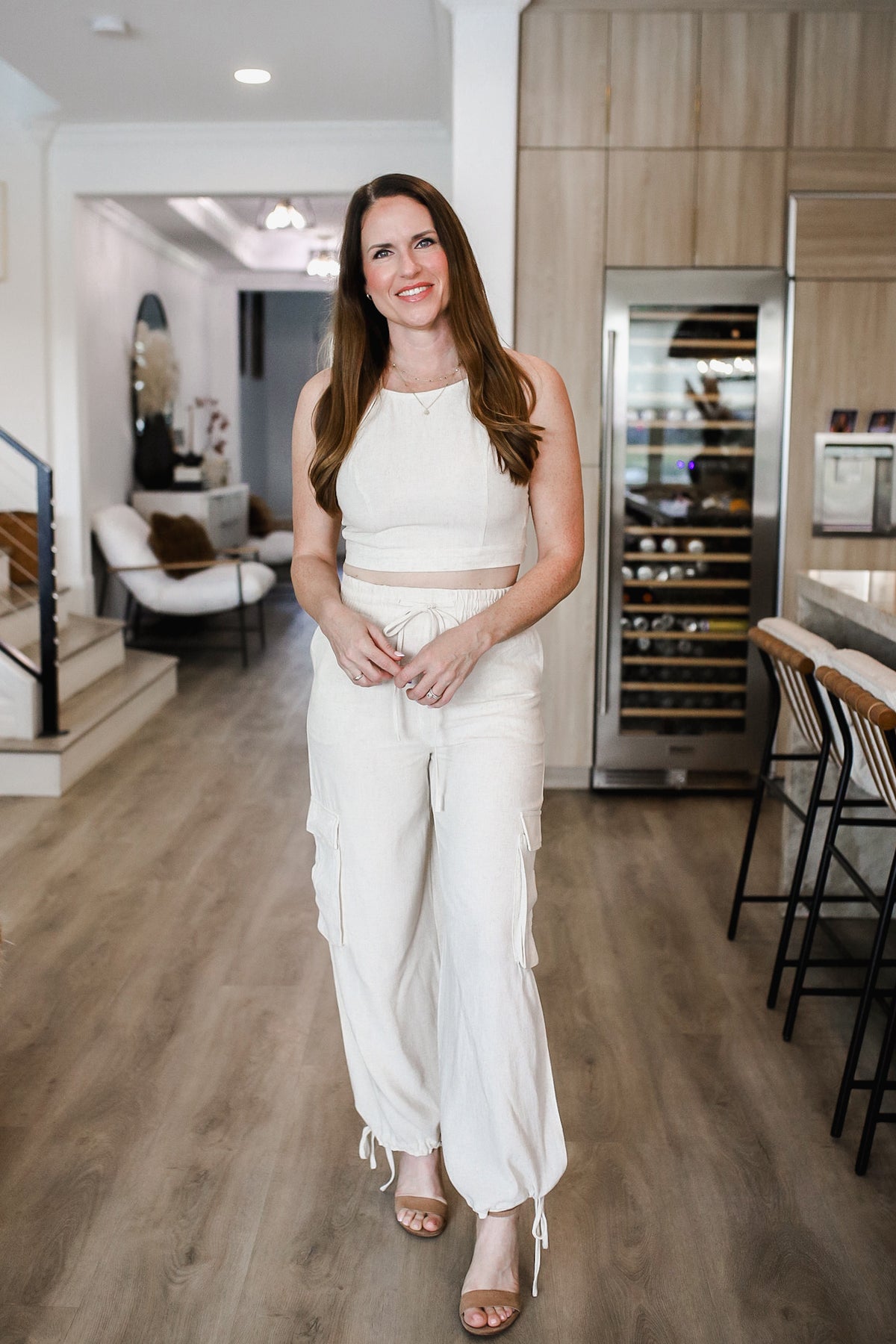 The crop top and cargo pants set is a trendy and versatile outfit option. The crop top adds a touch of style and flair, while the cargo pants offer a casual and utilitarian vibe. This set is perfect for creating a coordinated and trendy look that is both comfortable and fashion-forward.